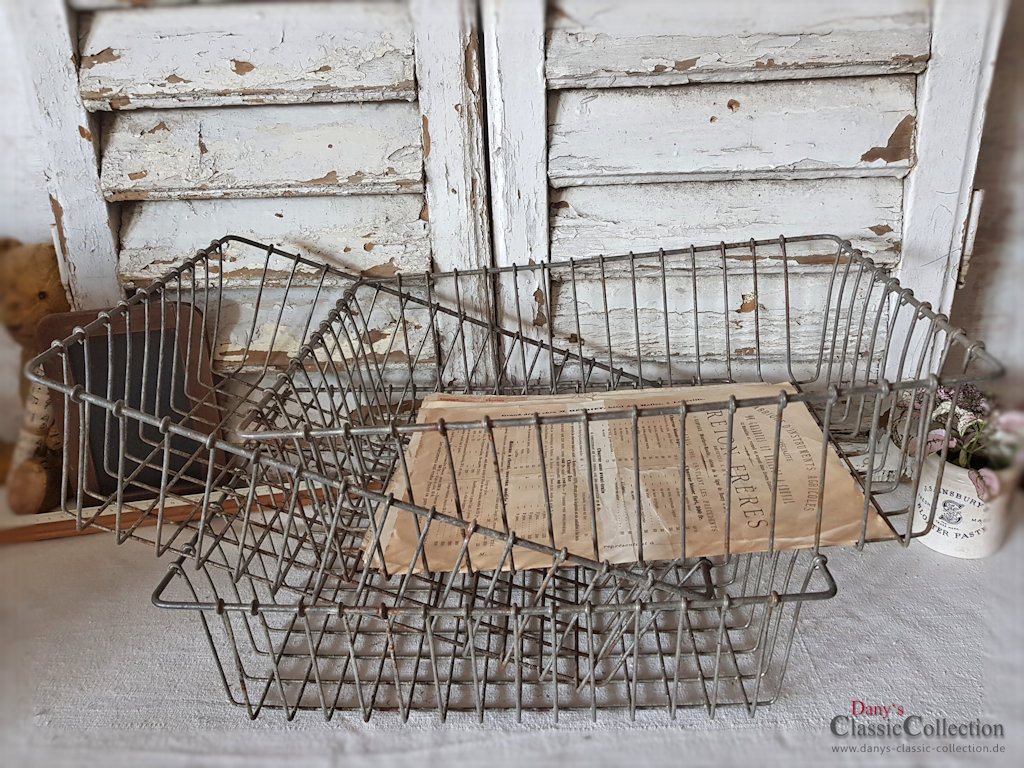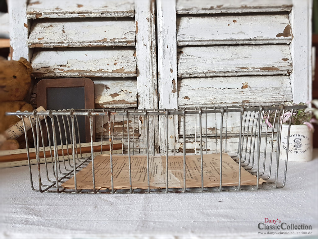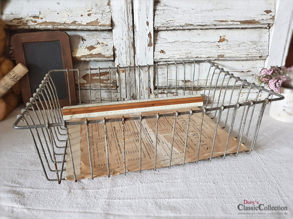 Toller alter Ablagekorb aus sehr stabilem Draht. Er eignet sich hervorragend zur Ablage von Dokumenten im Büro, Zeitschriften im Wohnzimmer oder Handtüchern in der Vintage-Küche.