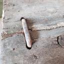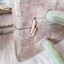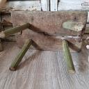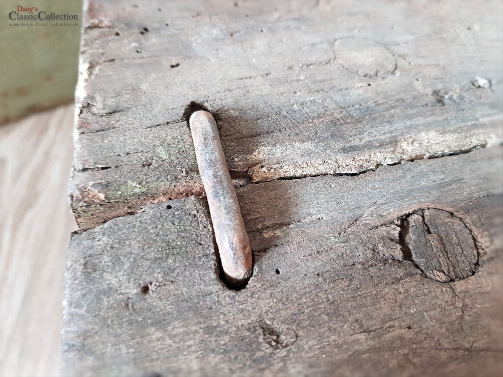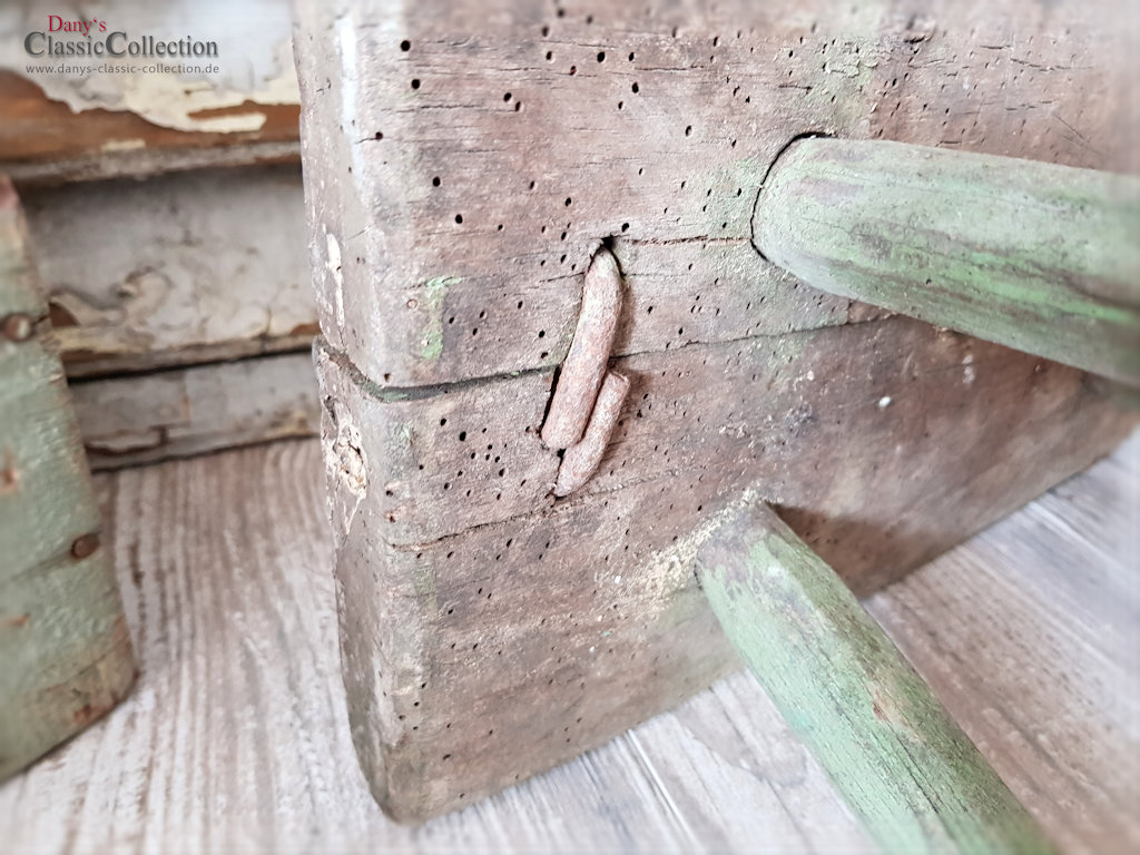 Die Sitzfläche dieses kleinen Schemels hier ist seitlich mit dicken Klammern fixiert. Ein wirklich uriges Stück für ein Cottage, Landhaus oder eine Berghütte. Was ihn zudem noch besonders charmant macht, sind seine original grünen Beine.