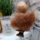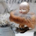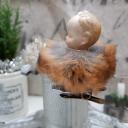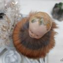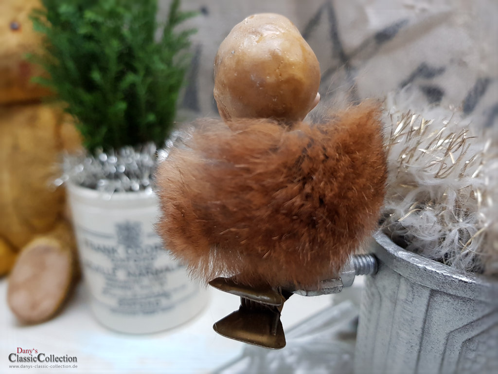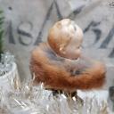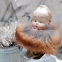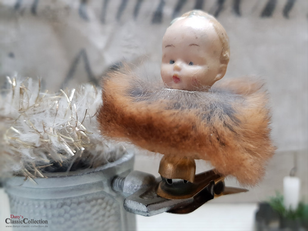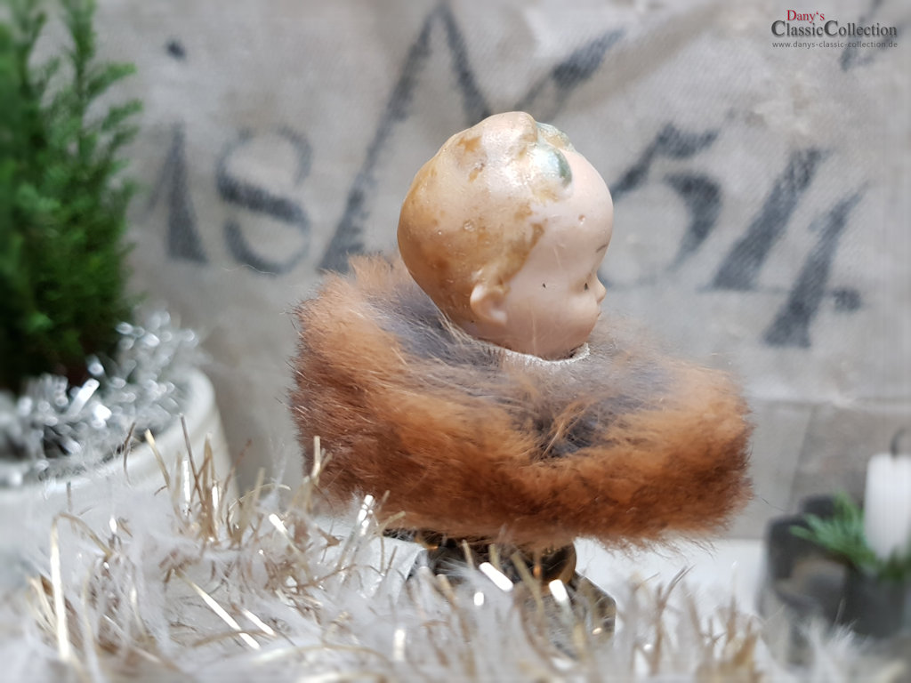 Zauberhafter alter Biskuitporzellankopf, Baby mit Schleifchen und Pelzkragen auf einem Kerzenhalterclip.