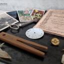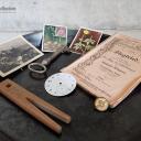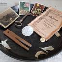 Hübsches SET verschiedener dekorativer Vintage-Kleinteile versammelt auf einem alten Backblech. Das Bundle beinhaltet das Blech (ca. Ø 26,5 cm), einen Skelettschlüssel (ca. 10,5 cm), ein emailliertes Zifferblatt (ca. 4,3 cm), einen spanischen Uniformknopf mit einer Krone drauf, zwei alte Sparkassen-Sammelbildchen, eine Sepia-Landschaftsaufnahme, eine hölzerne Wäscheklammer (ca. 10,5 cm) und ein Reclam-Büchlein (ca. 14,5 x 9,7 cm).