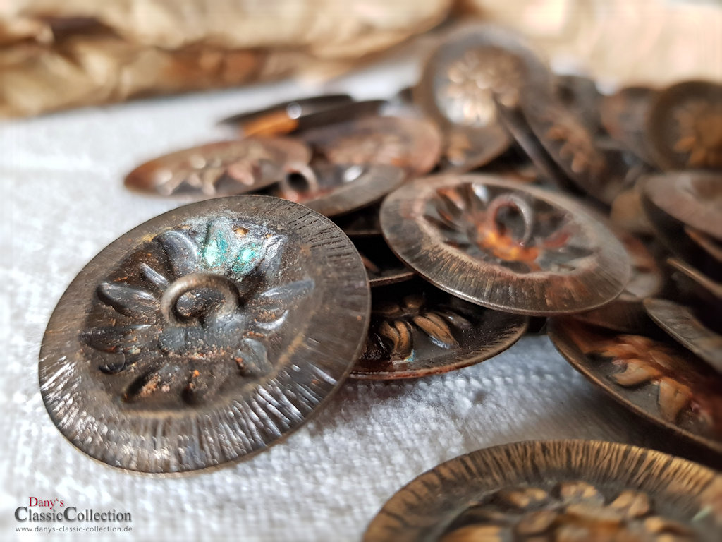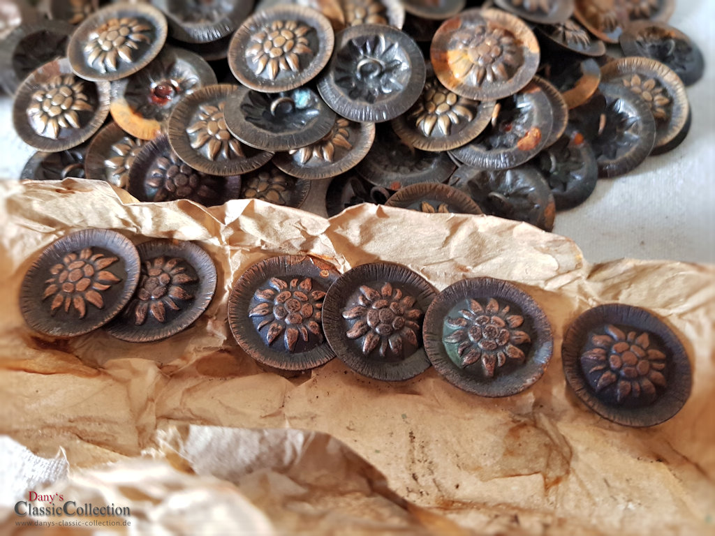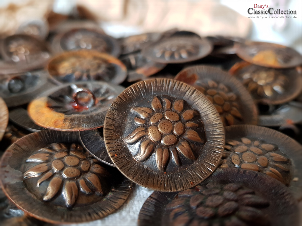 Schöne alte Trachtenknöpfe, die ein Edelweiss zieren. Teilweise haben sie Flugrost, der vermutlich entfernt werden kann. Andere sind wieder in fast neuwertigem Zustand.