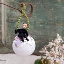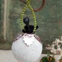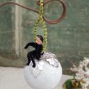 Schornsteinfeger aus schwarzer Chenille mit Massekopf auf einer beglimmerten Wattekugel.