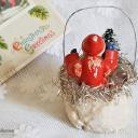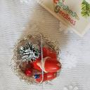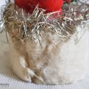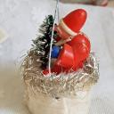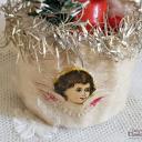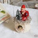 Es handelt sich um eine Erzgebirgefigur, die mit einem Tannenbaum in einem Wattekörbchen sitzt, welches mit goldenen Tinsel und einer Engelgesicht-Oblate auf der Vorderseite verziert ist.