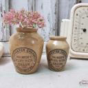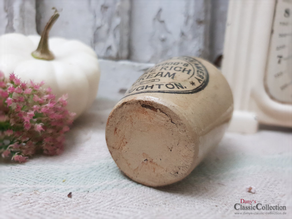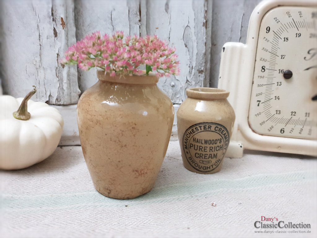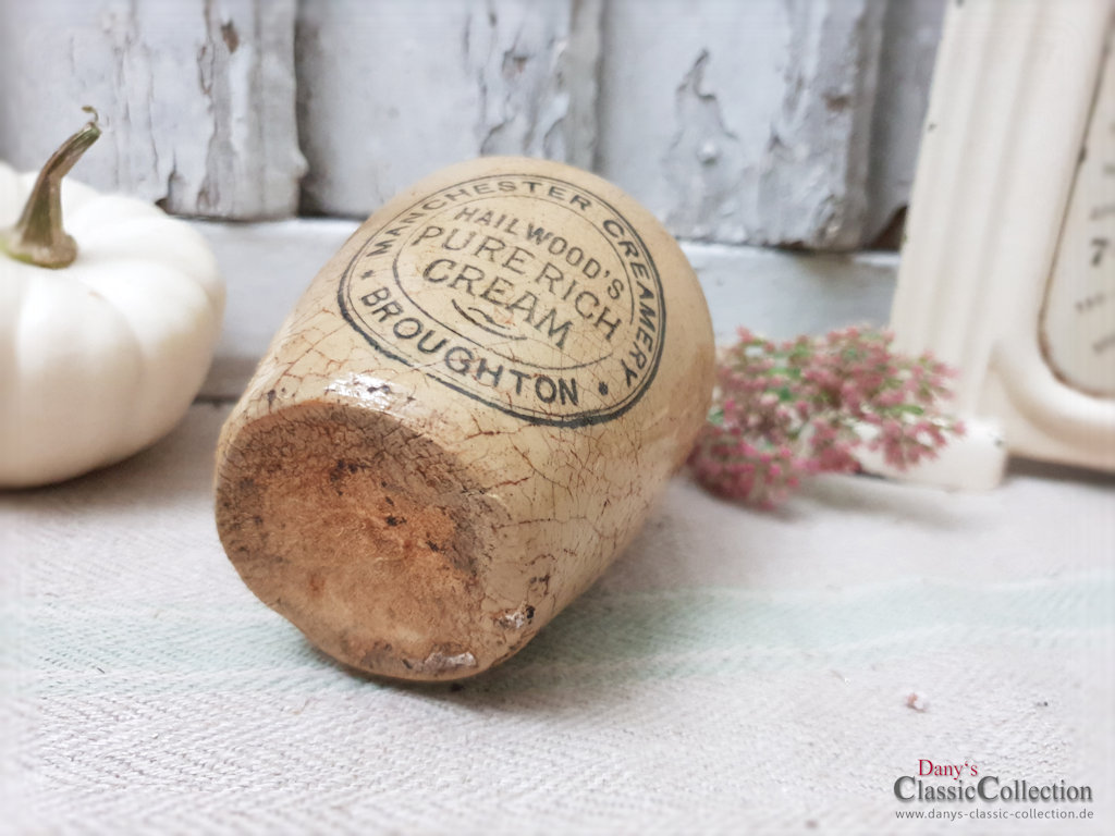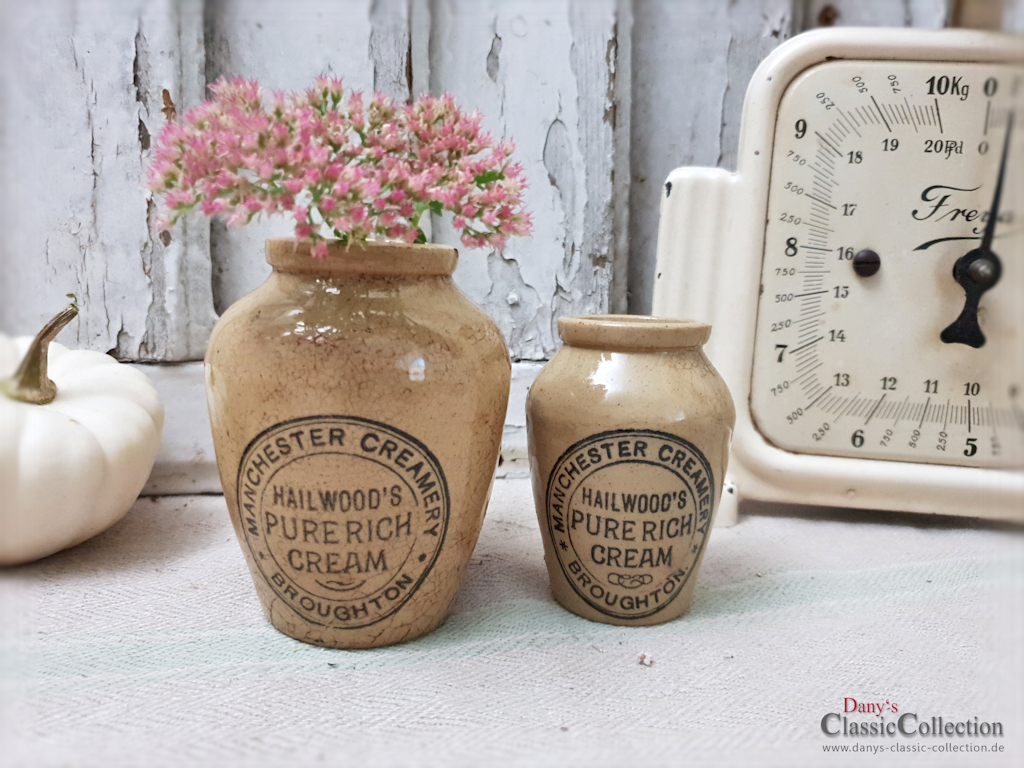 Zauberhaftes SET uralter Steingut Pöttchen aus dem England um 1900 mit schöner Aufschrift: Hailwoods Pure Rich Cream ~ Manchester Creamery ~ Broughton