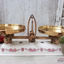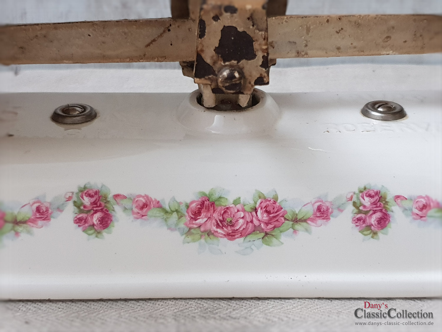 Wunderschöne creme weiße Küchenwaage aus Gusseisen mit Porzellankörper und zauberhaftem Rosendekor der Fa. Krups.
