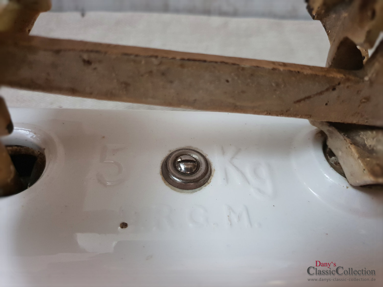 Die Waage ist gemarkt mit "KRUPS ROBERVAL" auf der einen Seite und "5KG D.R.G.M" auf der anderen Seite.