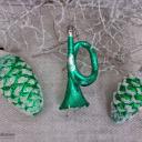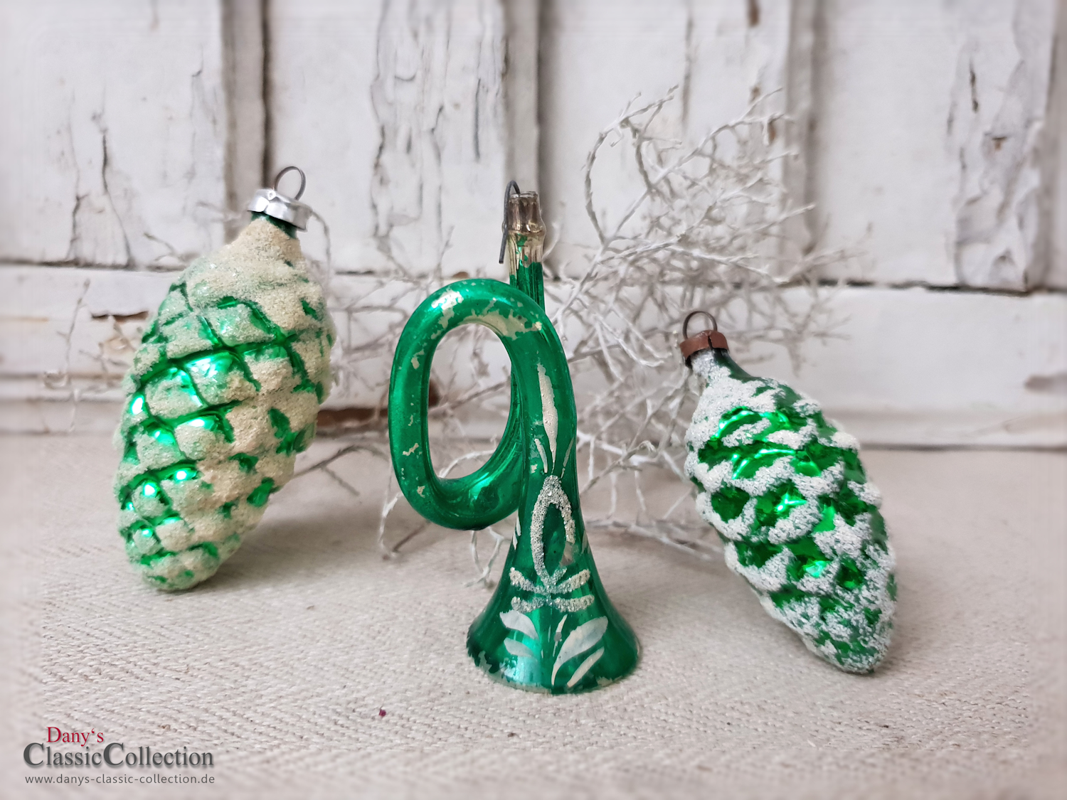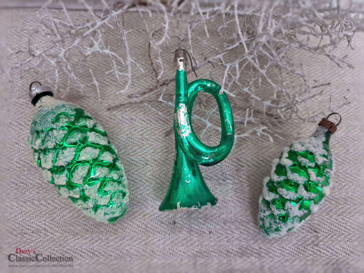 Es handelt sich um 2 unterschiedlich große Zapfen mit Schnee und eine Trompete mit Bemalung.