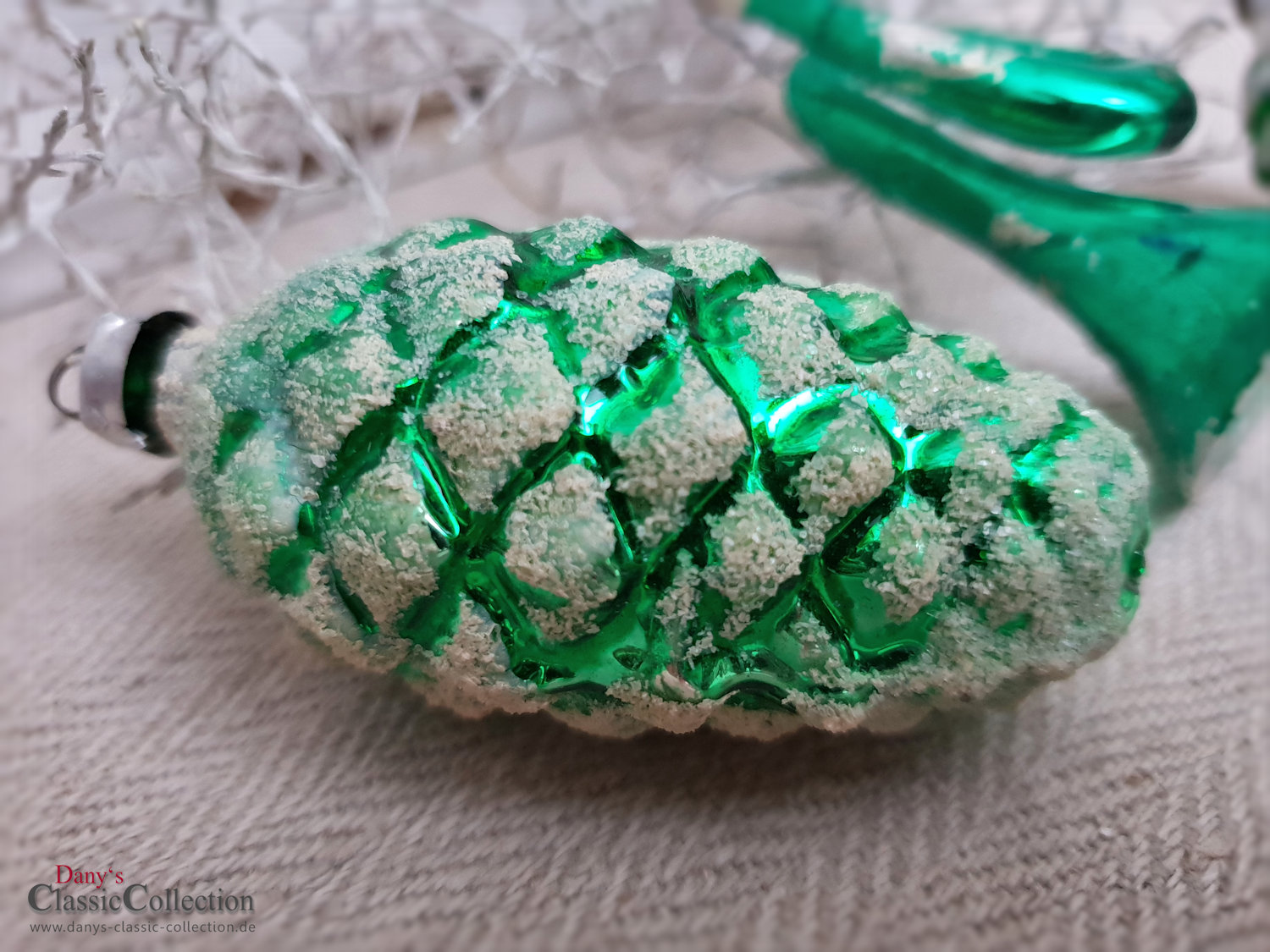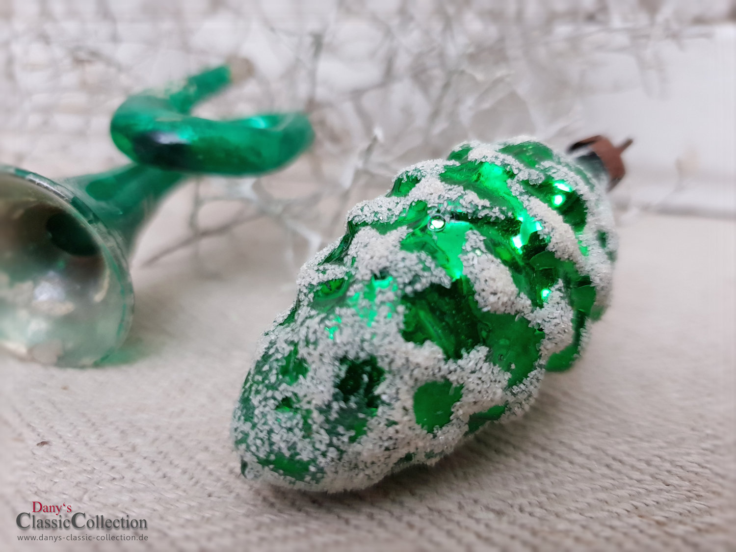 Dieser alte grüne Christbaumschmuck aus feinstem Glas ist trotz seines beachtlichen Alters in einem ziemlich guten Zustand.