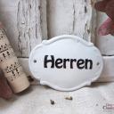 Dekoratives Türschild aus weißem Porzellan mit schwarzer Schrift "Herren". Das Schild ist leicht gewölbt.