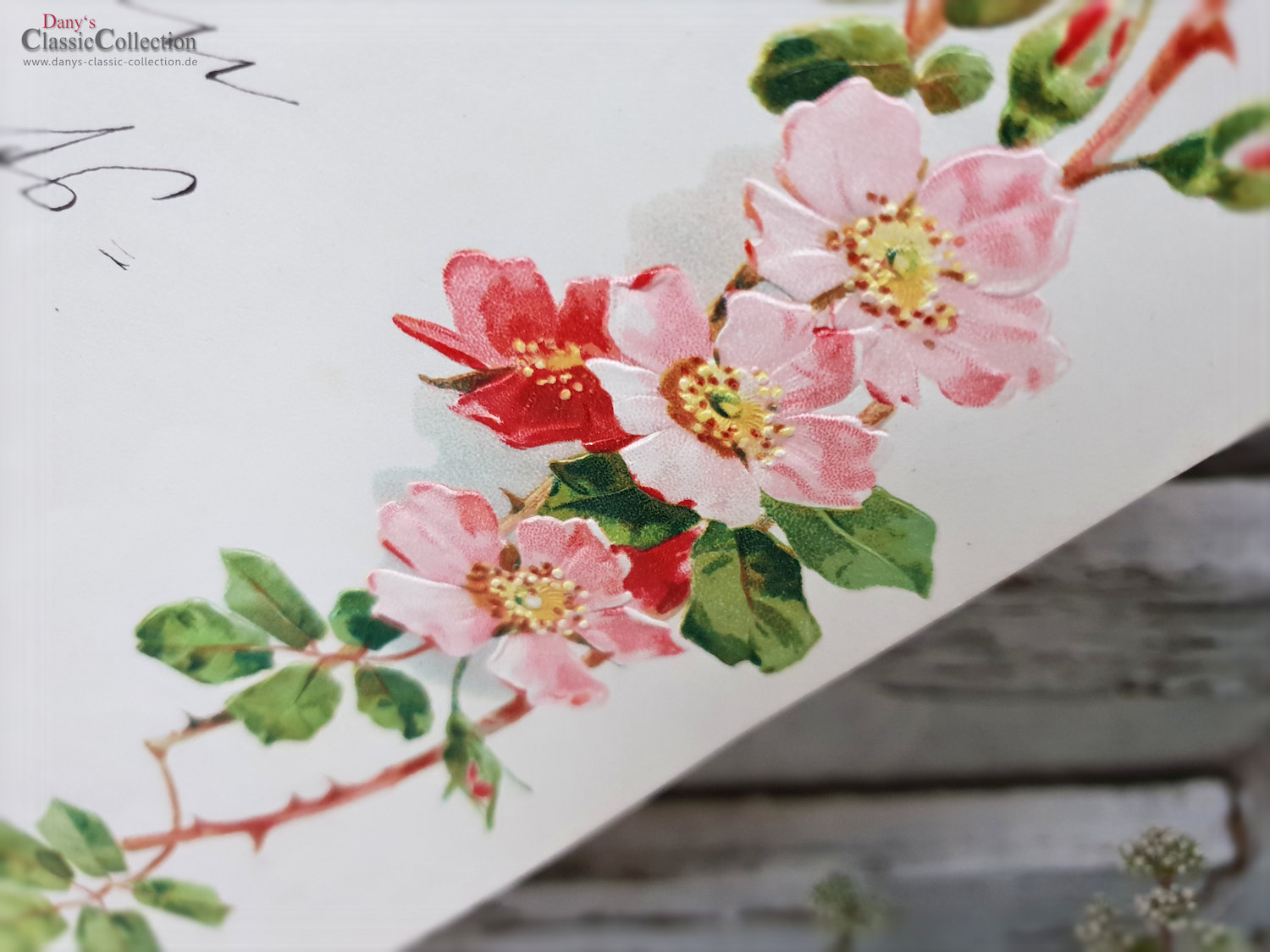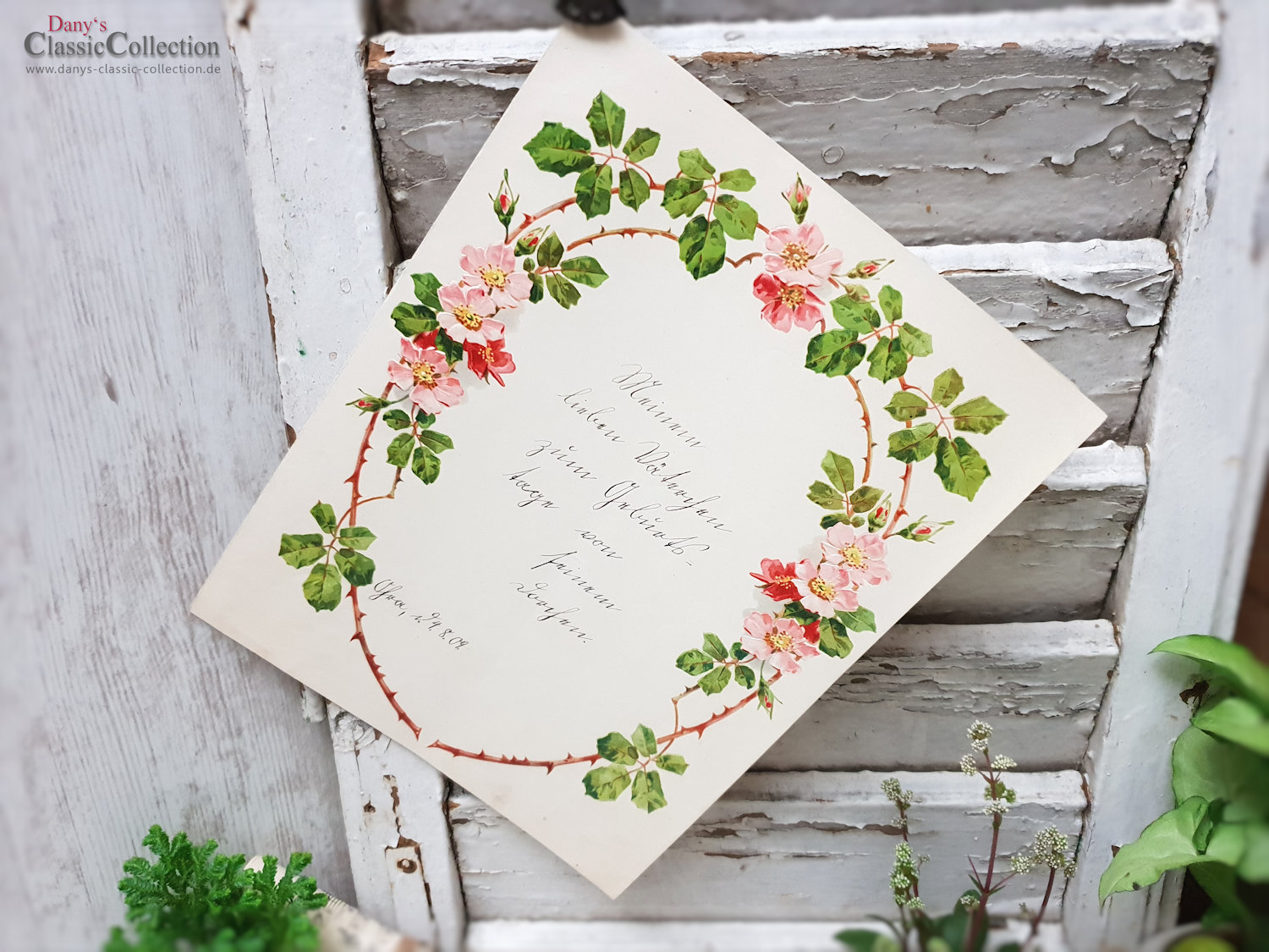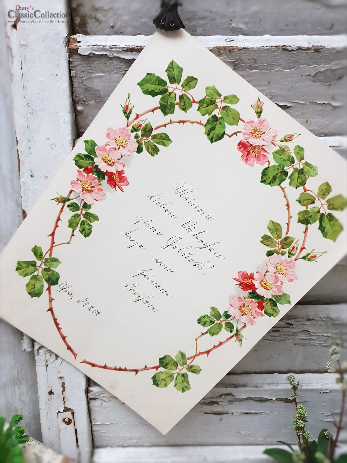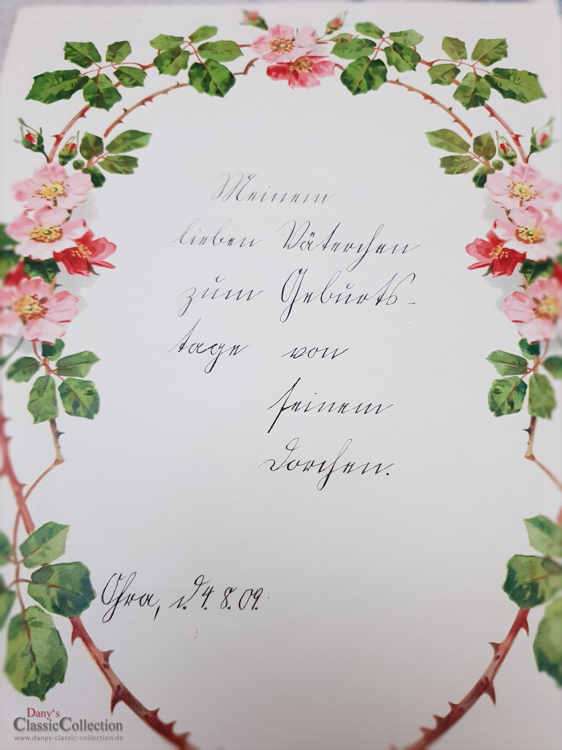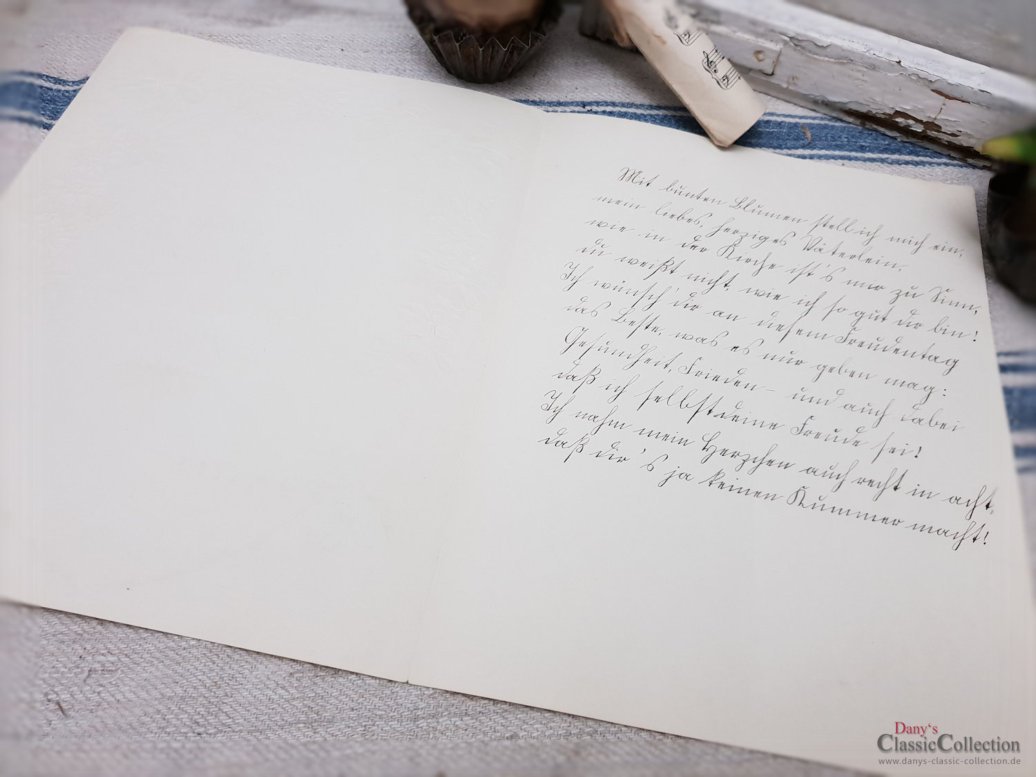 Antiker Schmuckbrief, zauberhaft geprägt und lithografiert.Es ist ein Geburtstagsgruß einer Tochter an ihren Vater aus dem Sommer 1909.Maße:ca. 27,5 x 21,5 cm