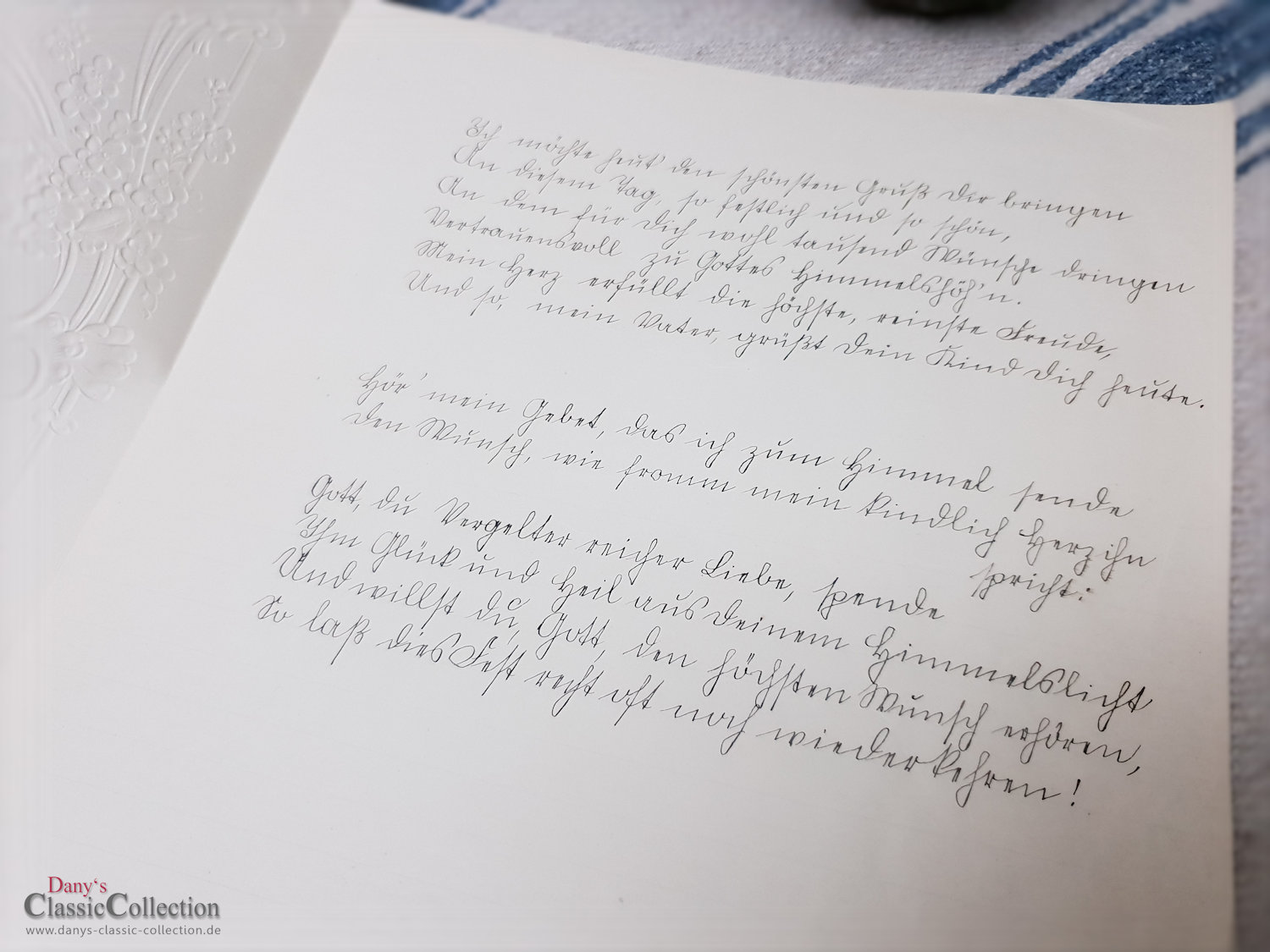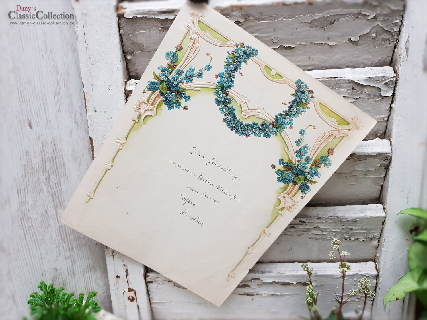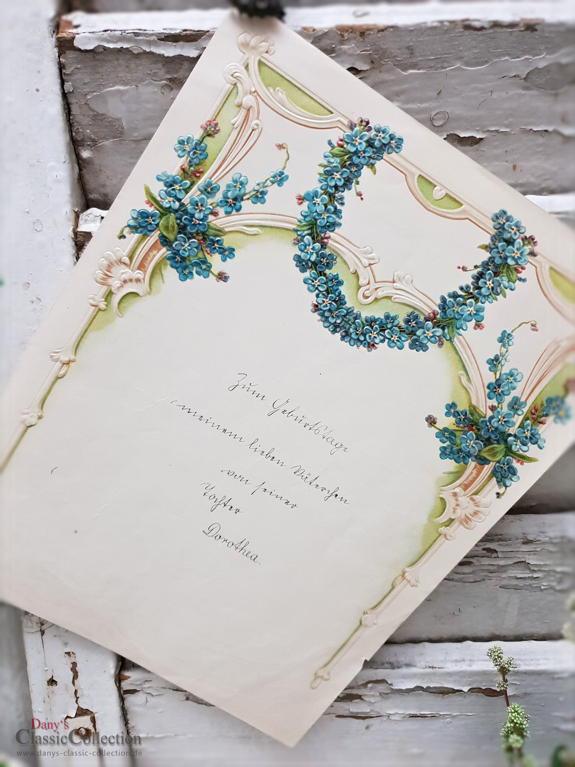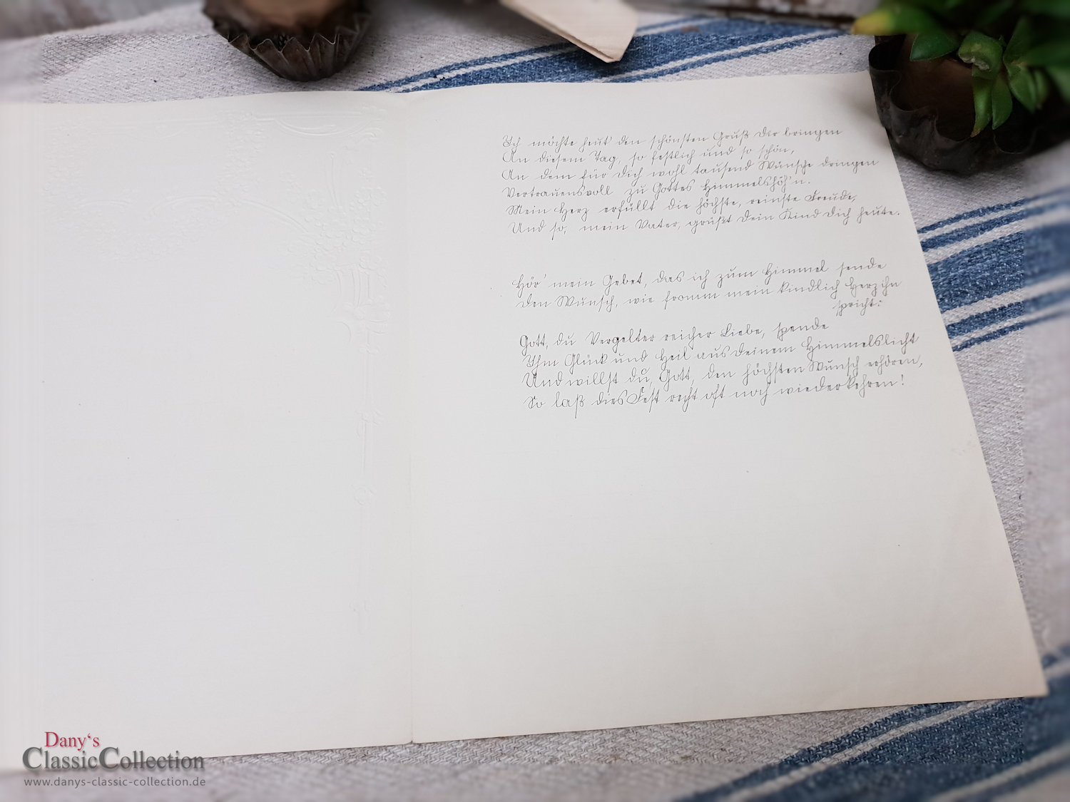 Antiker Schmuckbrief, zauberhaft geprägt und lithografiert.Es ist ein Geburtstagsgruß einer Tochter an ihren Vater, leider diesmal ohne Jahresangabe.Maße:ca. 27,5 x 21,5 cm