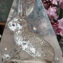 Es ist ein sitzender Hase, der mit seinen Vorderpfoten auf einem Korb steht, wunderbar detailliert gearbeitet.