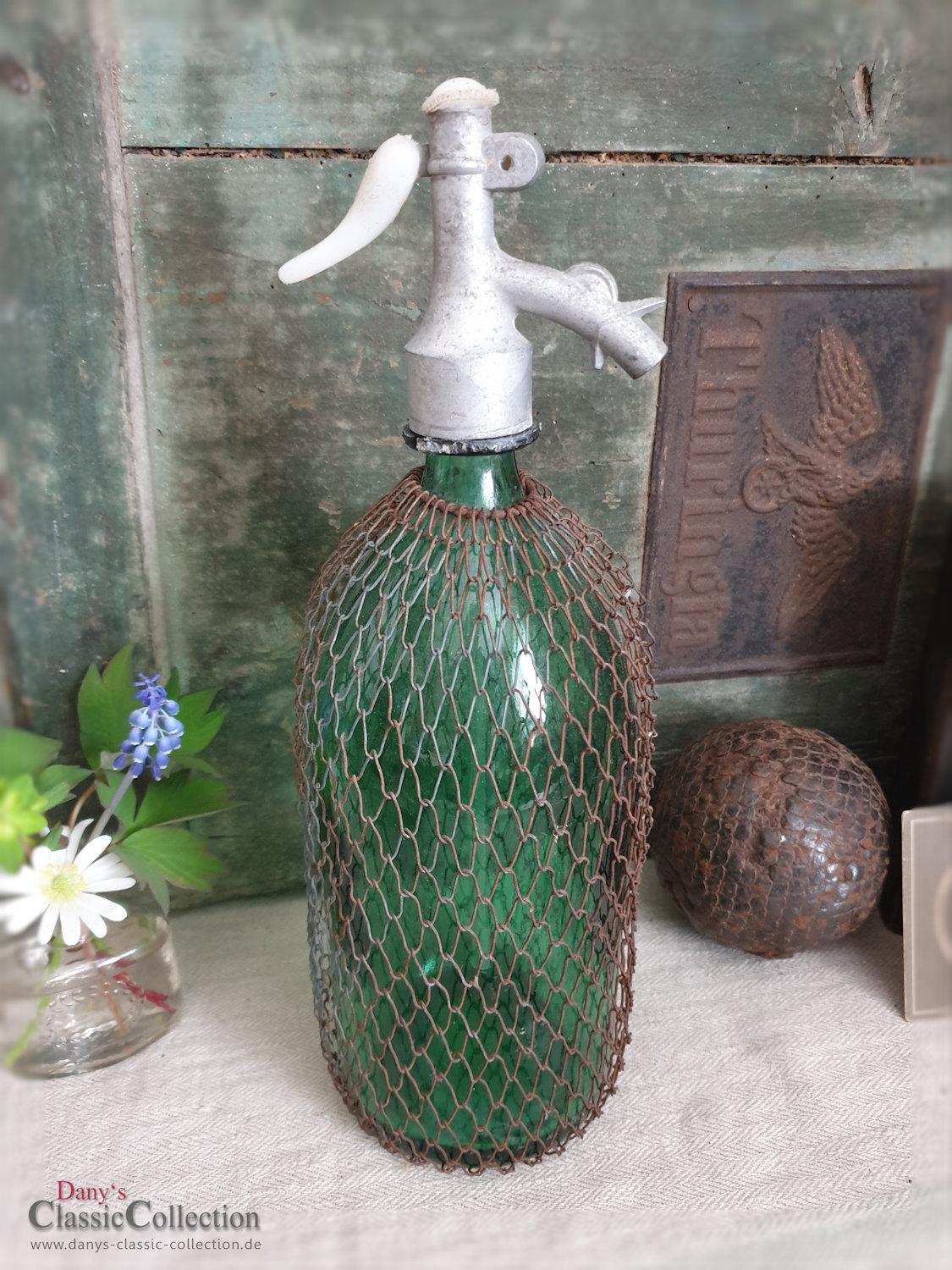 VERKAUFT ! Grüner Siphon mit Netz ~ große alte Sodaflasche ~ Soda Syphon ~ Shabby deco ~ Vintage interior ~ Brocante home style ~ hx4187f2