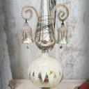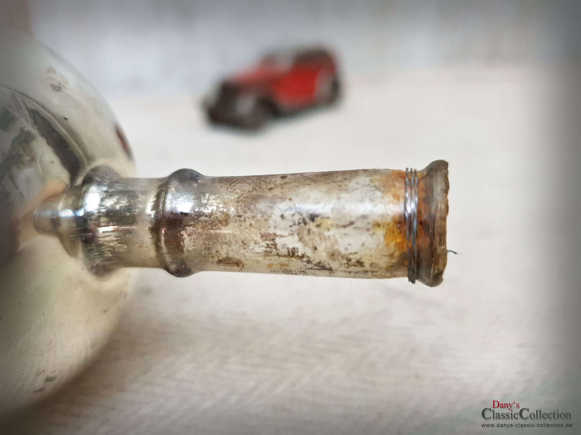 Die Kugel ist mit feinem Bouillondraht umwickelt, die Aufhänger sind aus "heller" Chenille und sie besitzt auch noch ihren Tinselschweif.