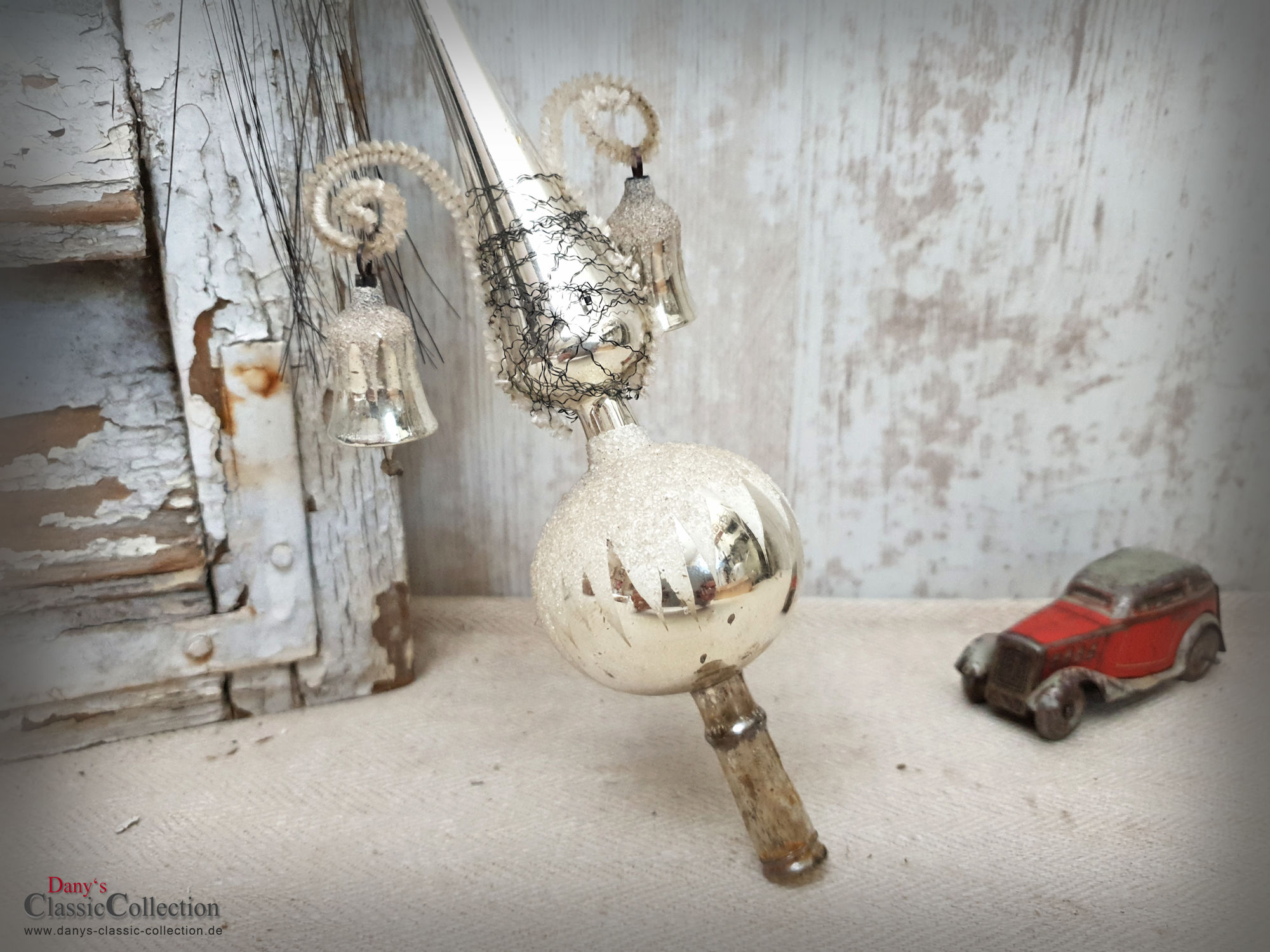 Zauberhafte alte Christbaumspitze aus feinsten Glas mit 2 Glöckchen und Schneebemalung in Original Box.