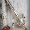 Die Kugel ist mit feinem Bouillondraht umwickelt, die Aufhänger sind aus weißer Chenille und sie besitzt auch noch ihren Tinselschweif.
