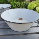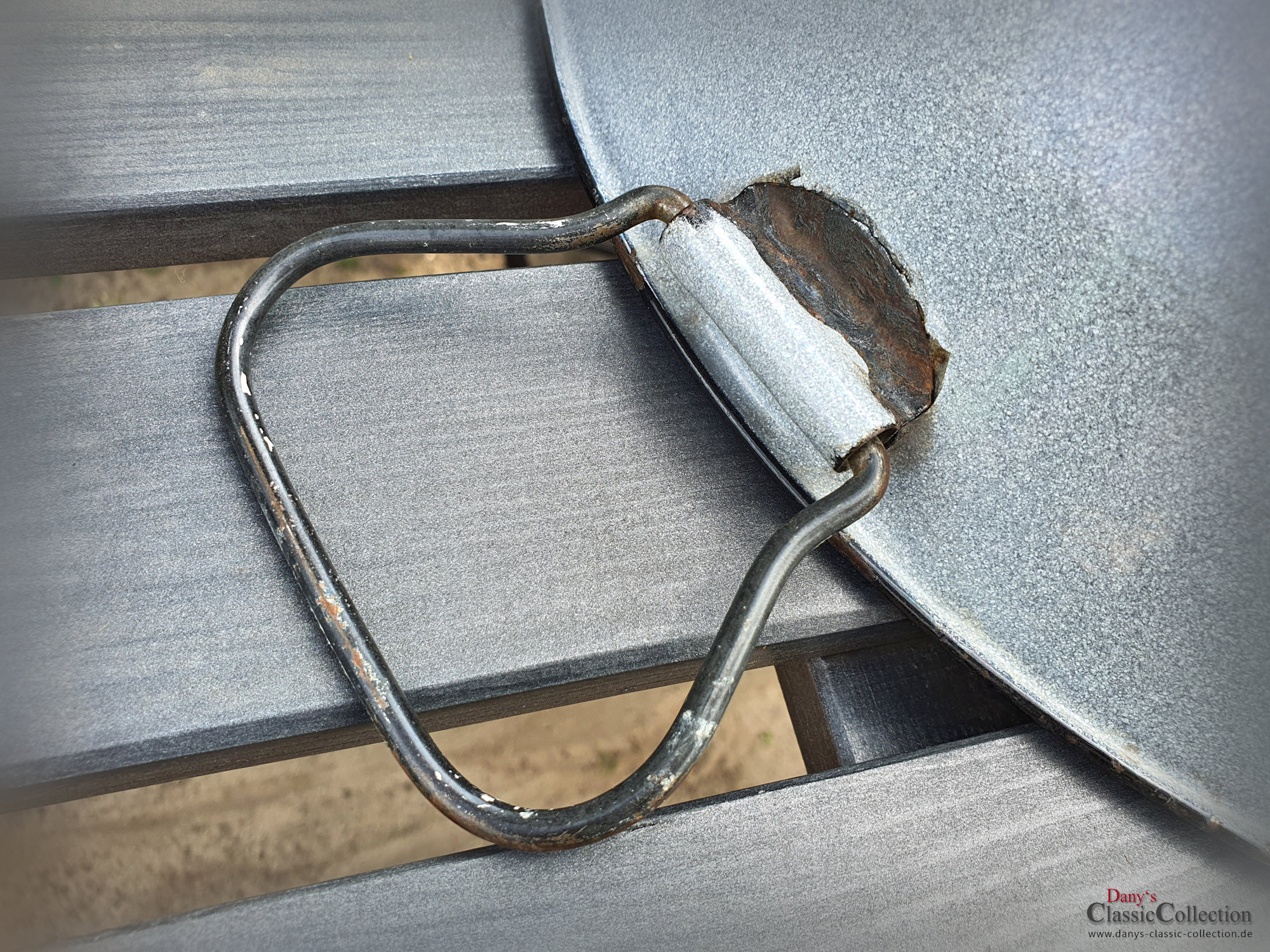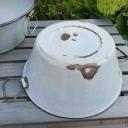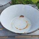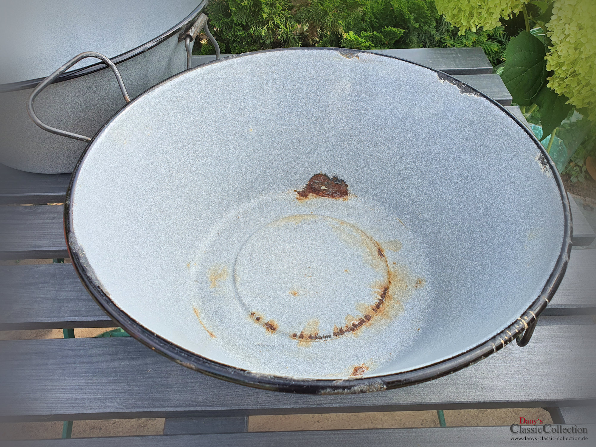 Die Schüssel hat einige Abplatzer in der Emaille und auch rostige Stellen.