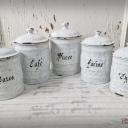Sie stammen aus Frankreich und haben daher französische Aufschrift: Sucre (Zucker), Café (Kaffee), Farine (Mehl), Pates (Nudeln) und Thé (Tee)