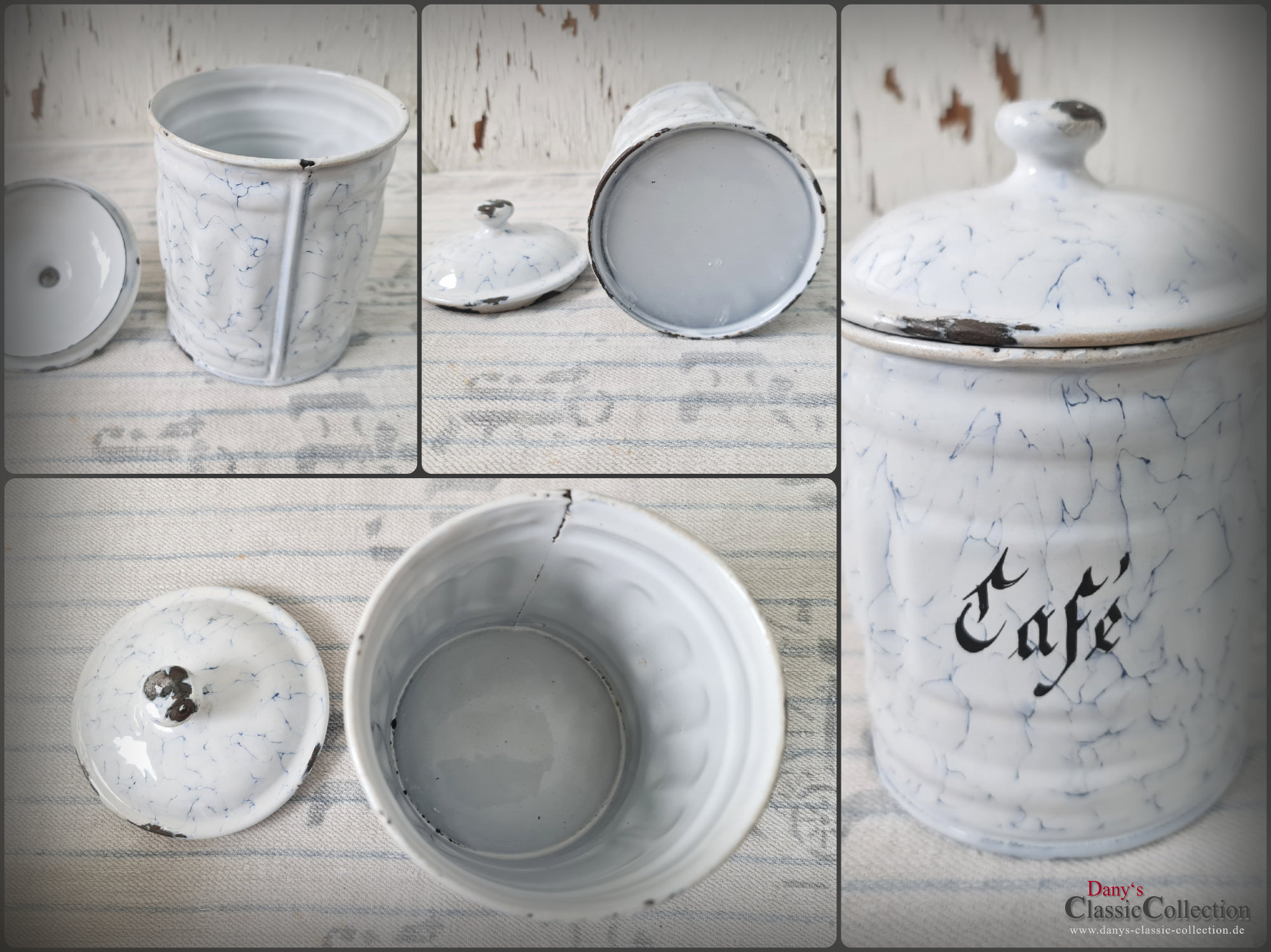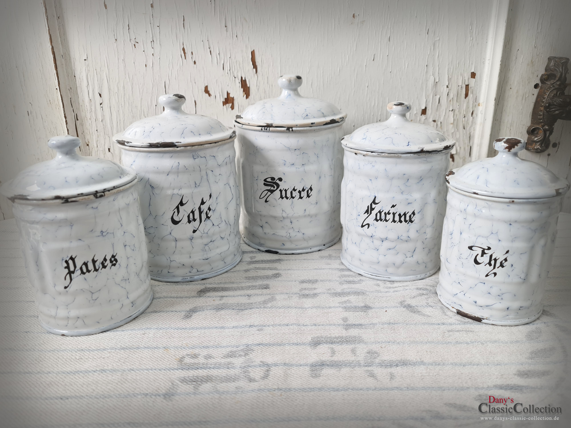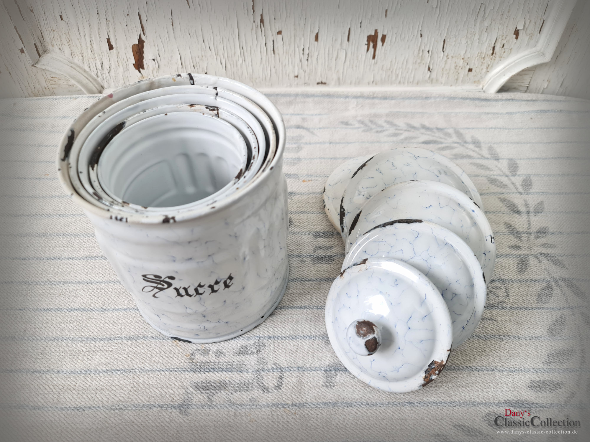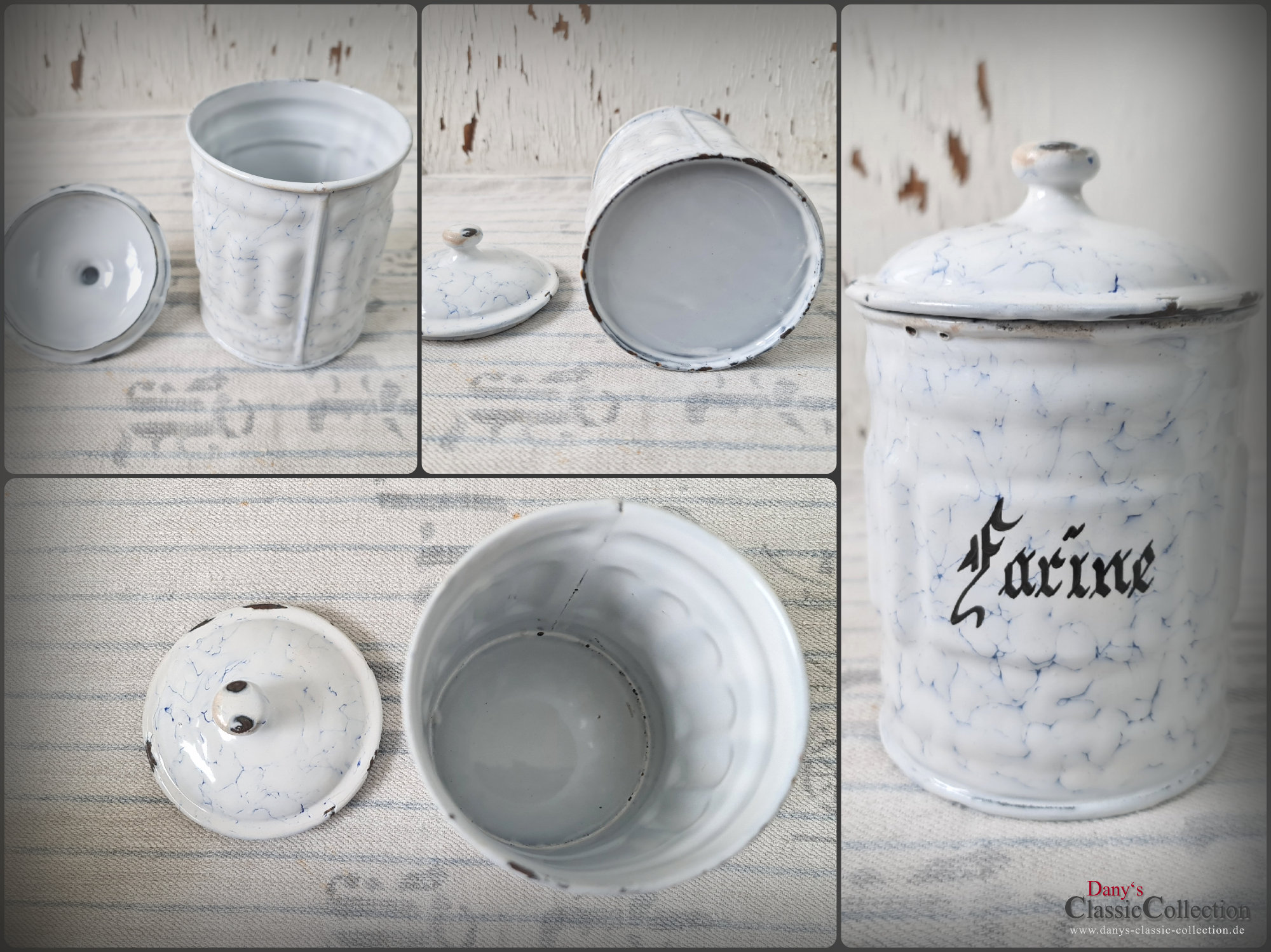 Praktische und sehr dekorative alte Vorratsdosen aus weißer Emaille, blau geädert - sogenanntem Wabenmuster.