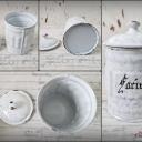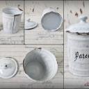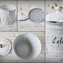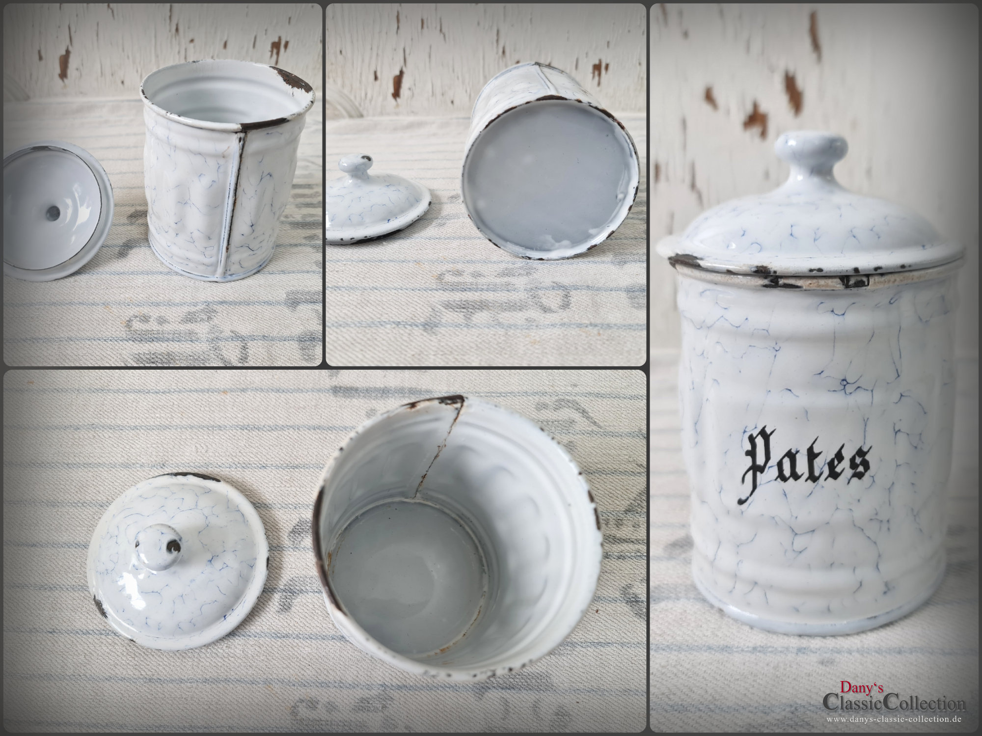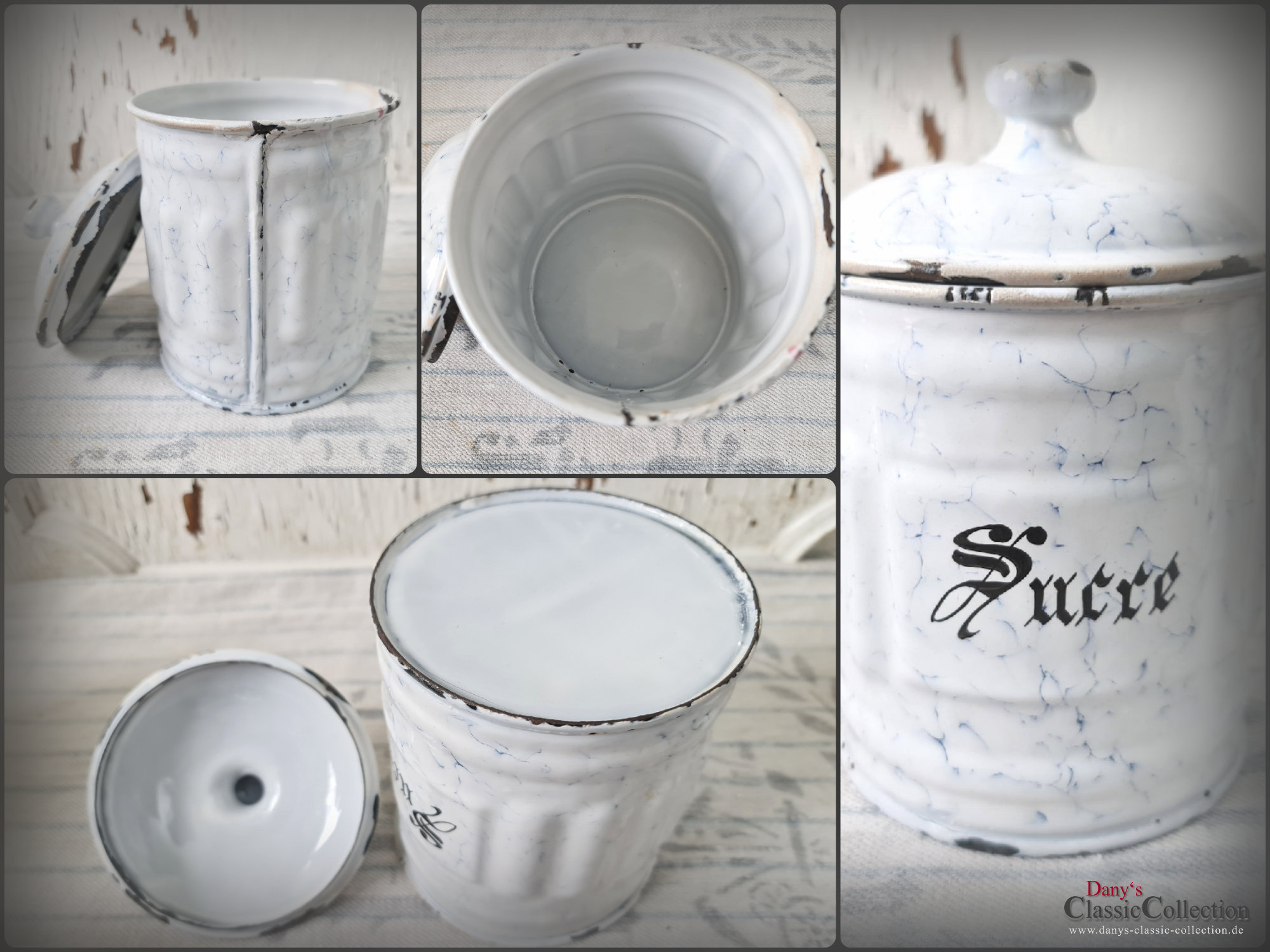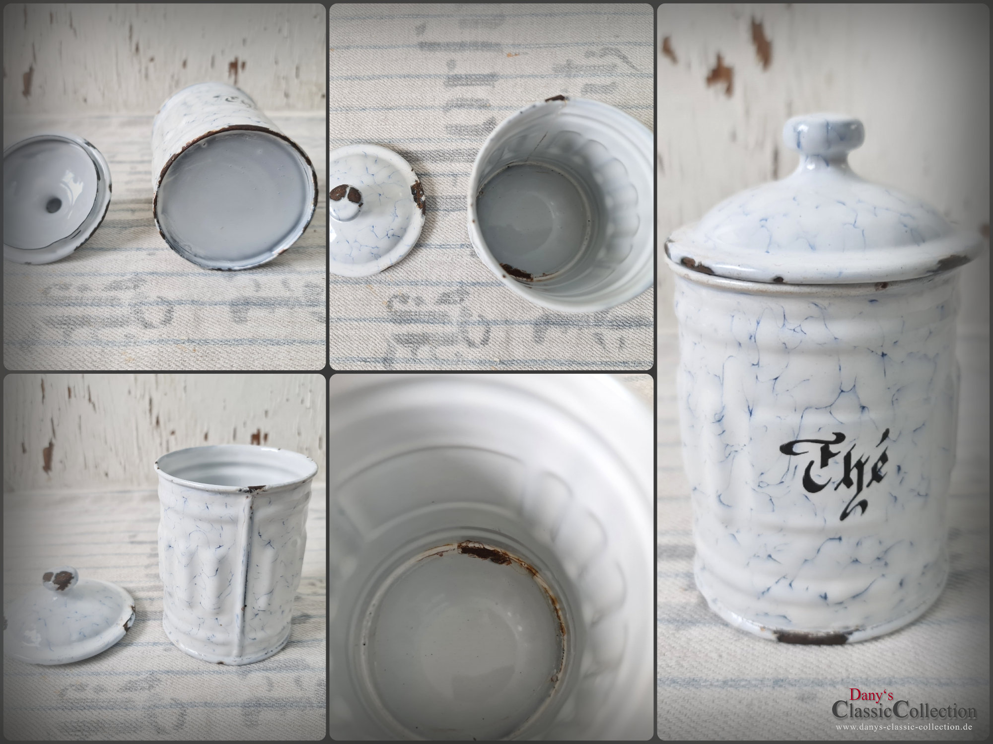 Praktische und sehr dekorative alte Vorratsdosen aus weißer Emaille, blau geädert - sogenanntem Wabenmuster.