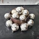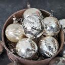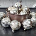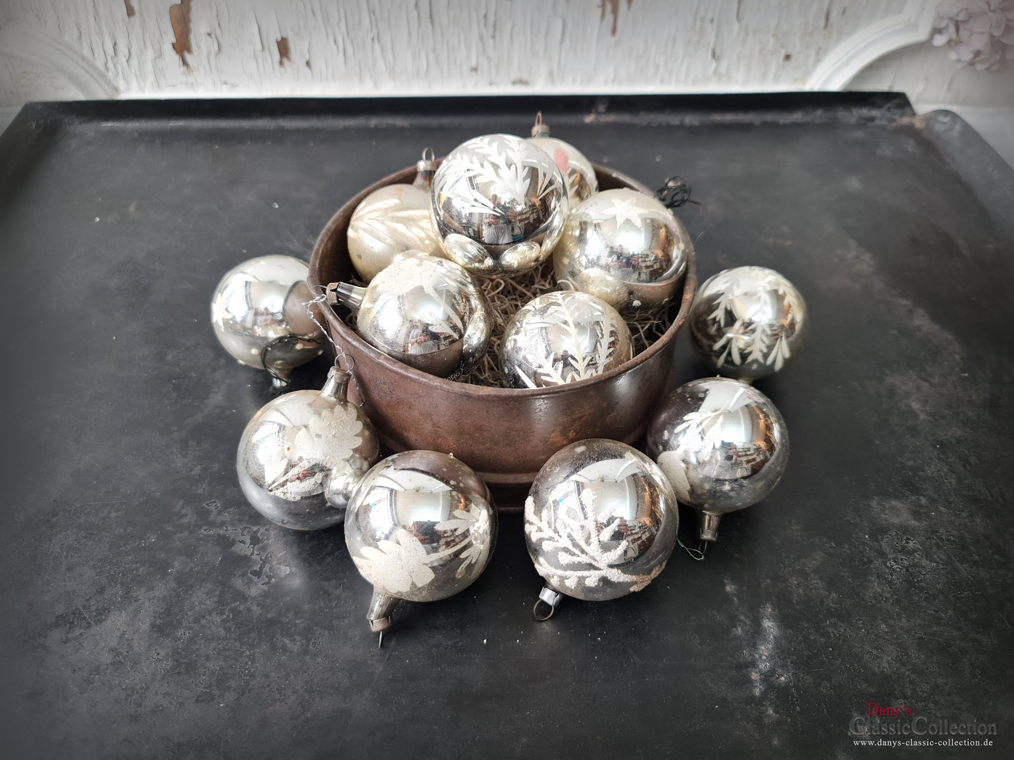 12 tolle alte Christbaumkugeln aus feinem Bauernsilberglas (innen silber bedampft), deutsche Handarbeit, mit weißer Bemalung in verschiedenen Dekoren.