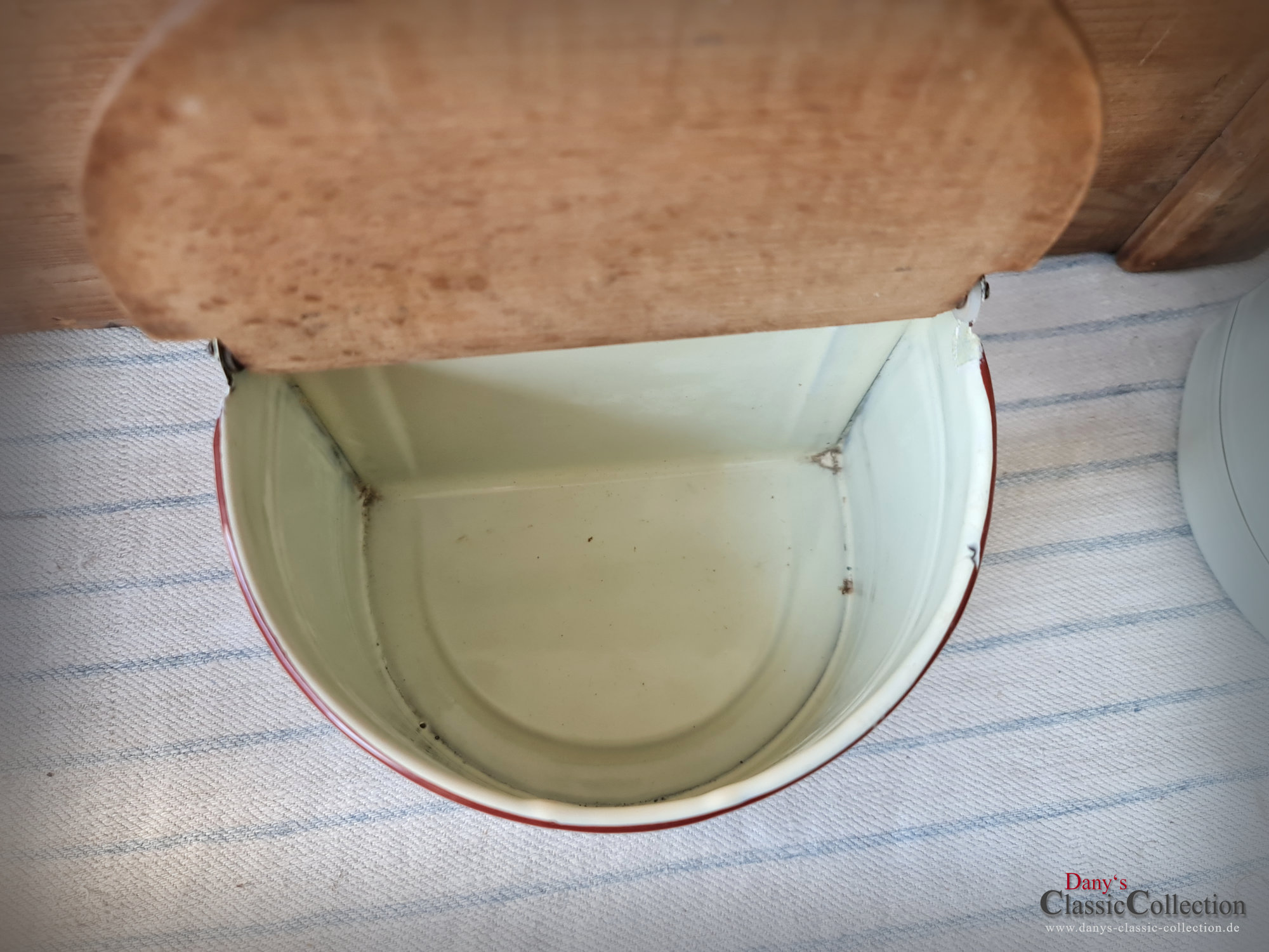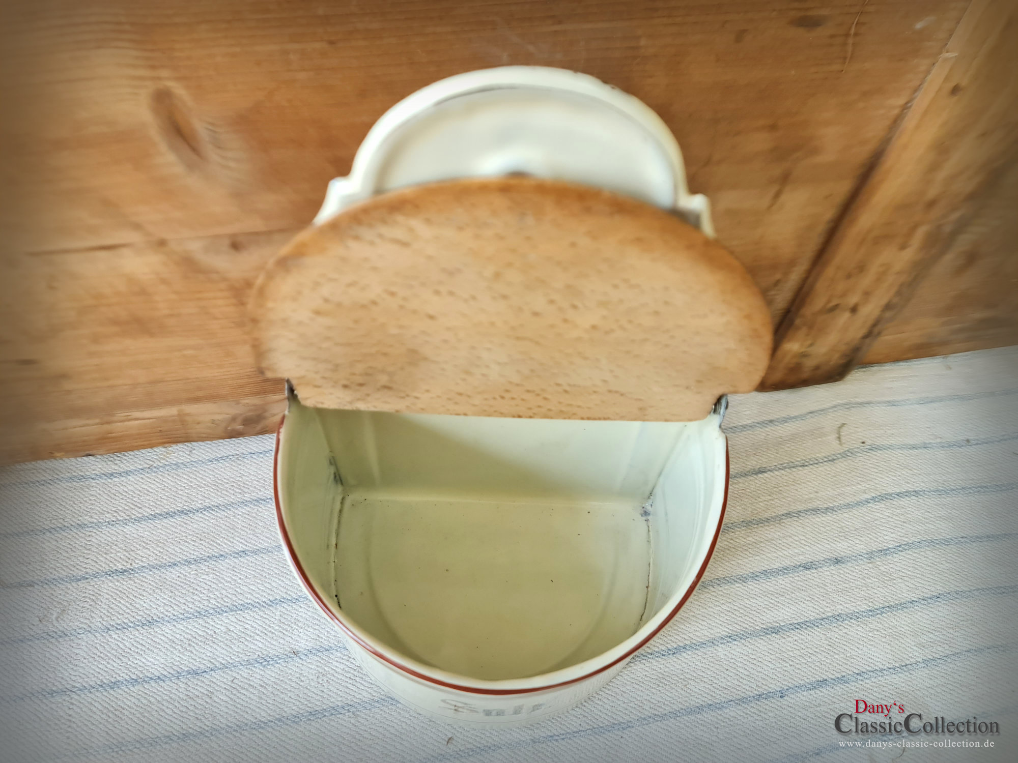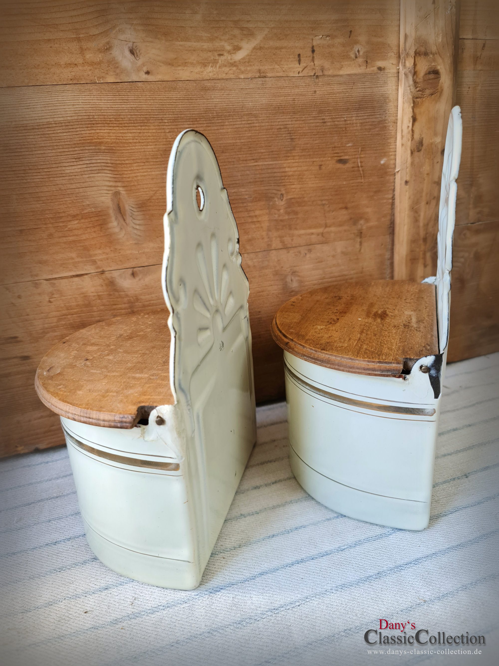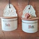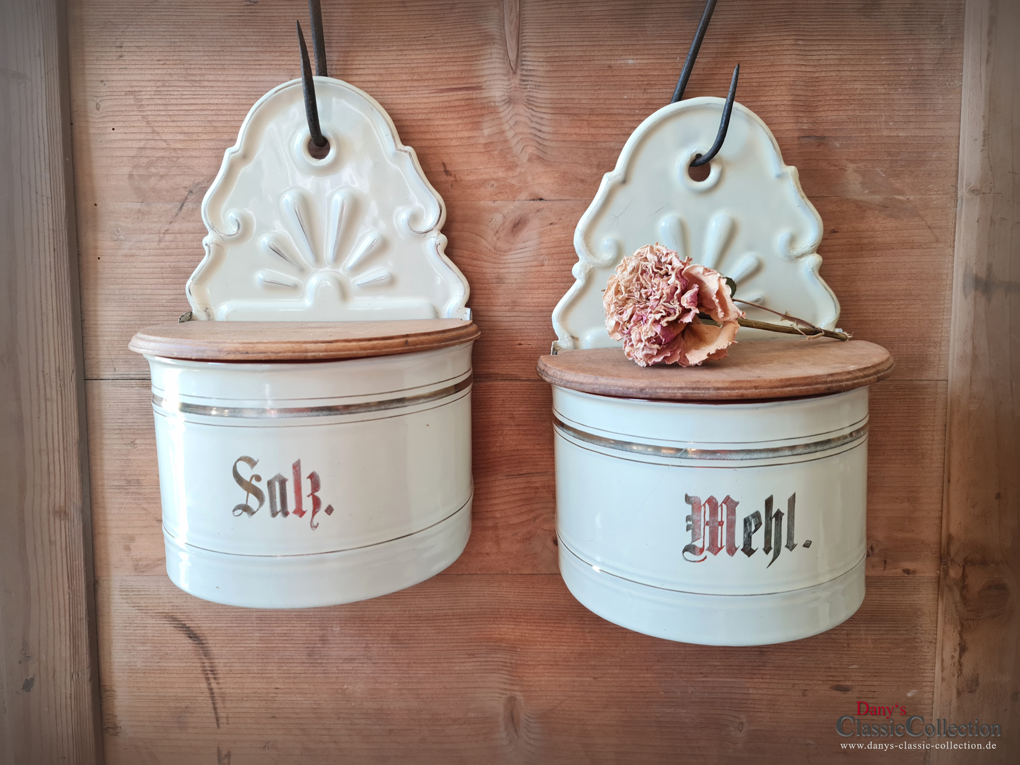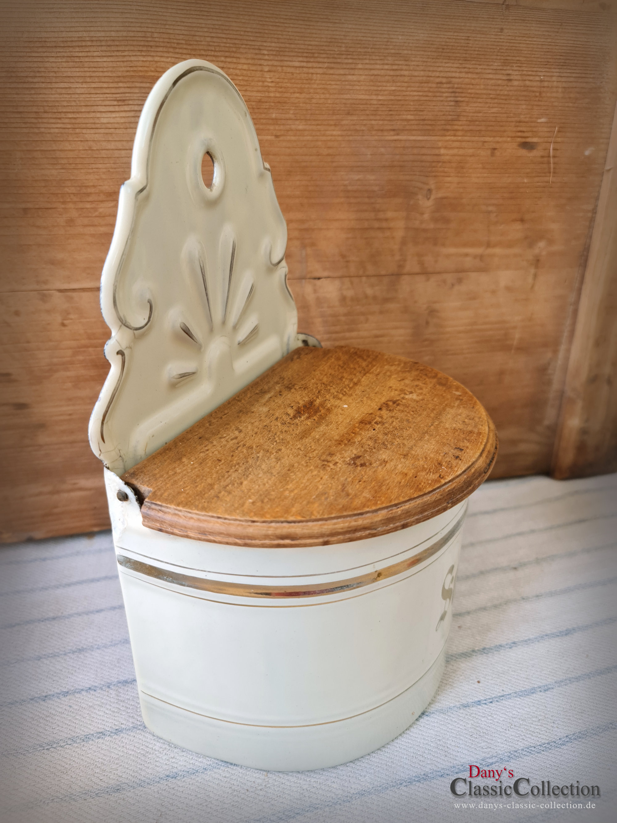 Hier haben wir zwei wirklich sensationell schöne Vorratsbehälter aus beiger Emaille mit Goldstreifen und Holzdeckel für "Mehl" und "Salz" zur Wandmontage.
