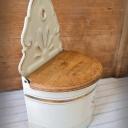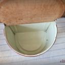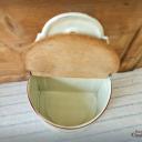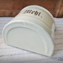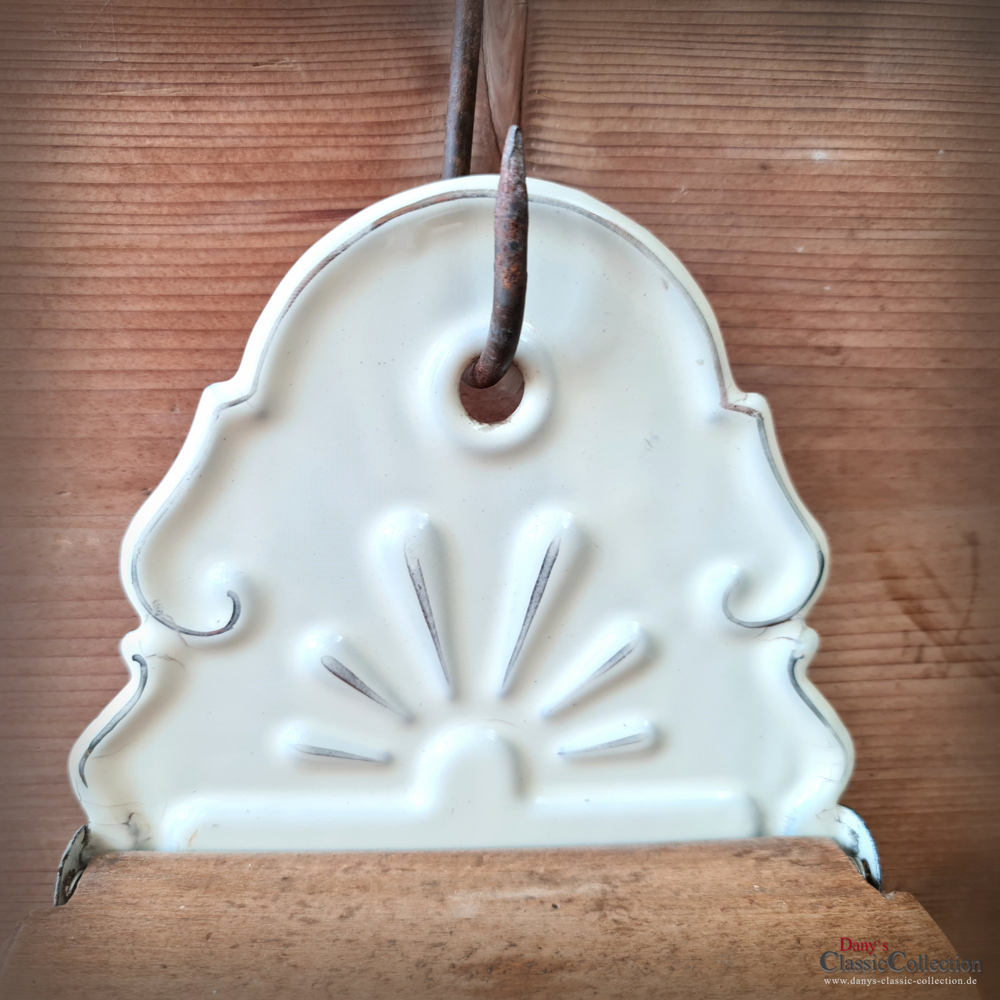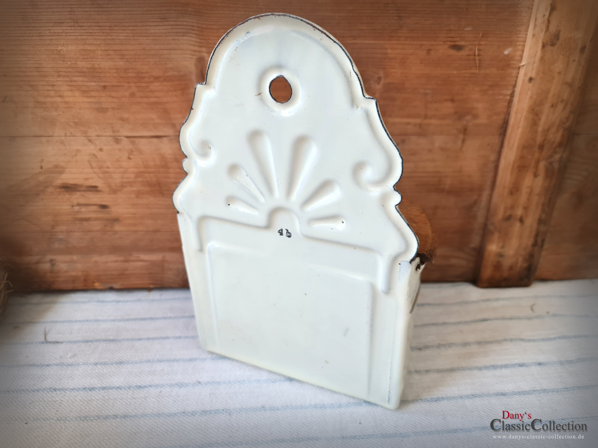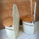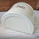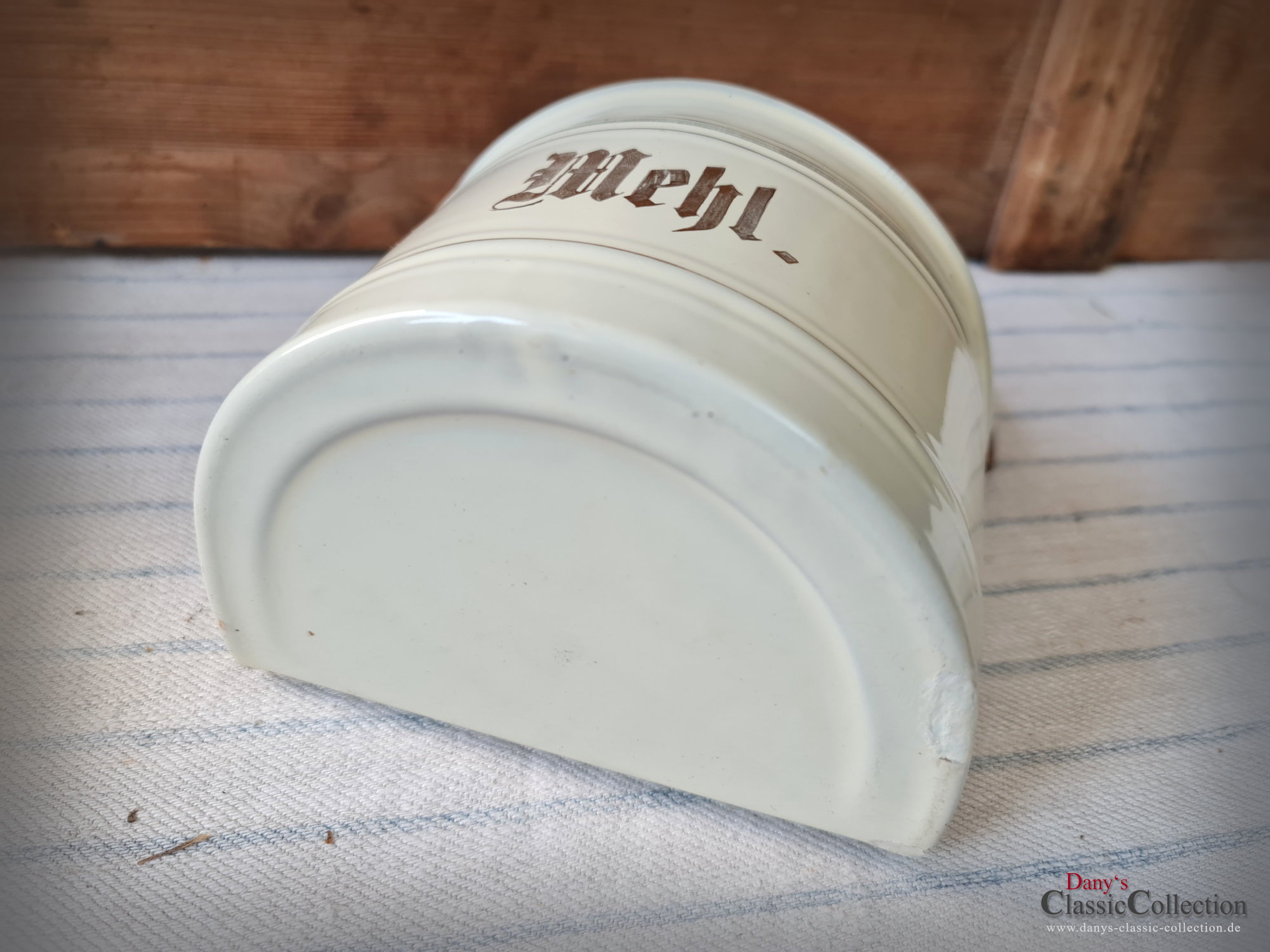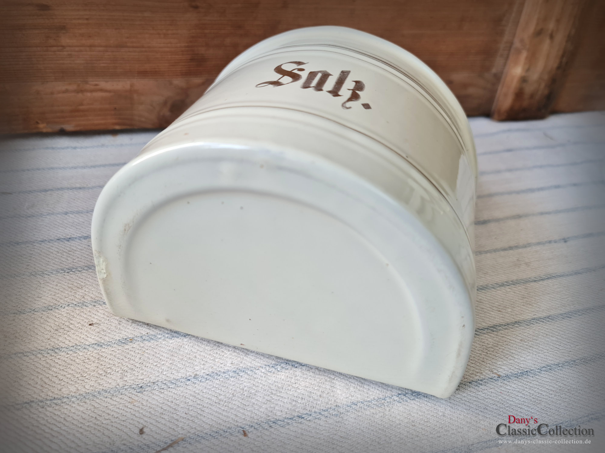 Hier haben wir zwei wirklich sensationell schöne Vorratsbehälter aus beiger Emaille mit Goldstreifen und Holzdeckel für "Mehl" und "Salz" zur Wandmontage.