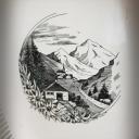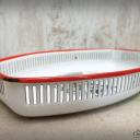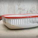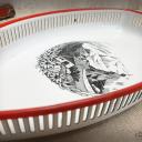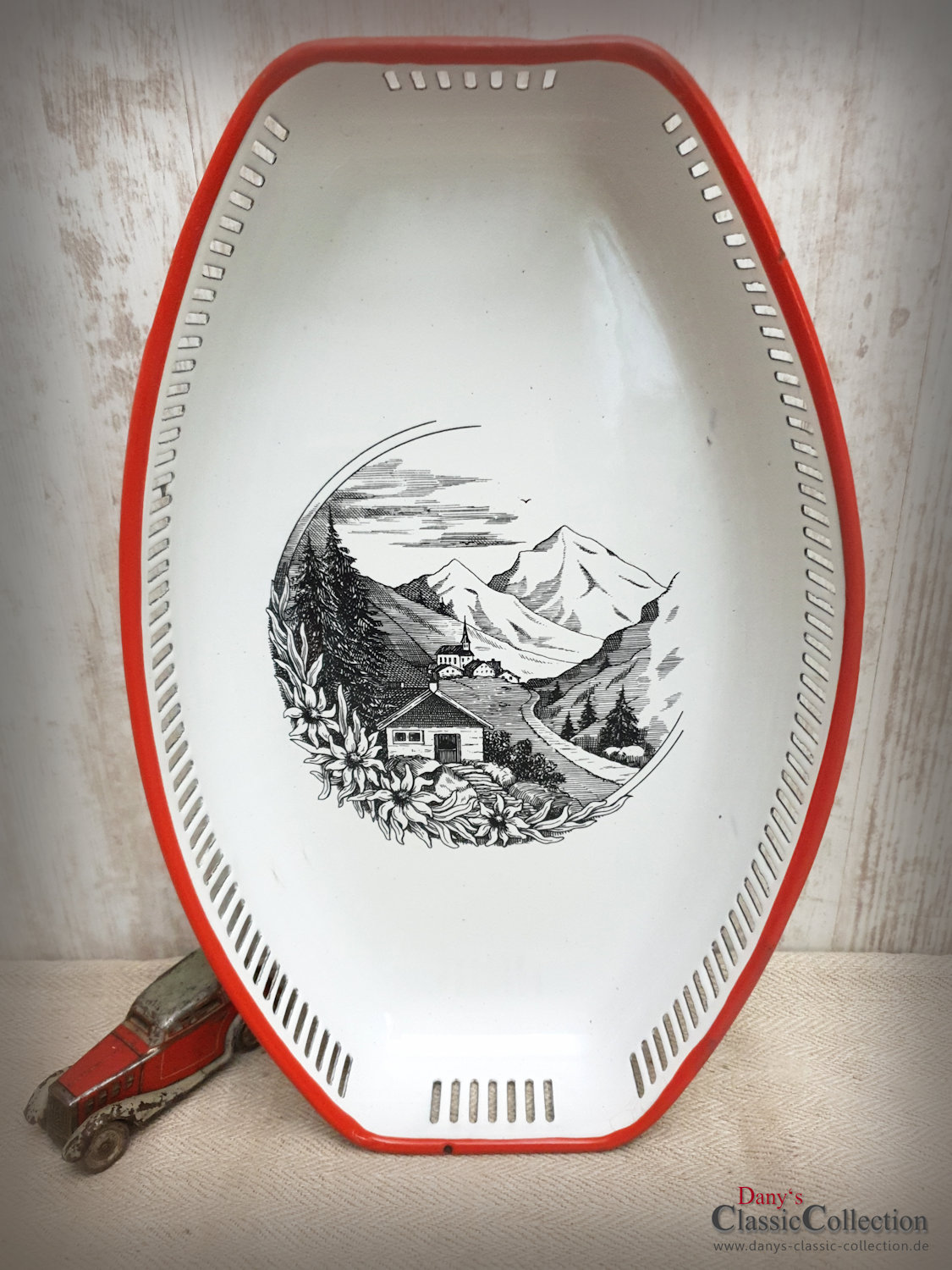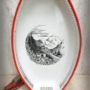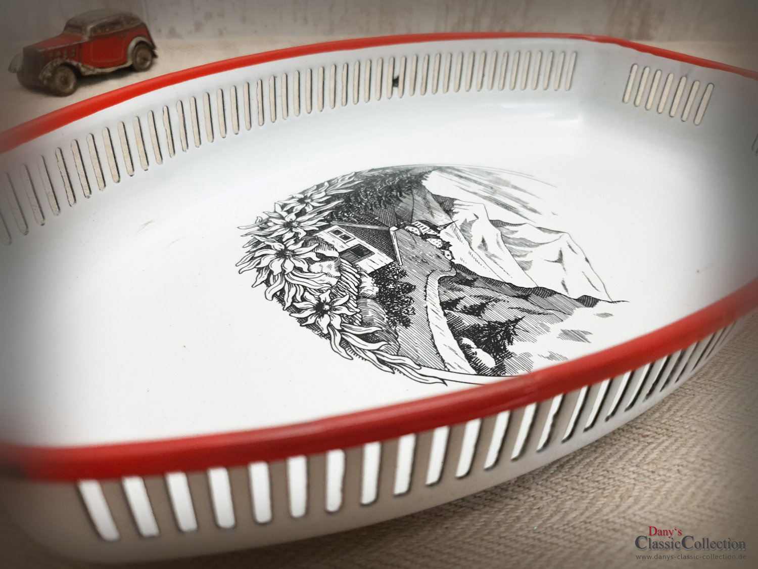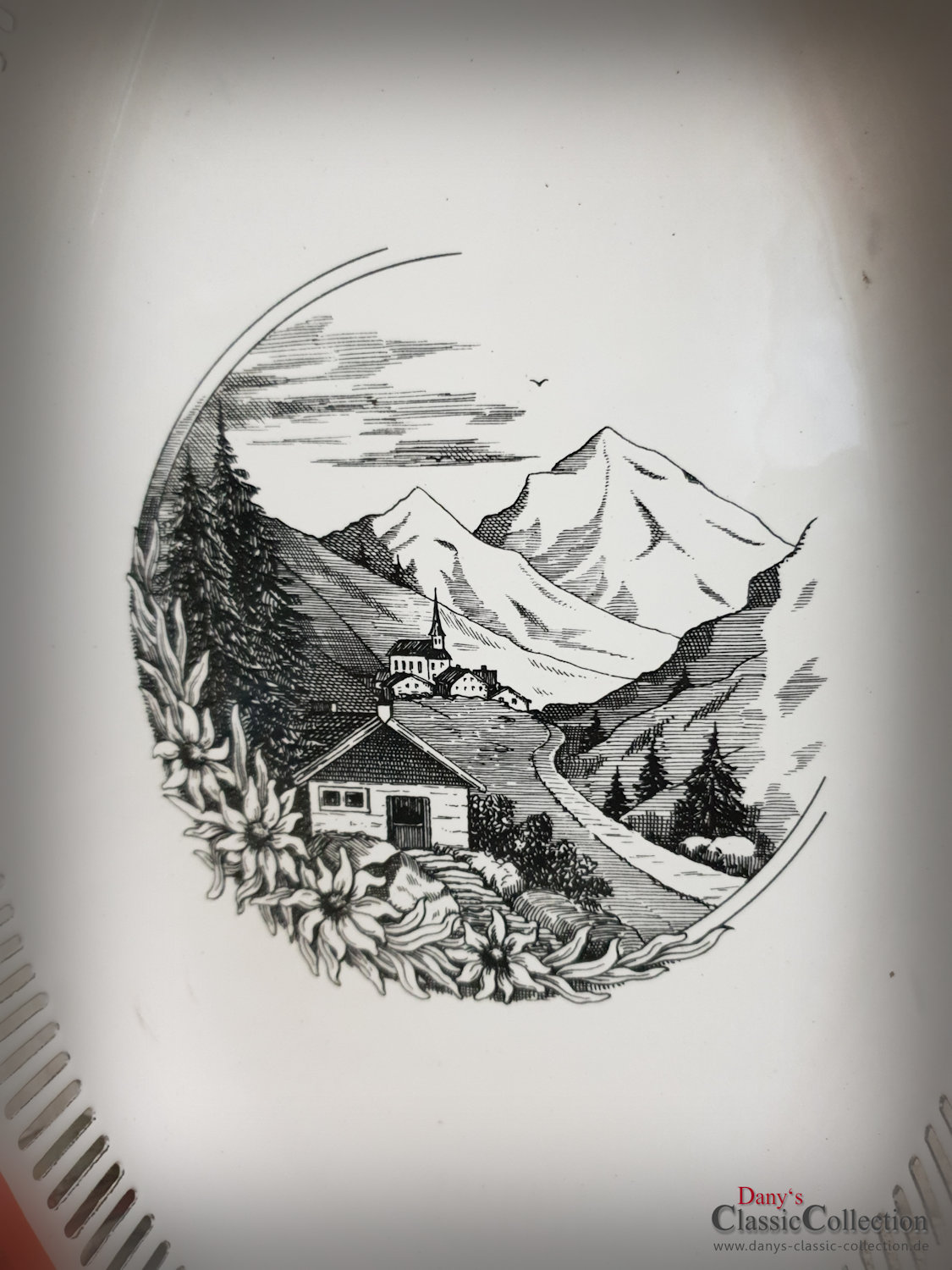 Hübsche Brotschale mit rotem Rand und einem dezent schwarz-weißem alpinen Landschafts-Motiv mit Edelweiß.