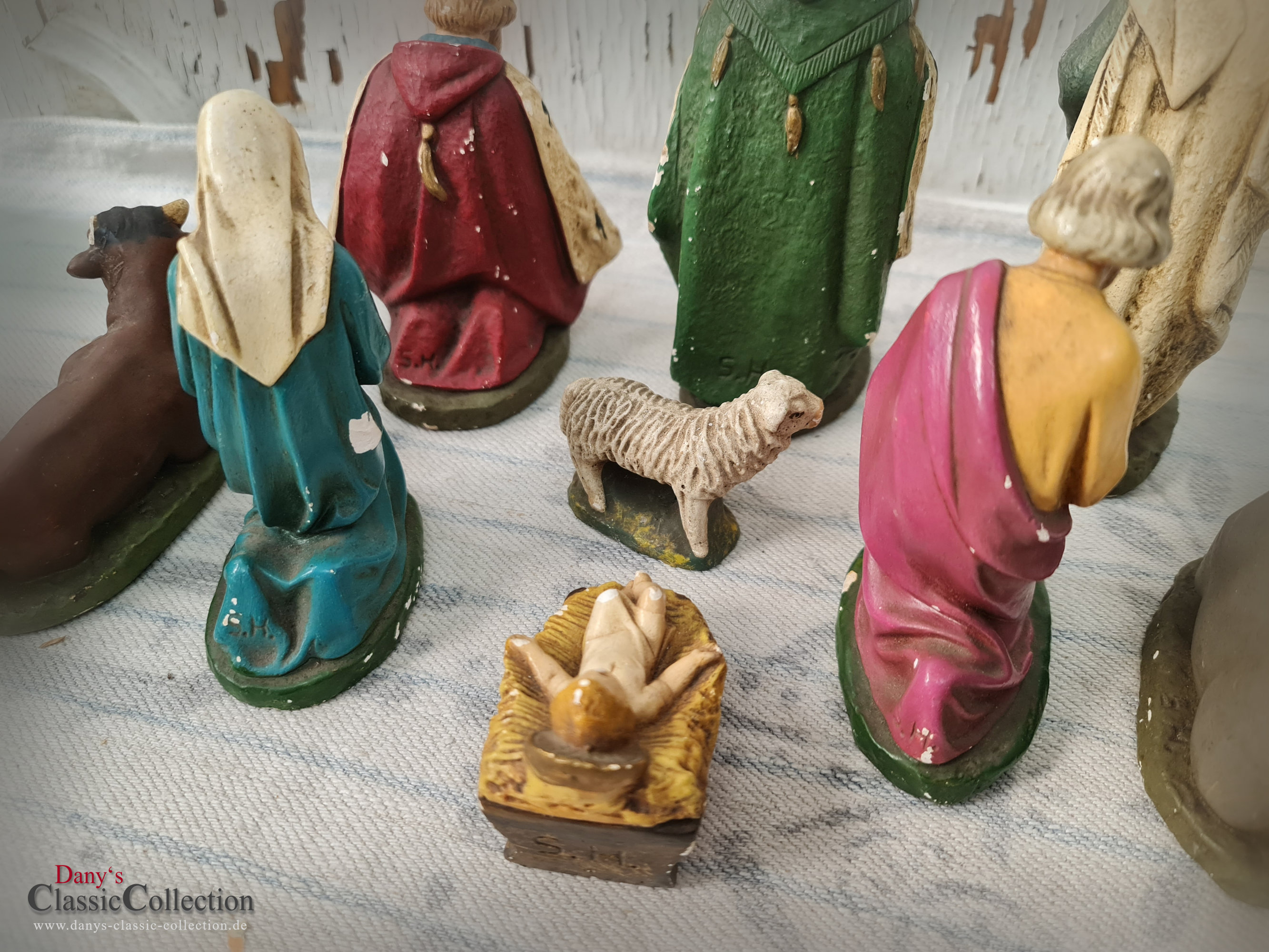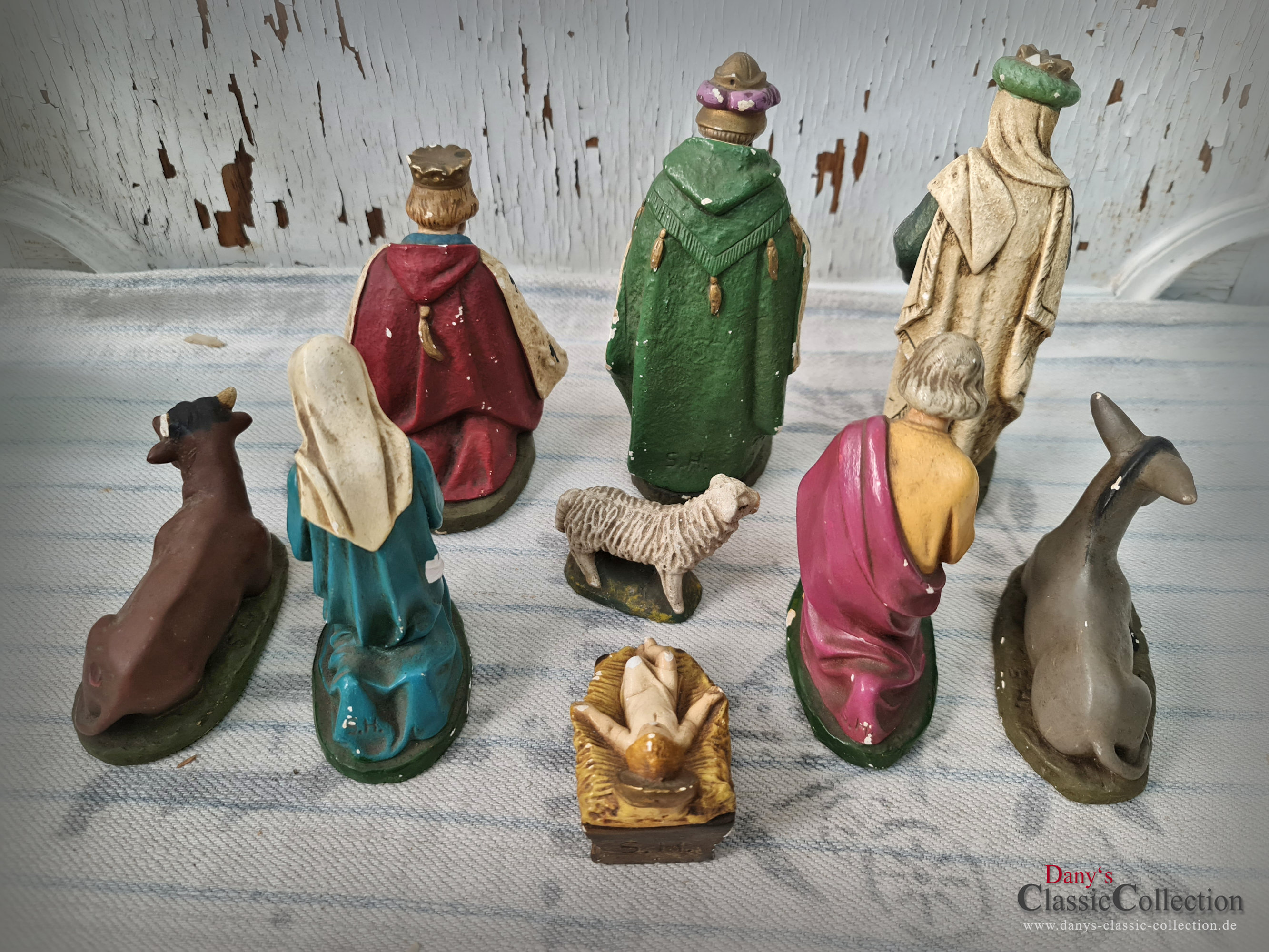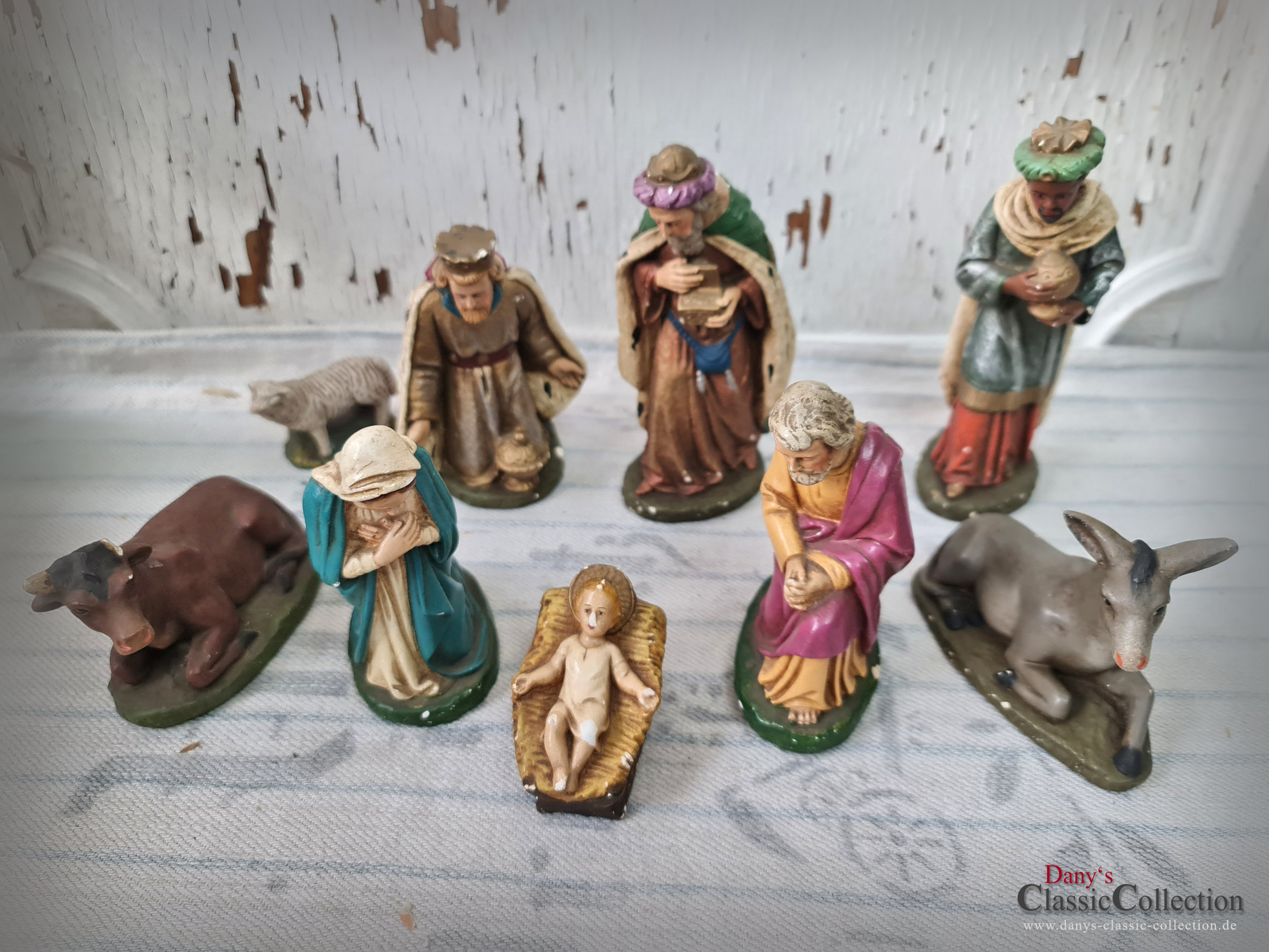 Alte Krippenfiguren: Jesus, Maria, Josef, Heilige 3 Könige, Esel, Kuh und Schaf