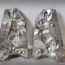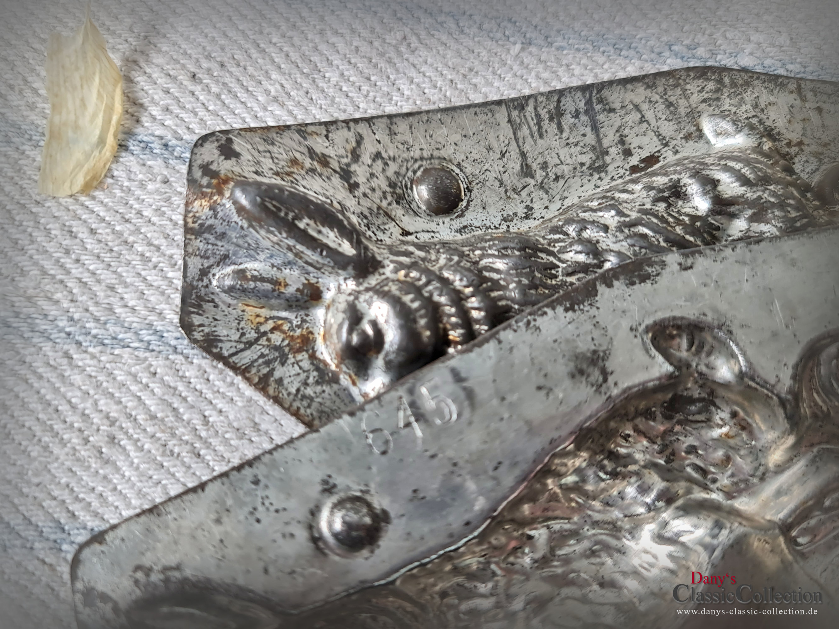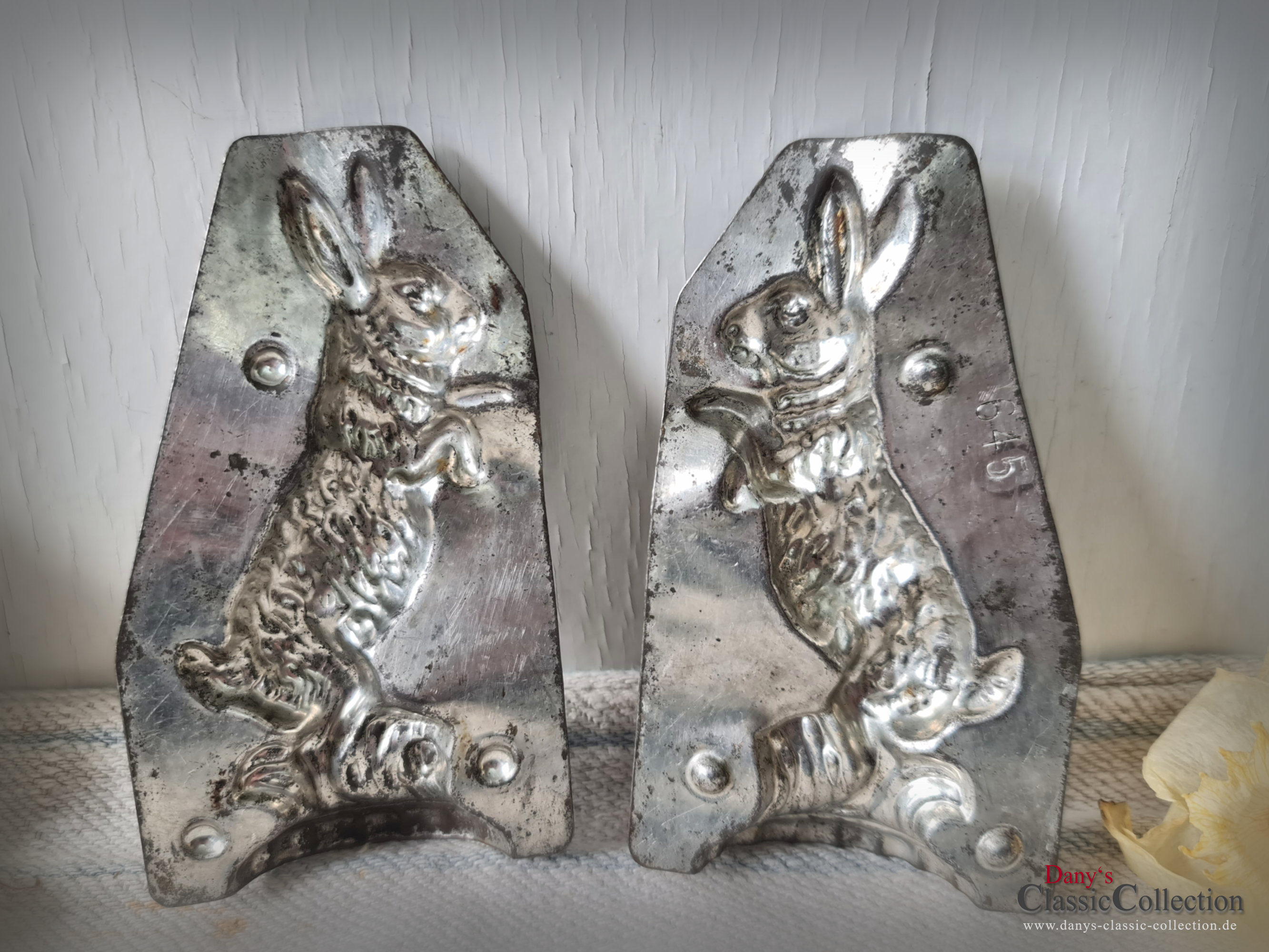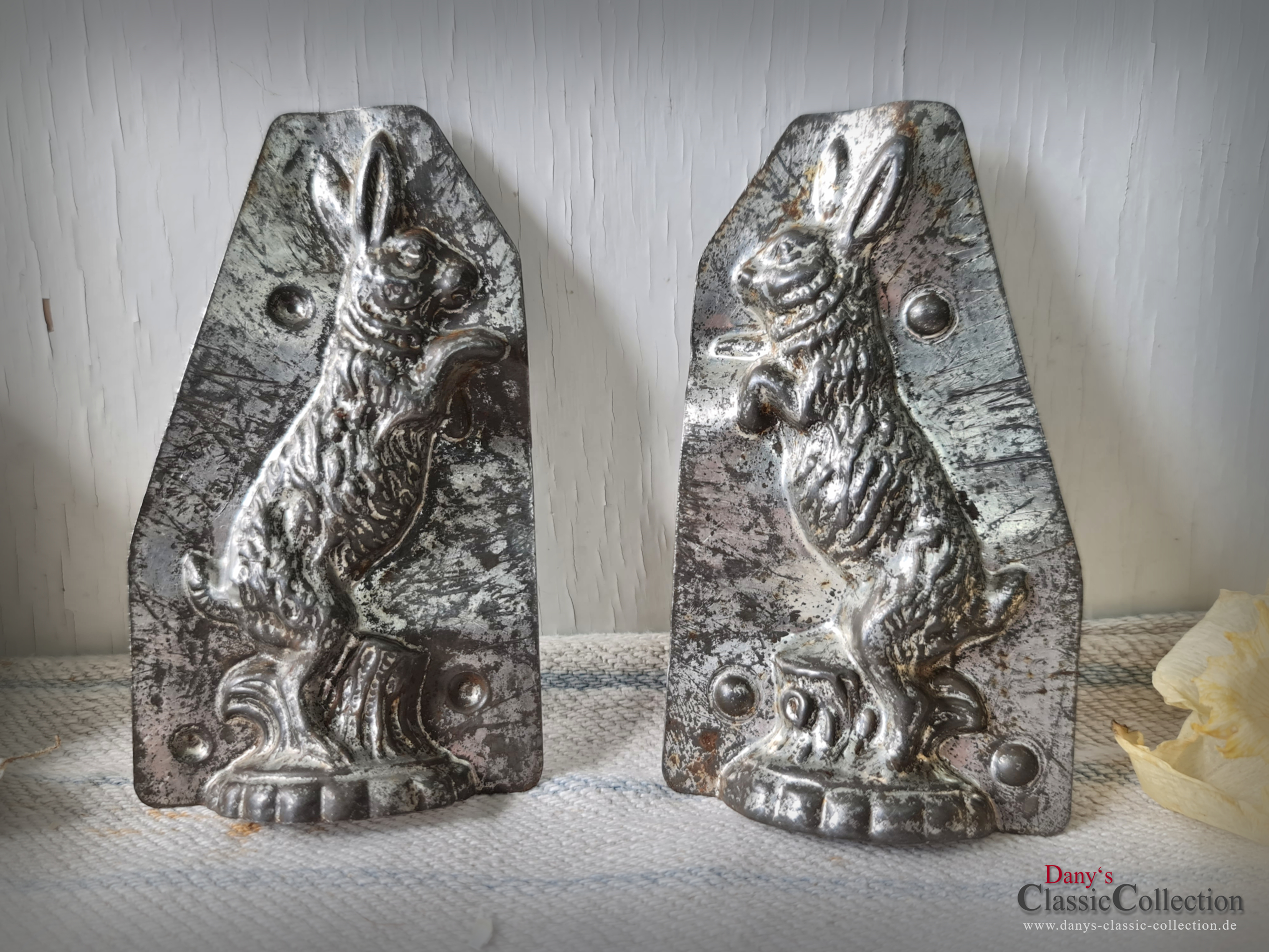 Schöne alte 2-teilige Hasen Schokoladenform mit asgeprägter Patina, die heute ein tolles Deko-Stück abgibt, nicht nur für die Osterzeit.