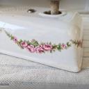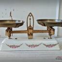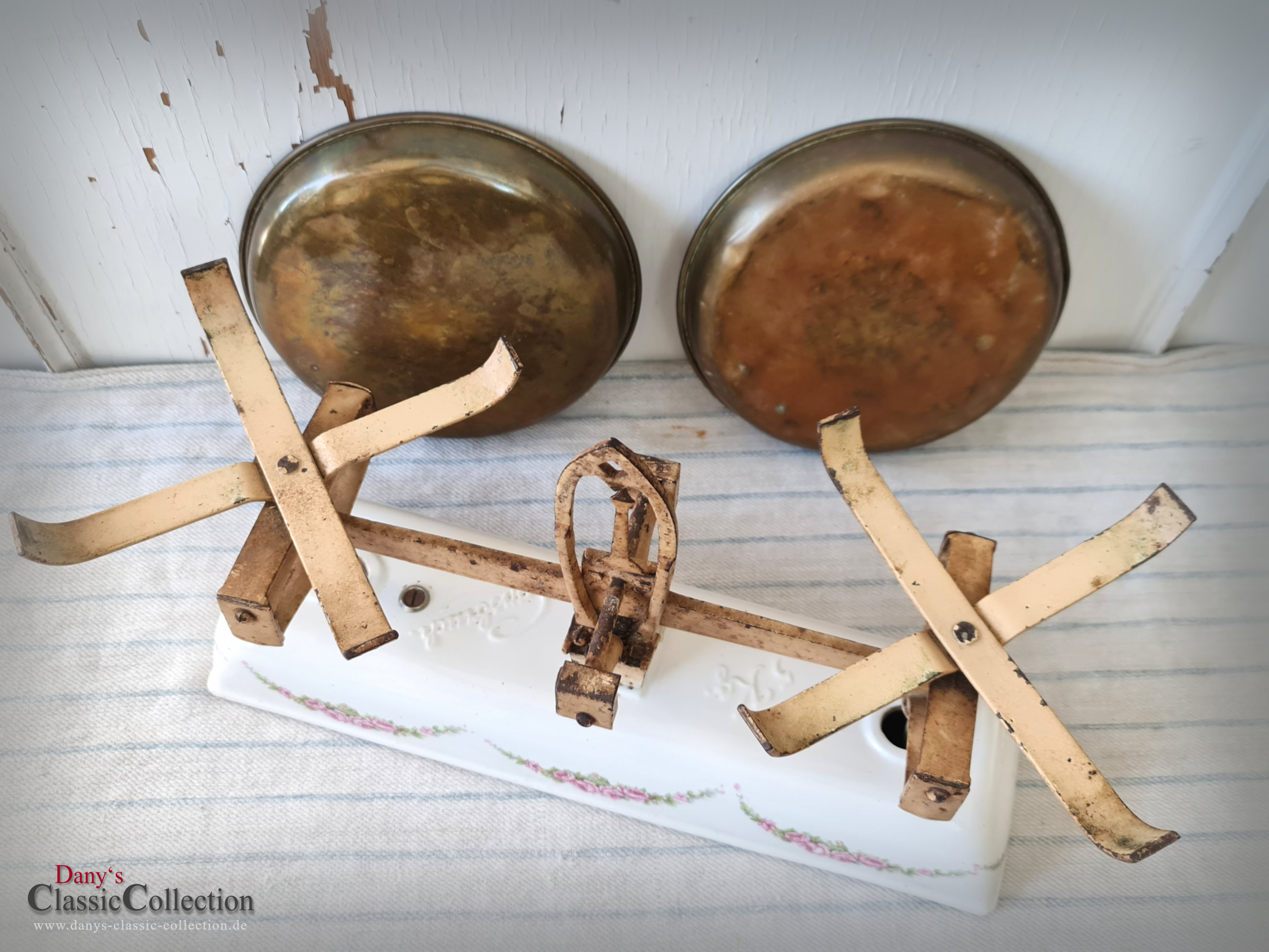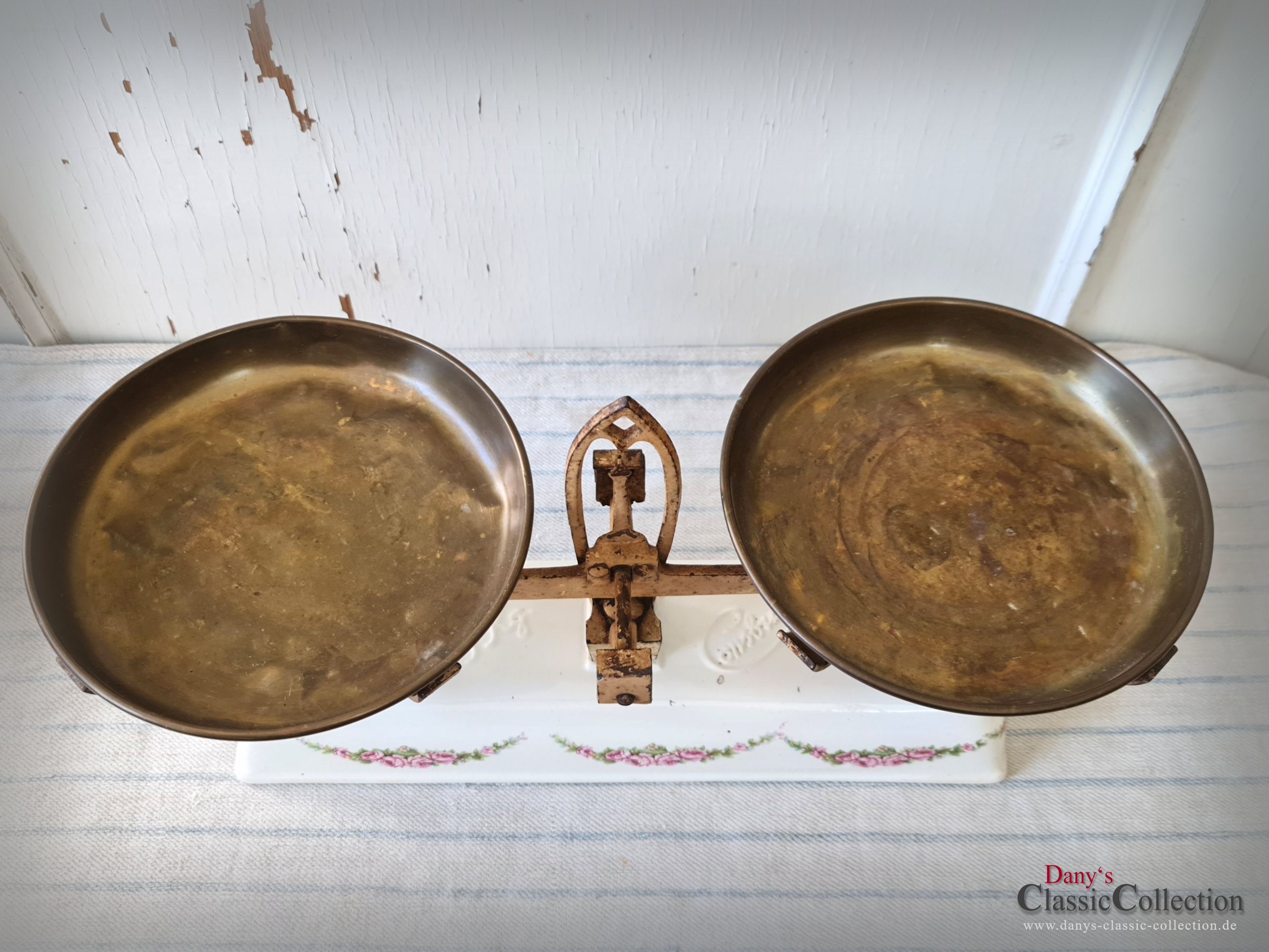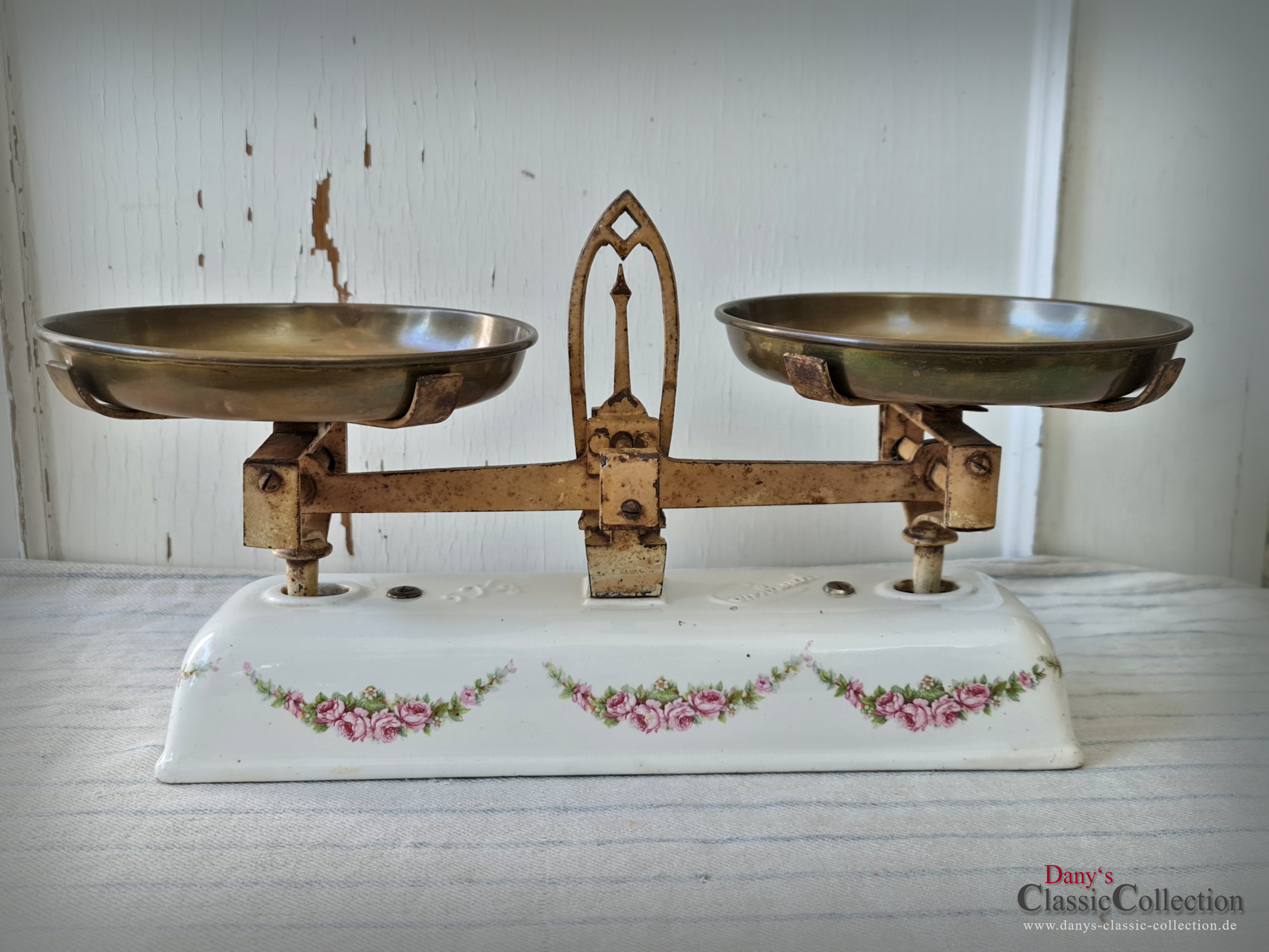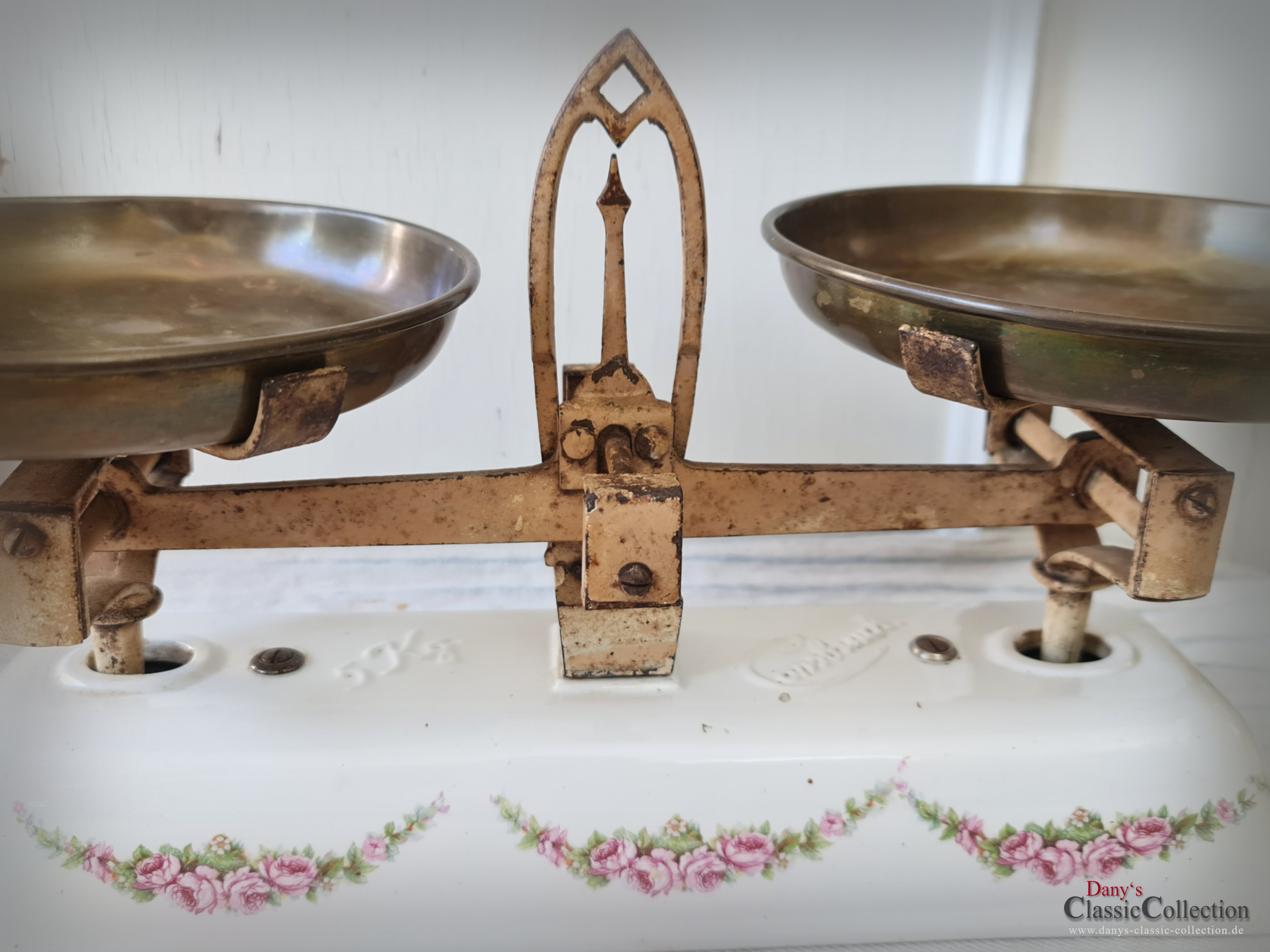 Wunderschöne gusseiserne Küchenwaage mit Keramikkorpus, welches ein zierliches Rosendekor ziert.