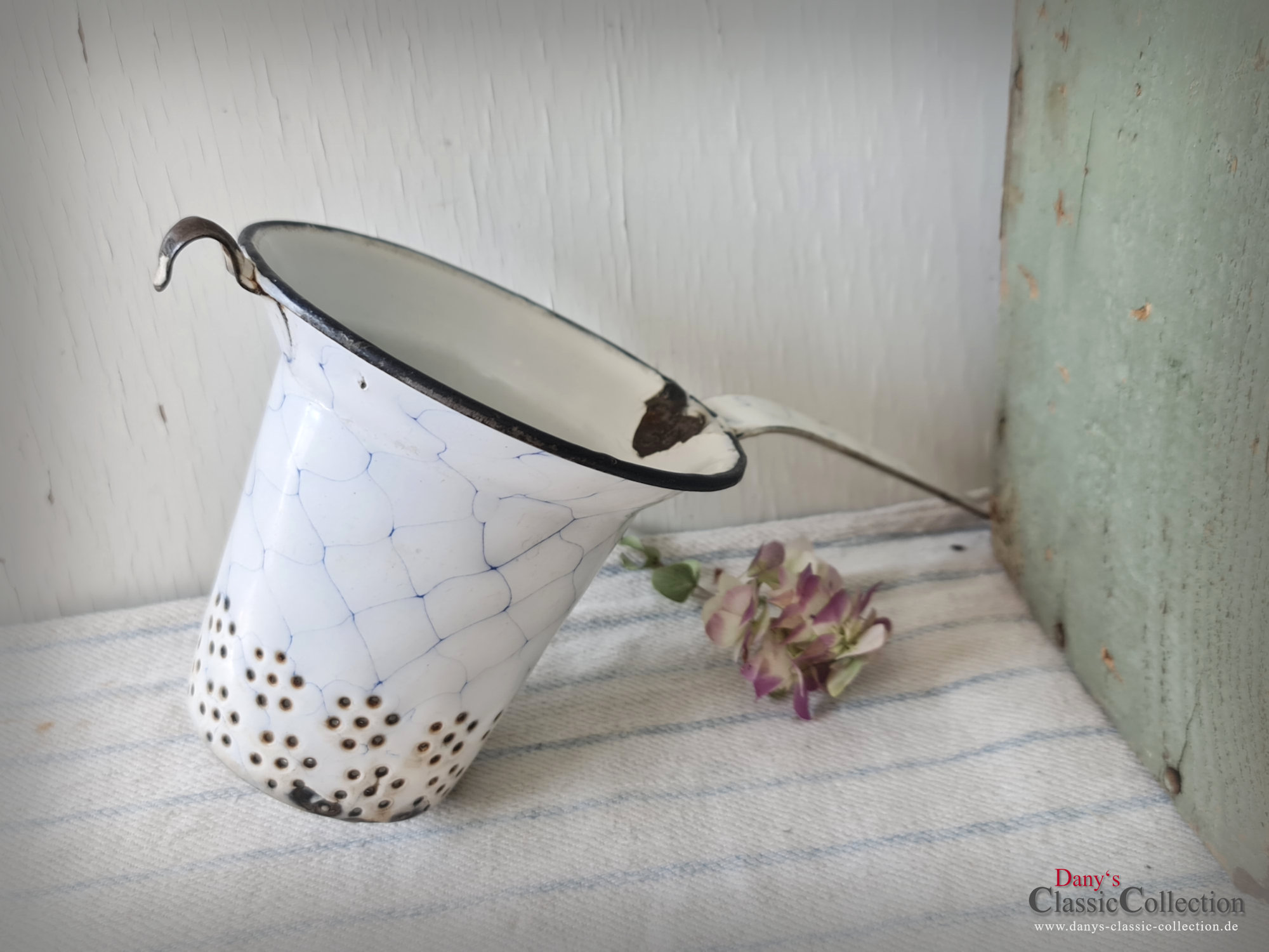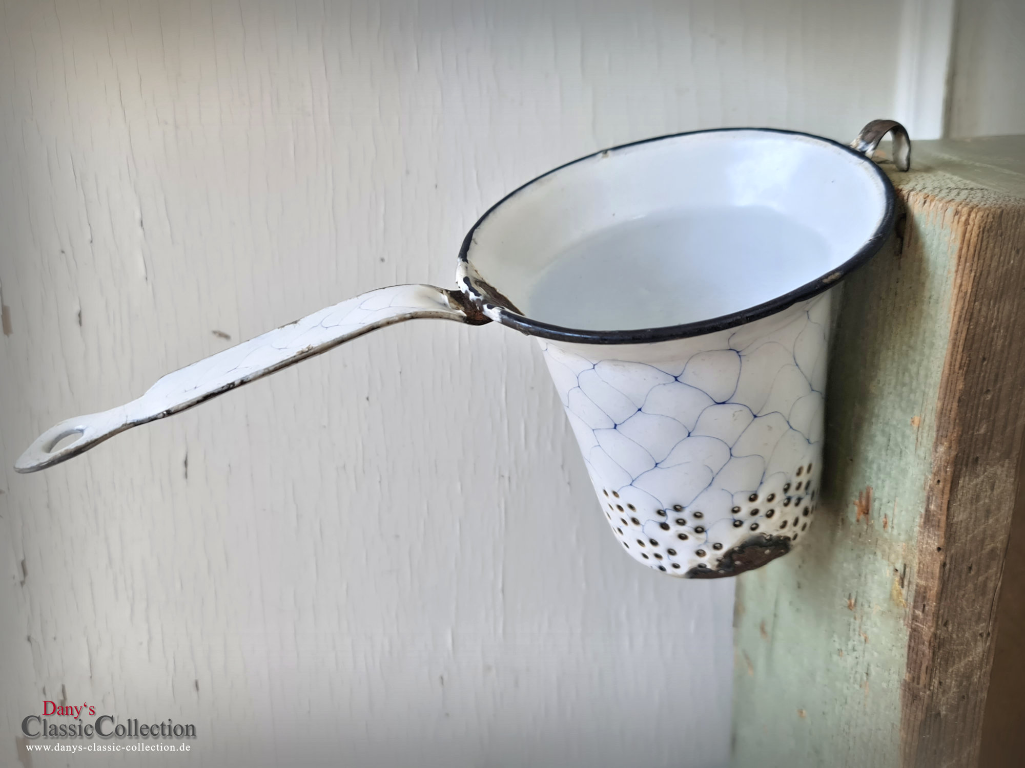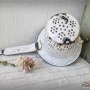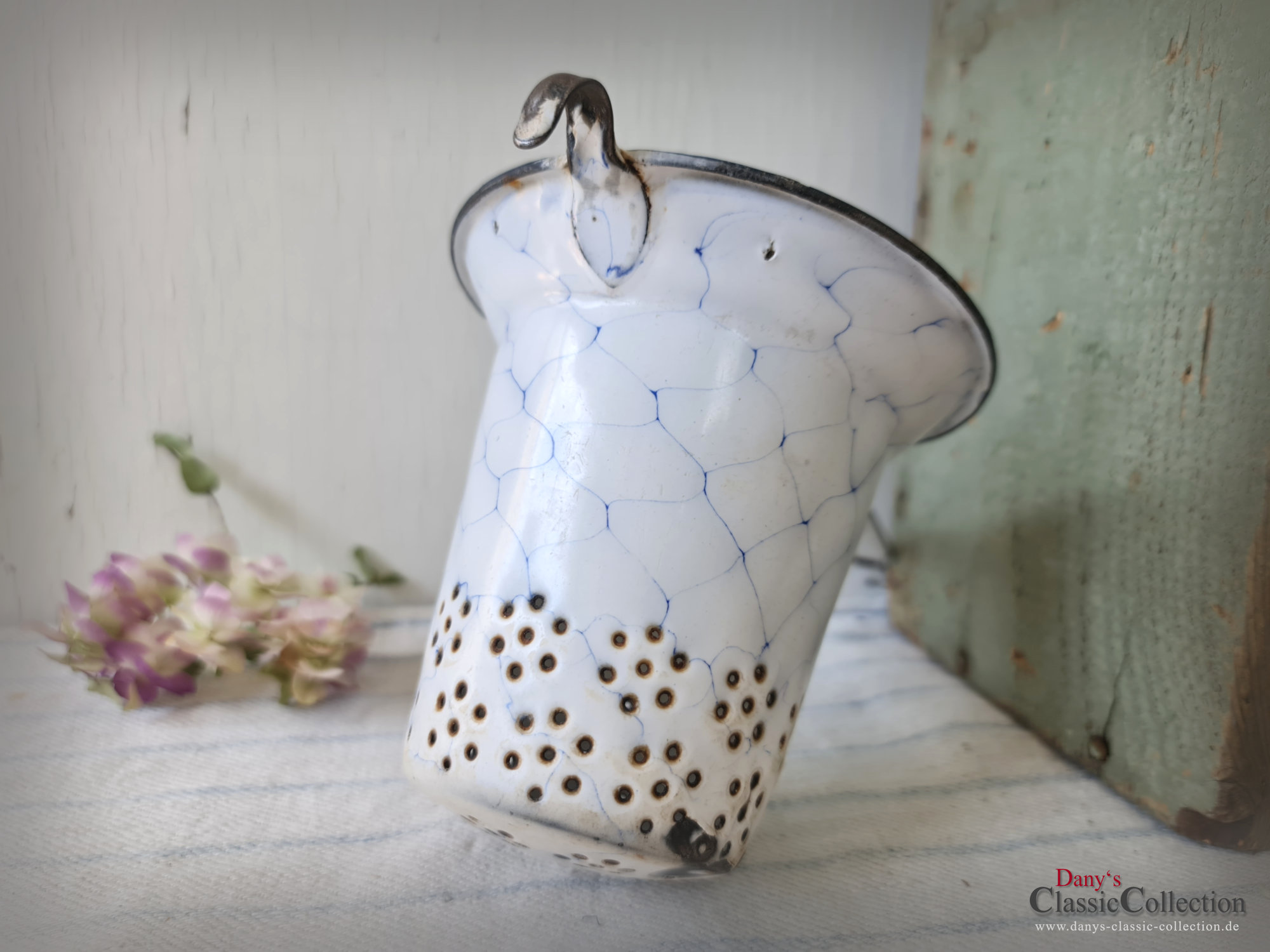 Ein nicht nur dekoratives, sondern auch praktisches altes Sieb aus weißer Emaille, blau geädert - sogenanntem Wabenmuster.