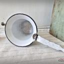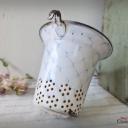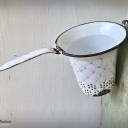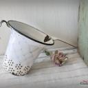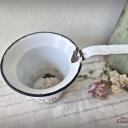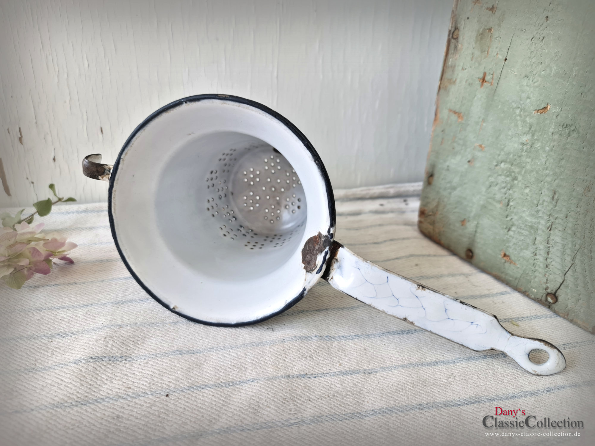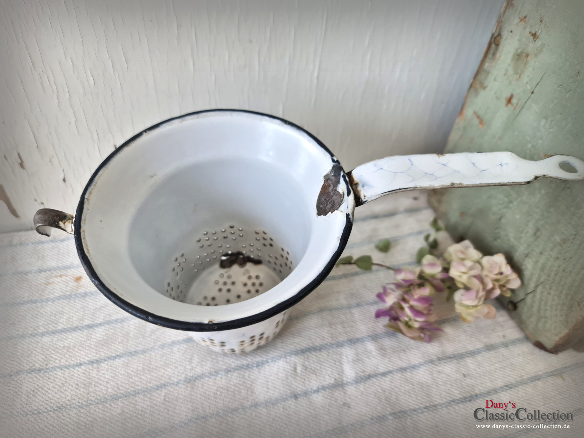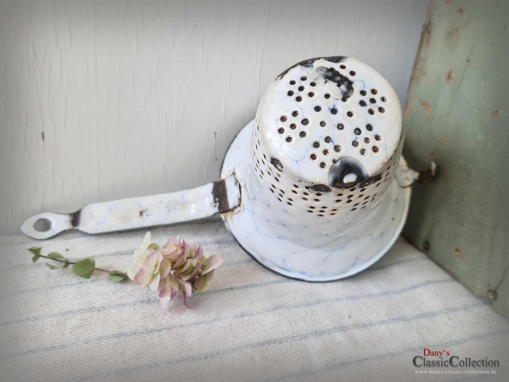 Ein nicht nur dekoratives, sondern auch praktisches altes Sieb aus weißer Emaille, blau geädert - sogenanntem Wabenmuster.
