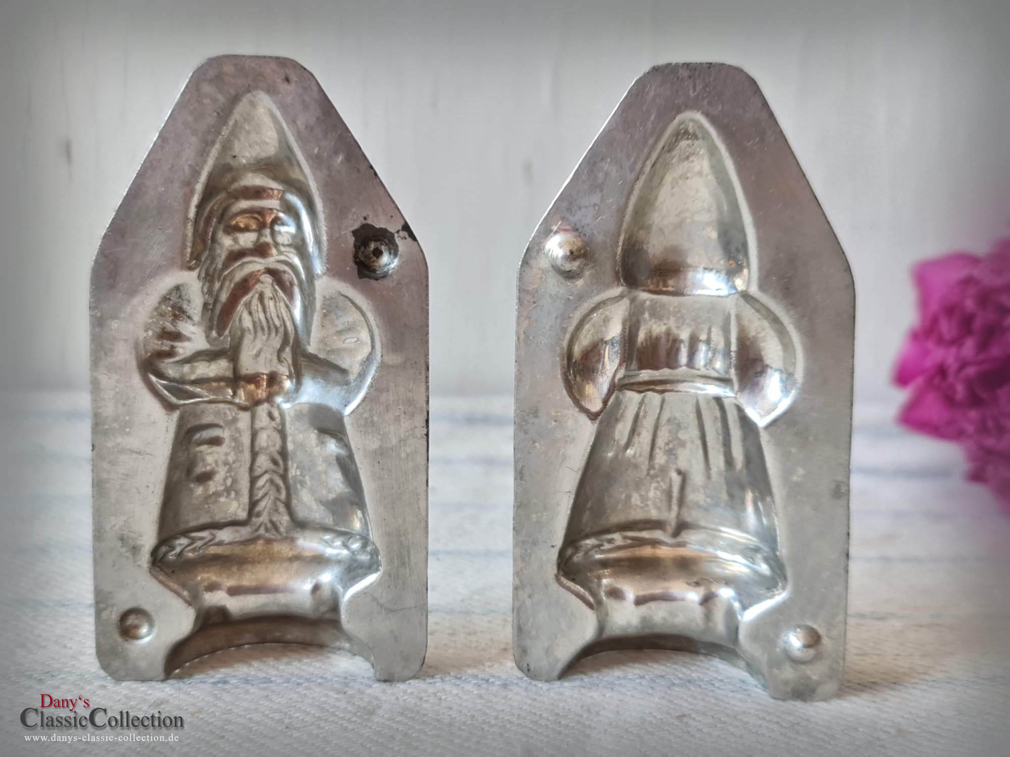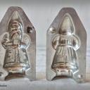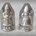 Tolle alte Nikolaus Schokoladenform aus verzinntem Weißblech, bestehend aus Vorder- und Rückseite, liebevoll detailliert gearbeitet.