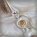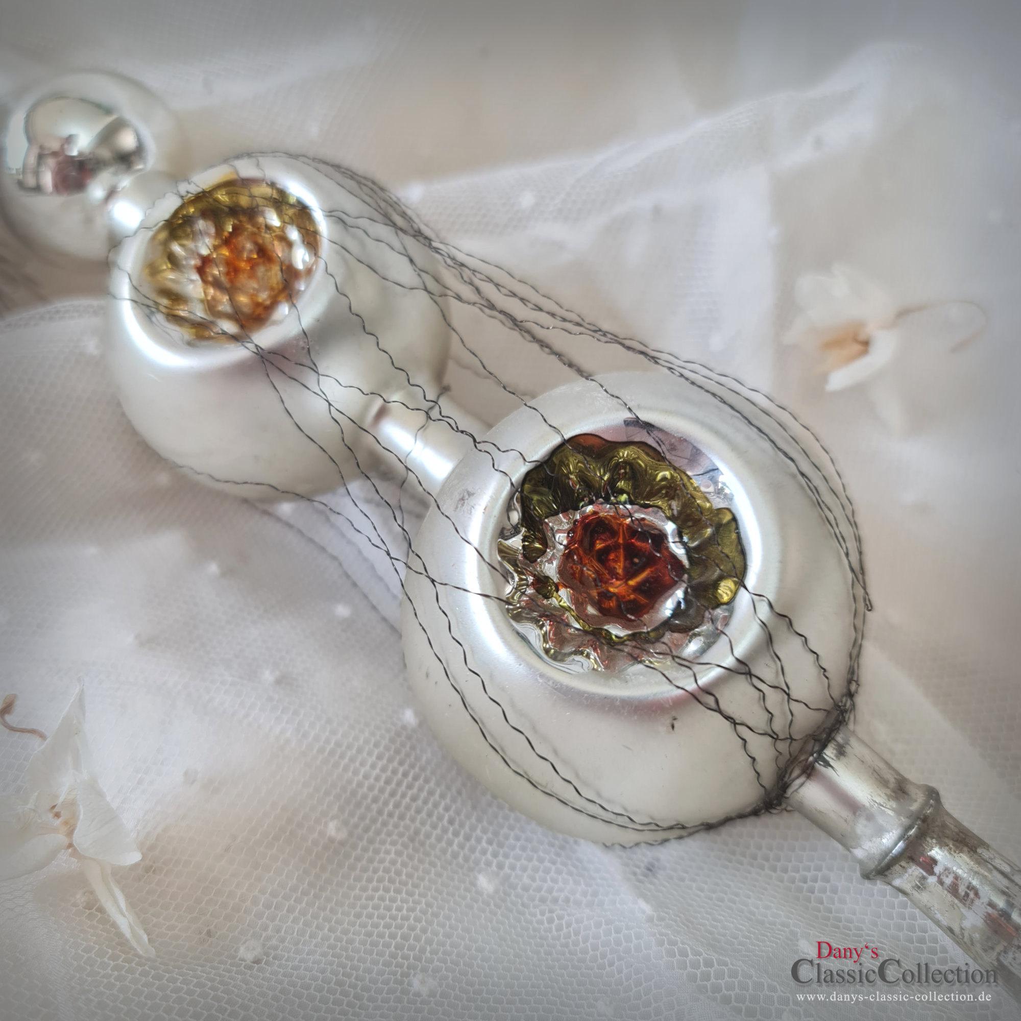 Die mundgeblasene Spitze ist silber, die Kugeln sind mattiert und mit Bouillondraht umwickelt.