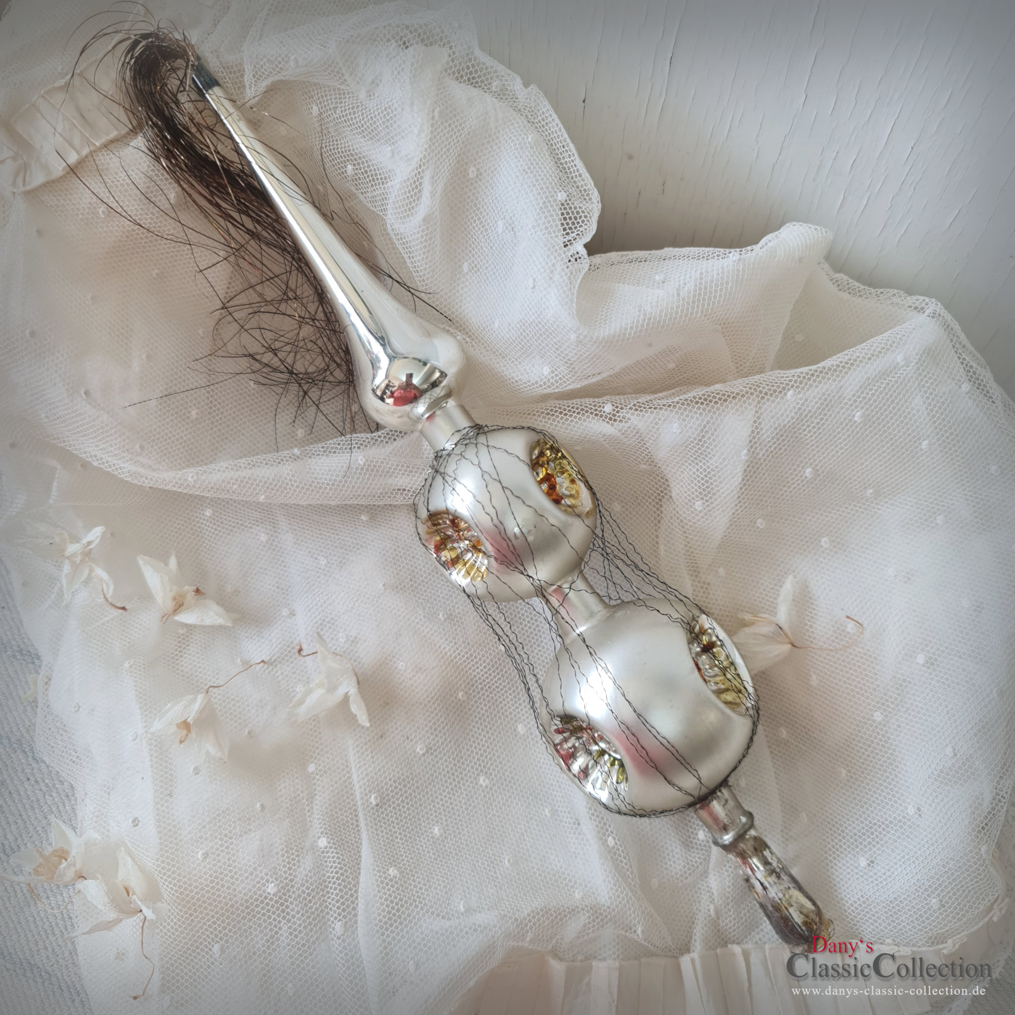 Der obere Teil der Spitze ist glänzend silber und endet mit dem wunderschönen Tinselschweif.
