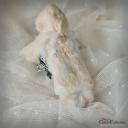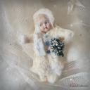 Das Püppchen mit seinem süßen Gesicht aus Porzellan trägt ein weißes Mäntelchen mit Kapuze.
