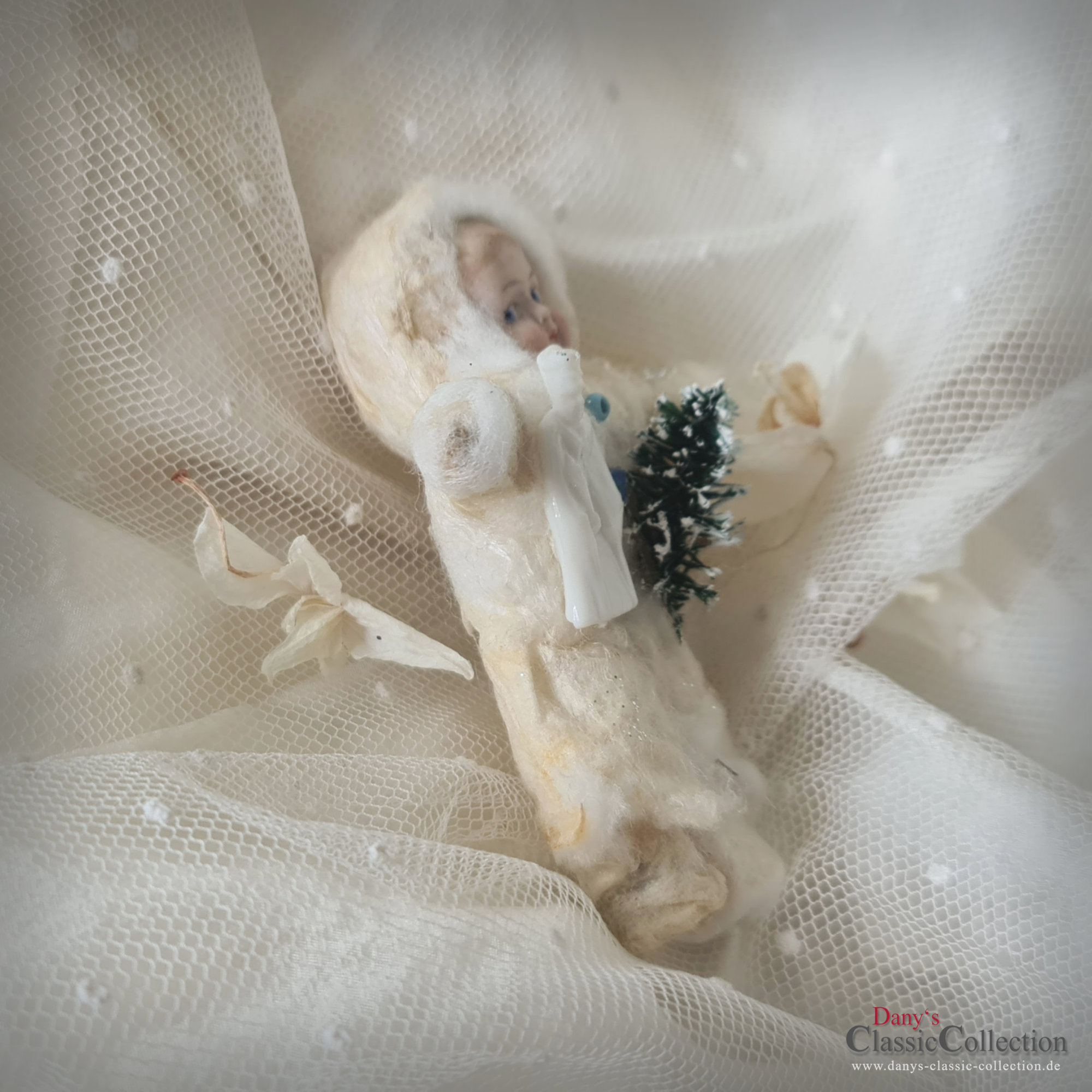 VERKAUFT ! Niedliches Winterkind ~ Schneekind ~ Wattekind mit Bäumchen ~ nostalgische Weihnachtsdeko ~ Vintage Weihnacht ~ Weihnachtsschmuck