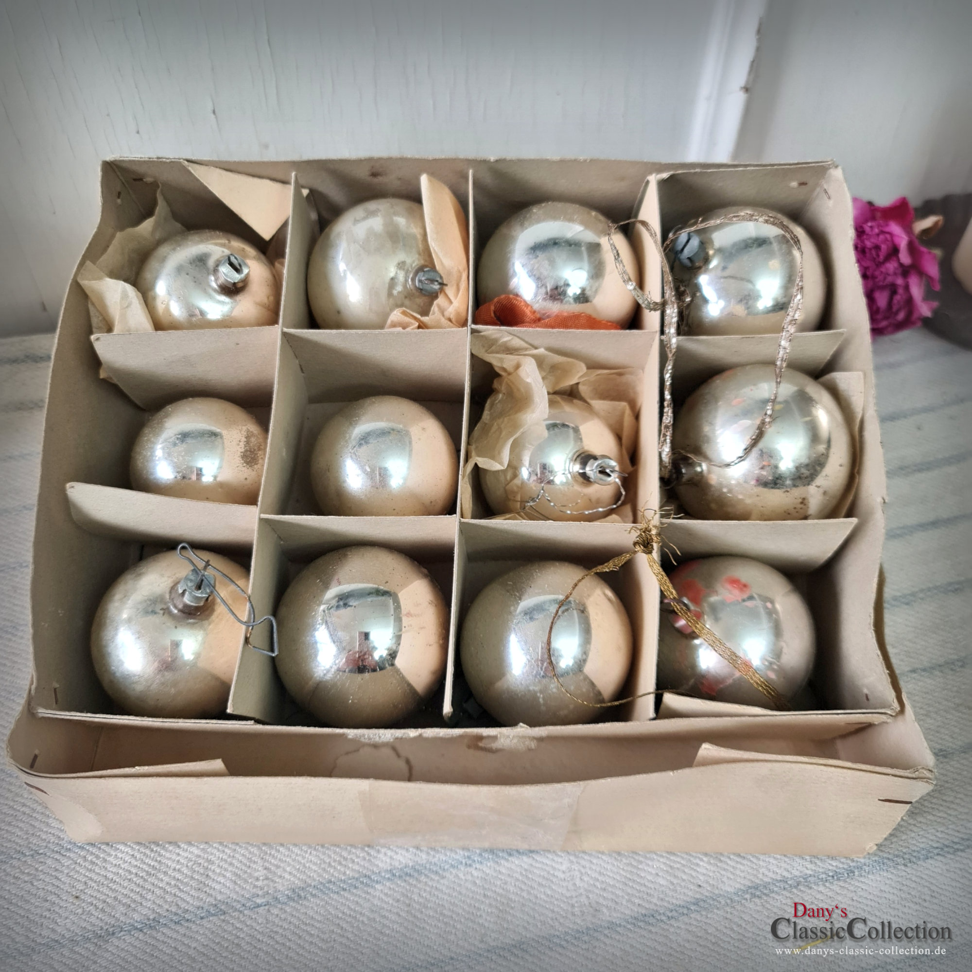 Hier haben wir 12 alte silberne Christbaumkugeln aus feinstem Glas in ihrer original Box in verschiedenen Größen.