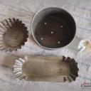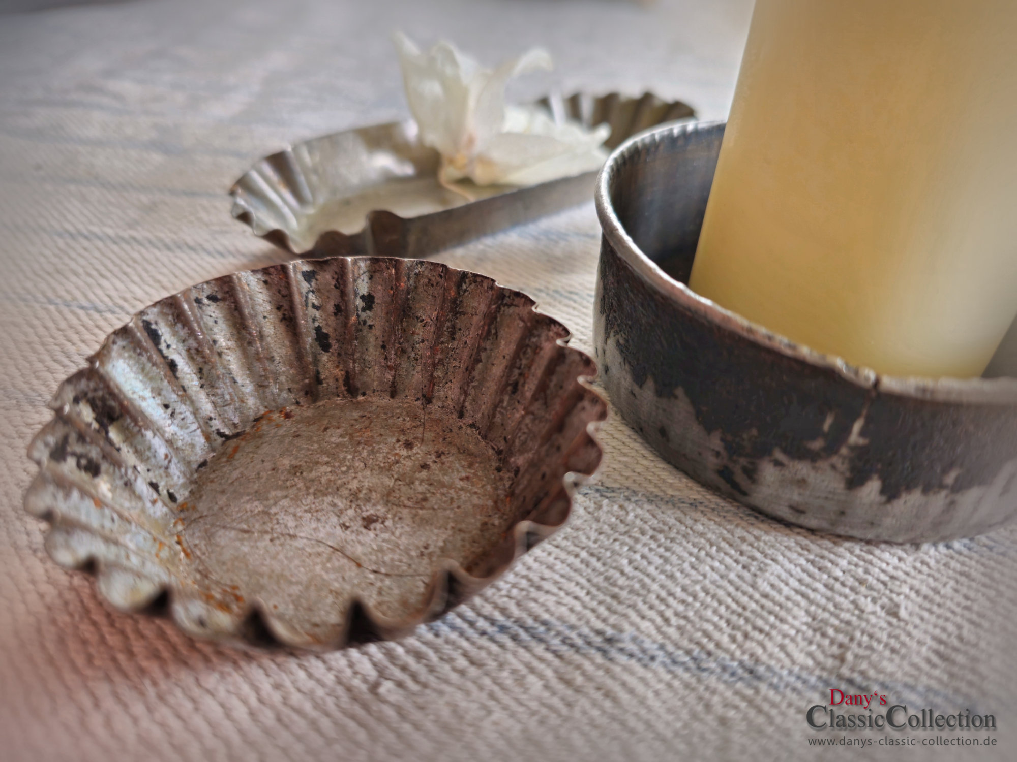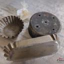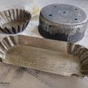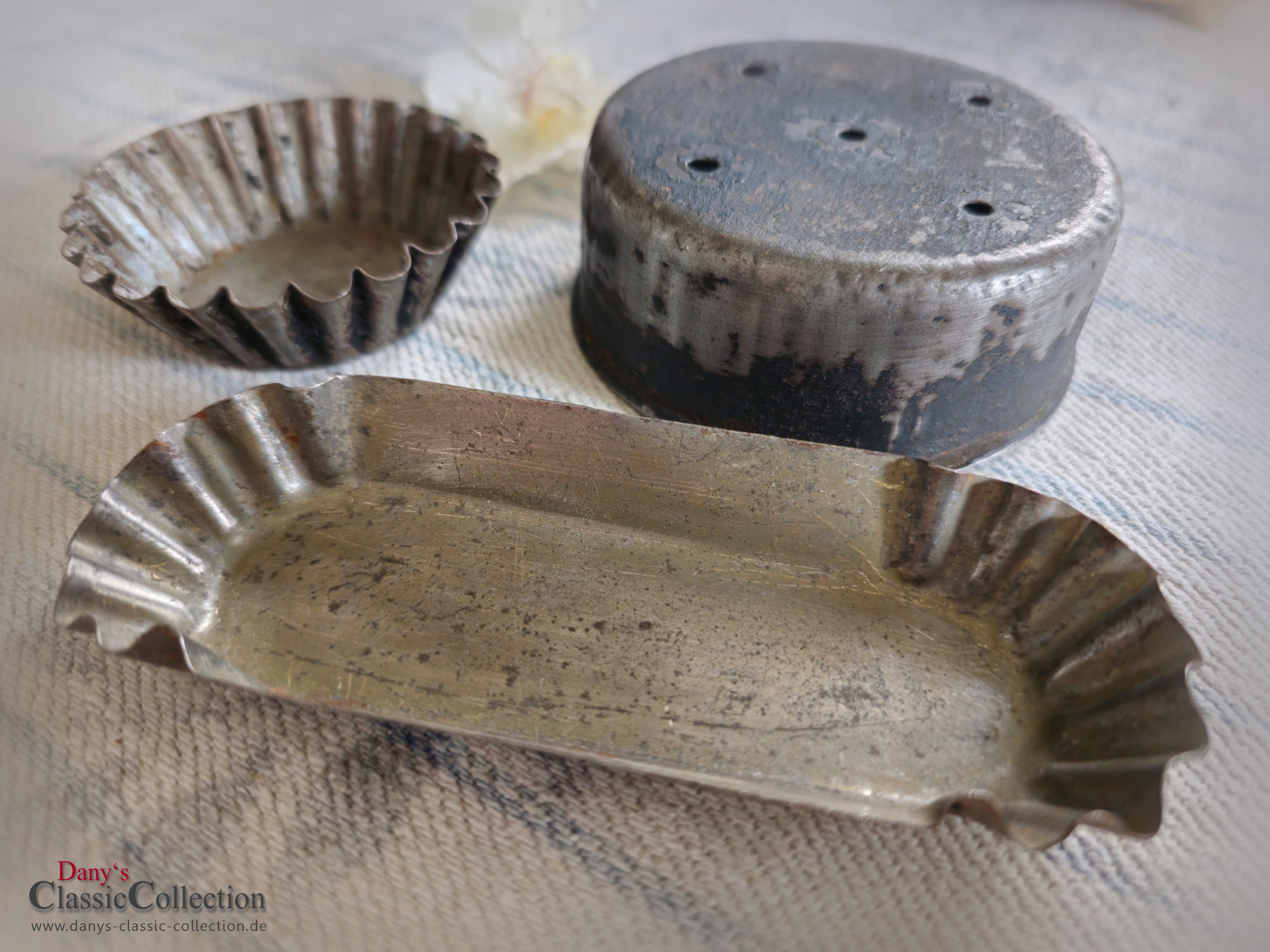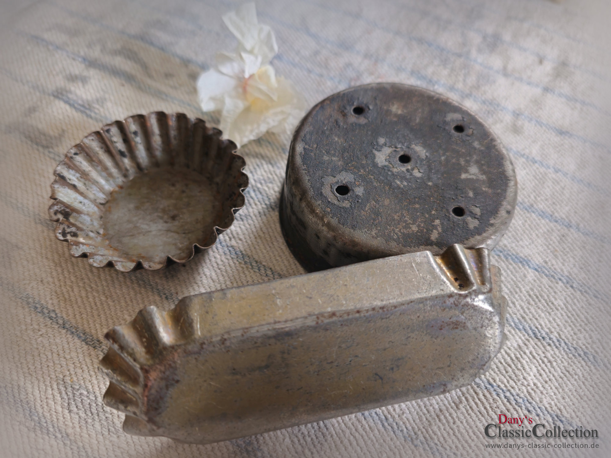 3 verschiedene, alte Backförmchen: Brioche (Muffin), Pommes Schale und uralte Zwieback Form mit zauberhafter Patina hier als SET im Angebot.