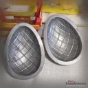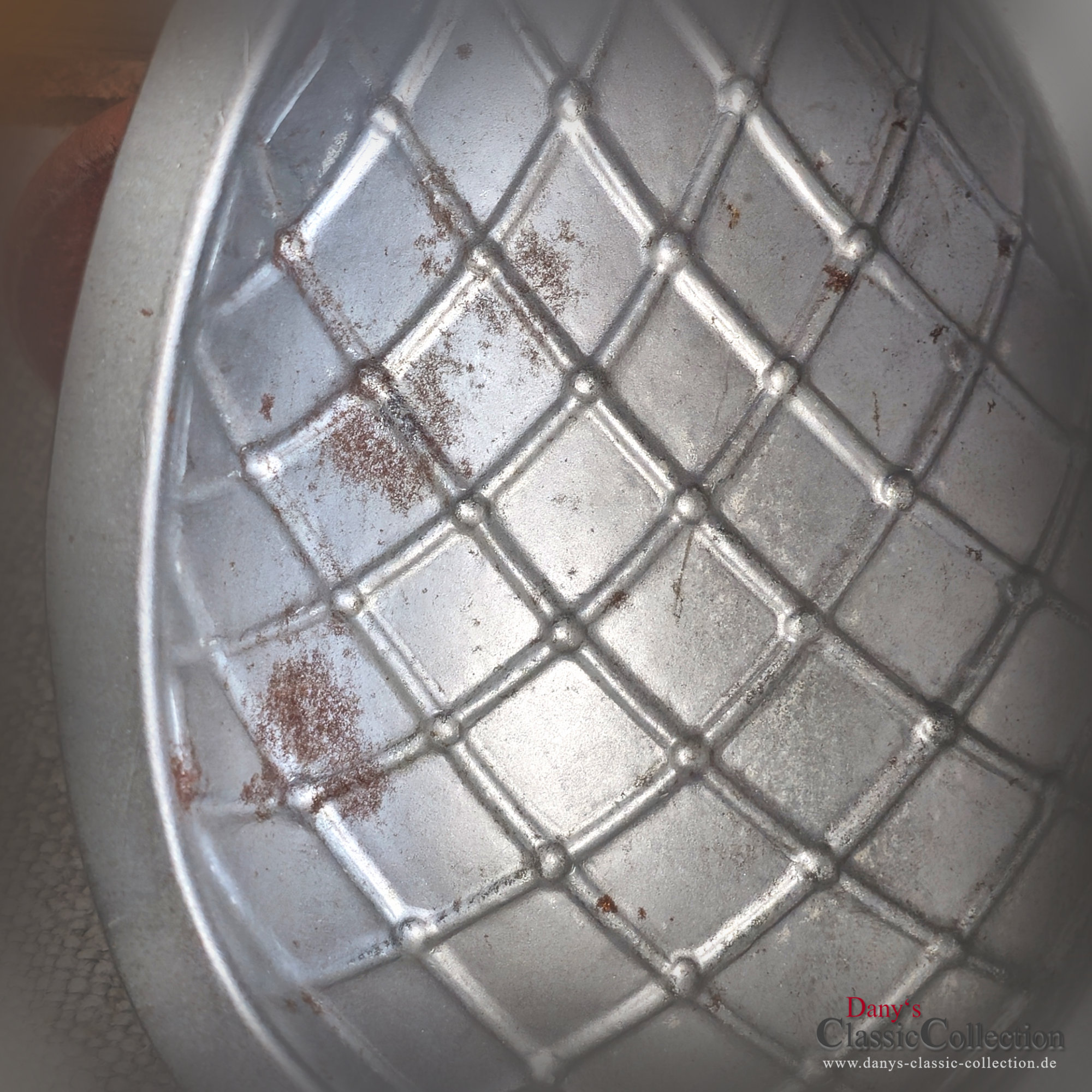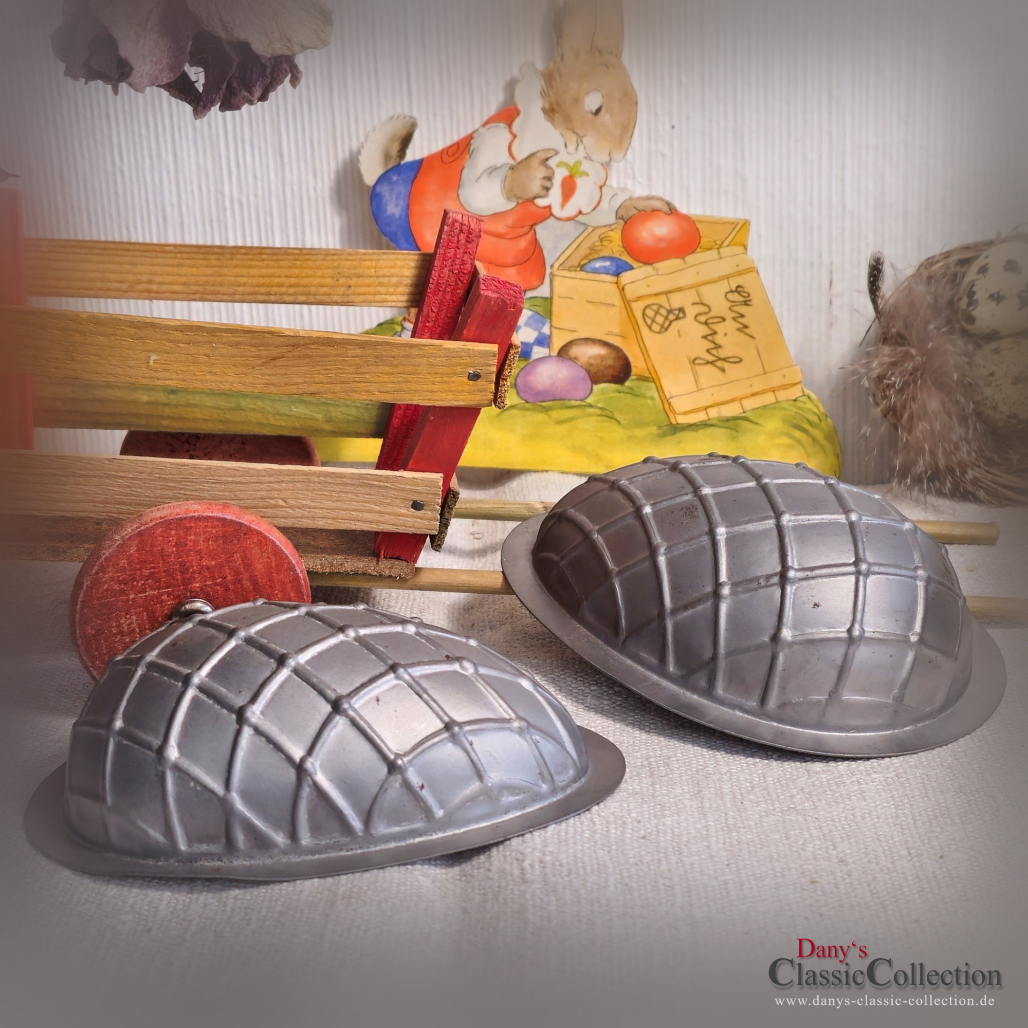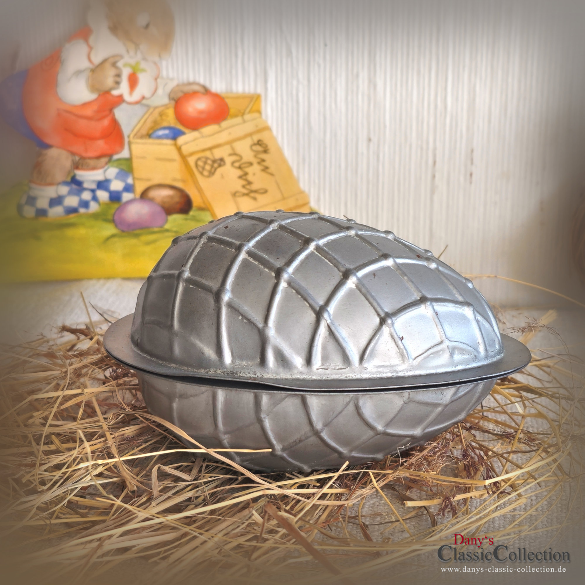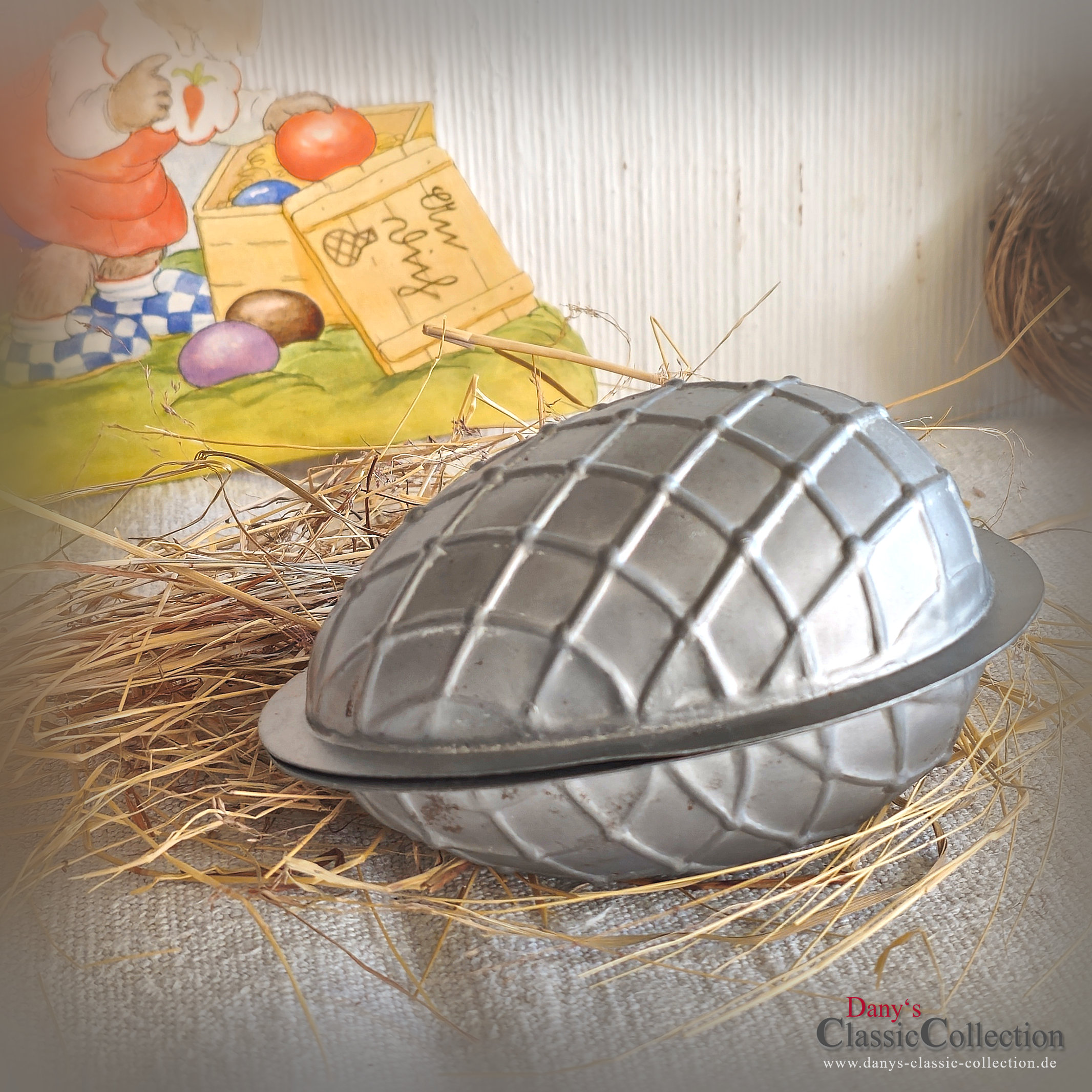 Seltene 2-teilige Schokoladenform, denn dieses Ei trägt seine Gitterprägung obenauf und nicht, wie man es sonst meistens sieht, eingeprägt.