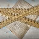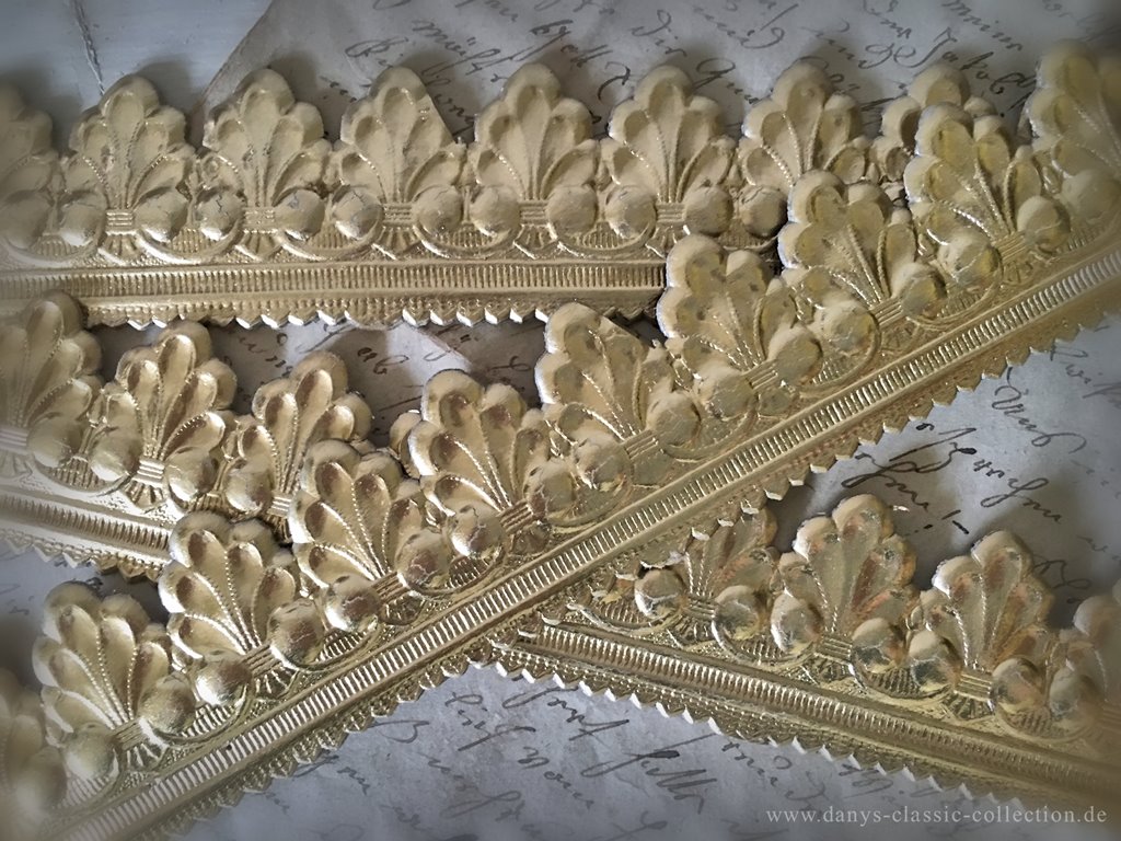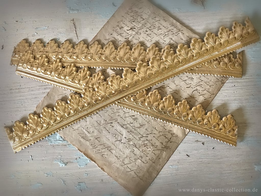 Tolle uralte dreidimensionale Dresdner Pappe, Goldfries. Die Pappe ist für ihr beachtliches Alter in einem bemerkswerten Zustand und ein tolles Dekostück. Früher wurden sie zur Verzierung von Särgen benutzt. Hier stehen zwei Varianten in zwei Längen und Ausführungen zur Verfügung.