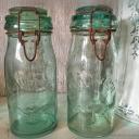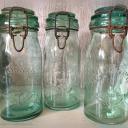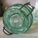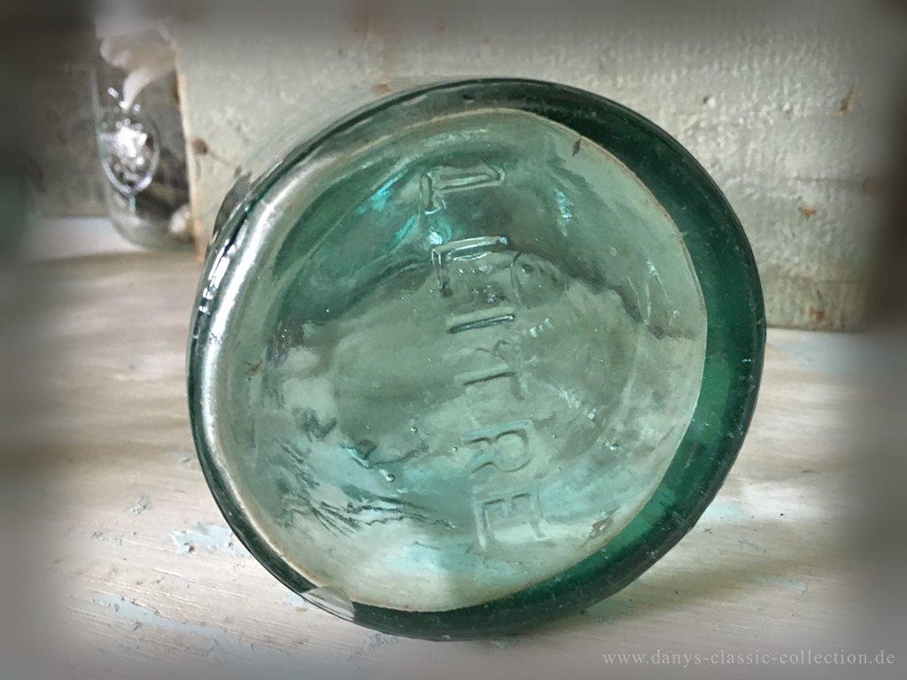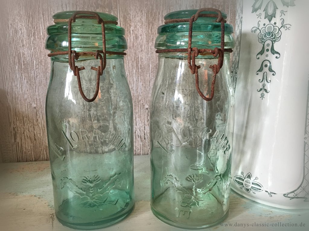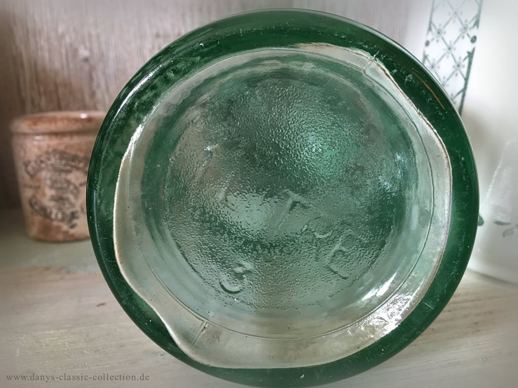 Uraltes dickes Einmachglas "La Lorraine", welches wir auch aus Frankreich mitgebracht haben. Es geht hier um das kleinste der drei gezeigten Gläser. Die kleineren Gläser mit etwas größeren Öffnungen wurden in den 1930er Jahren zum Einmachen von Gemüse genutzt. Die Grüntöne der dicken Gläser sind alle unterschiedlich.