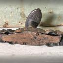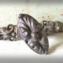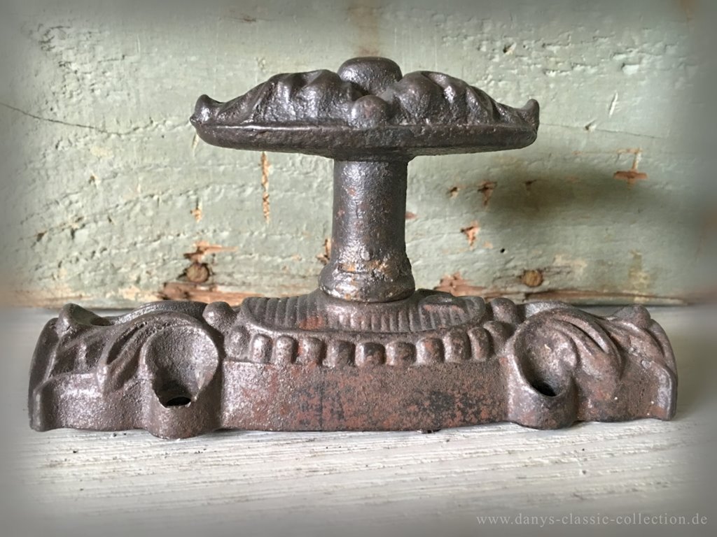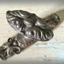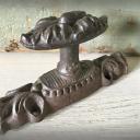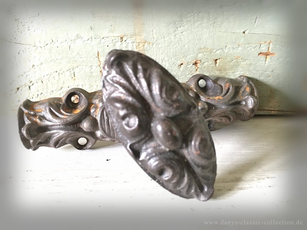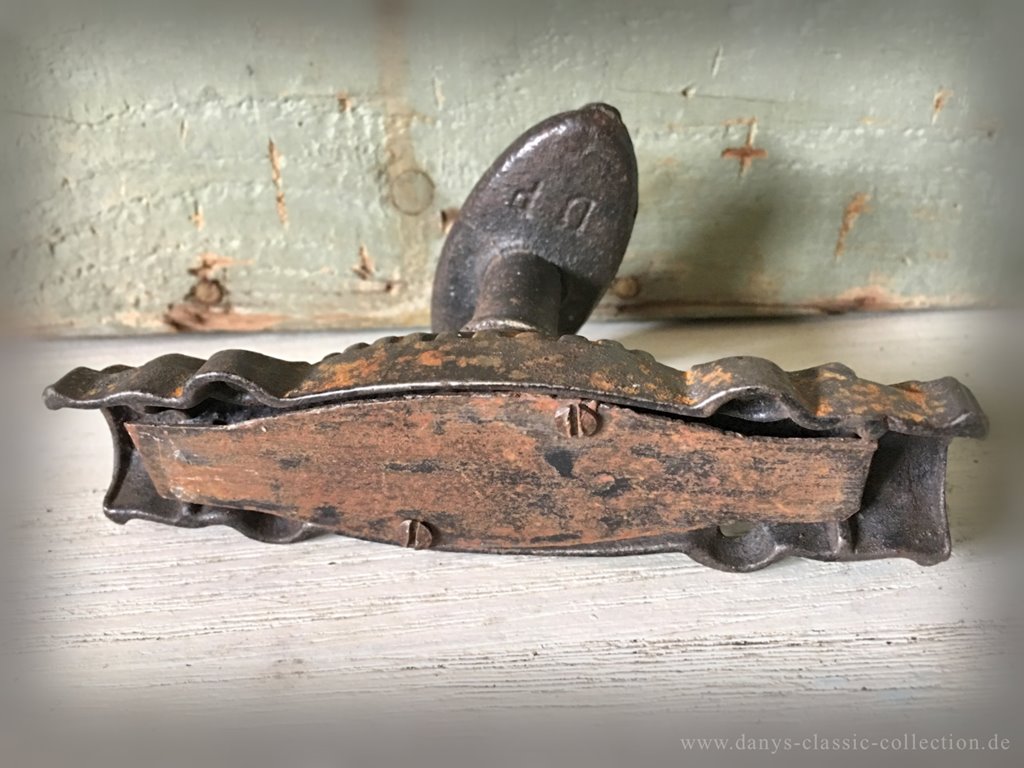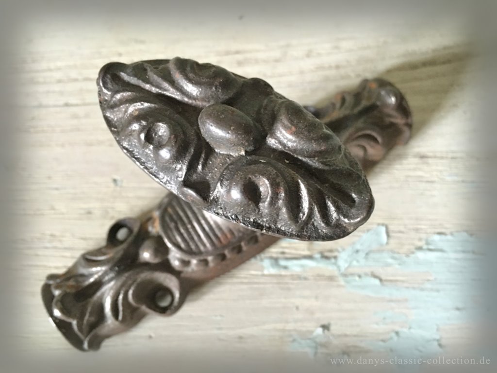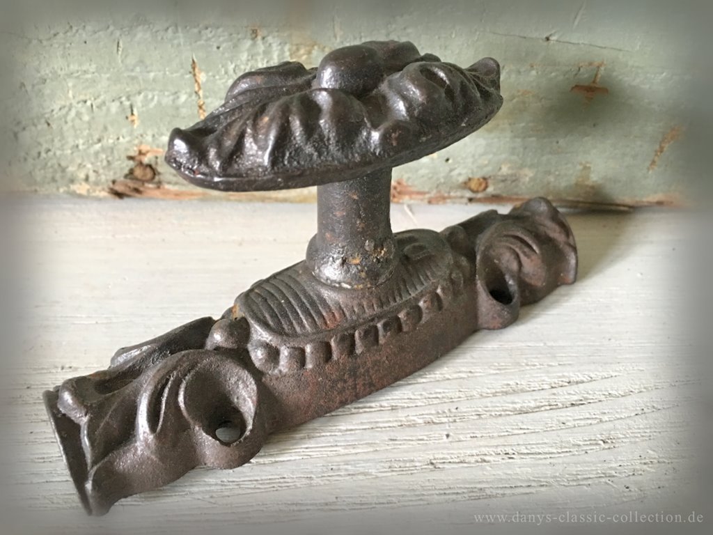 Schwerer Jugendstil Fenstergriff, Olivengriff mit schöner Patina. Der Griff verfügt noch über seine rückwertige Platte und die Schrauben, kann vermutlich dadurch noch verwendet werden. Er besitzt die Markierung D P, was für "Deutsches Patent" stehen könnte. Ein wunderschönes Stück aus vergangenen Tagen.