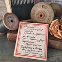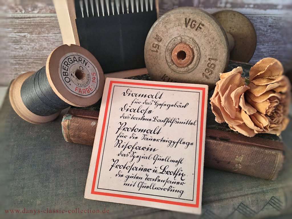 Uraltes Nadelheft mit dekorativer Kurrentschrift als Set mit grauer Garnrolle. Die Heftchen wurden anscheinend von der Diamalt AG, München an ihre Meisterinnen ausgegeben.