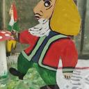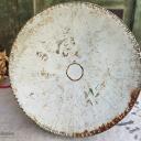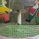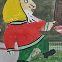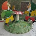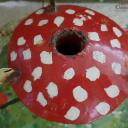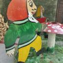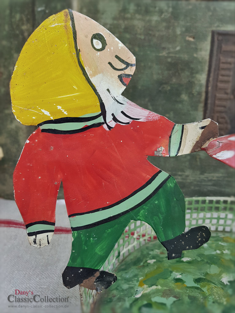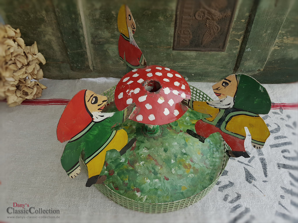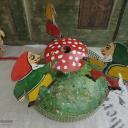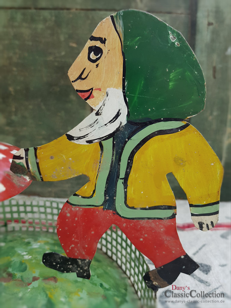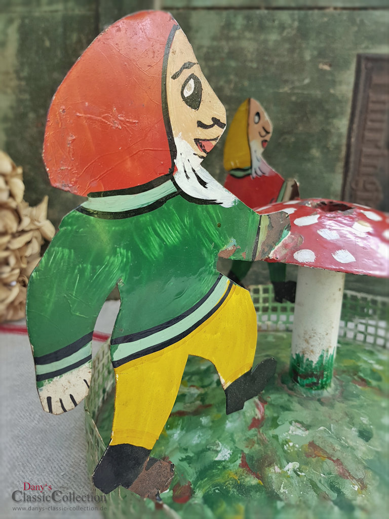 Er zeigt drei bärtige Wichtel an einem Fliegenpilz. Er ist aus stabilem lackiertem Metall und hat einen praktischen Gartenzaun, so dass man ihn noch auslegen und dekorieren kann.