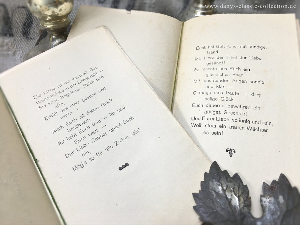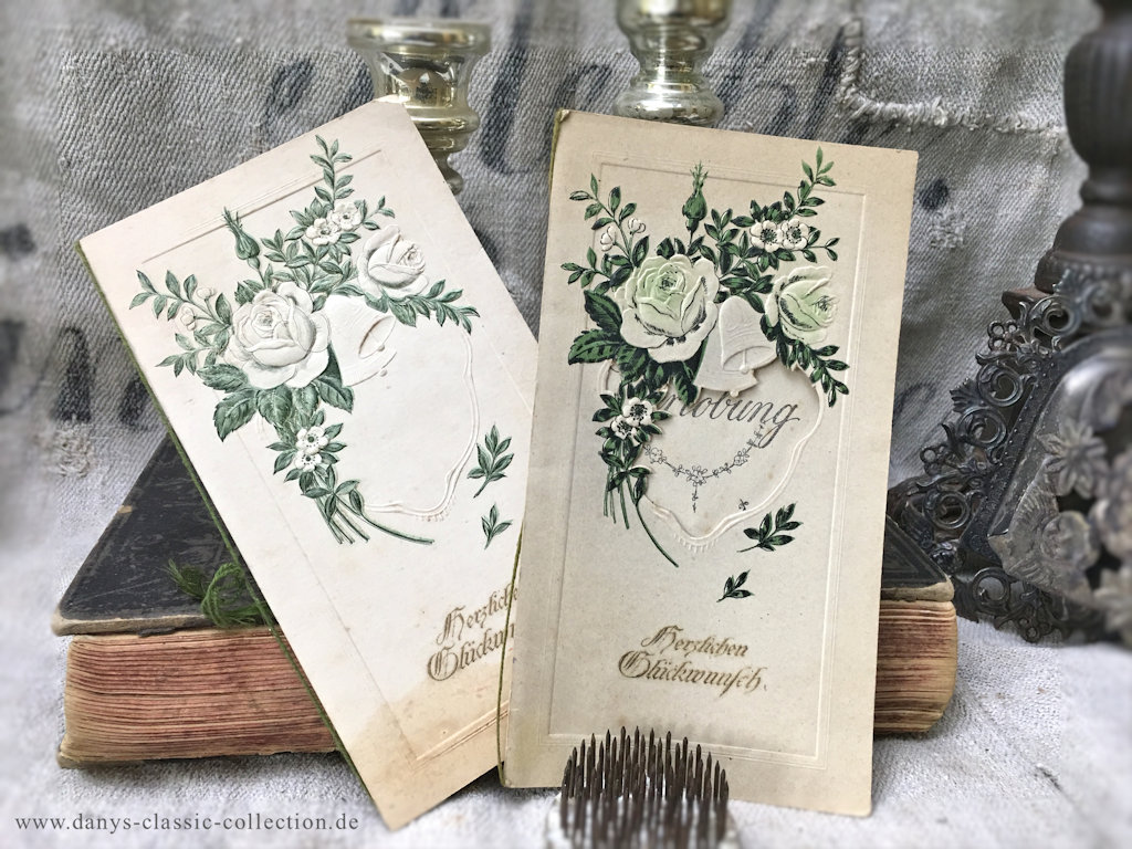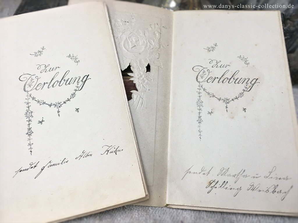Zauberhafte Glückwunschkarten von 1921 zur Verlobung. Sie sind handschriftlich signiert und haben zudem noch einen Einleger mit einem vorgedruckten Spruch.