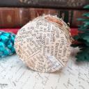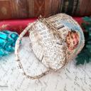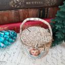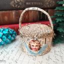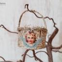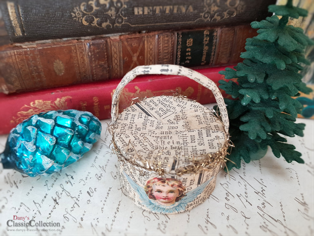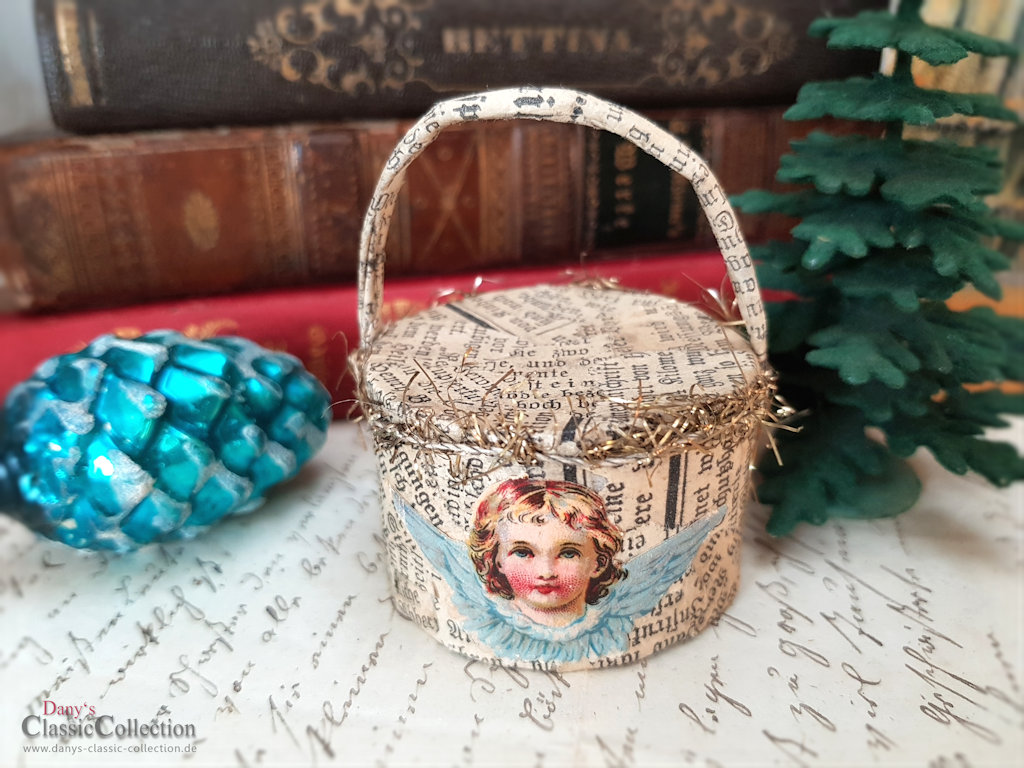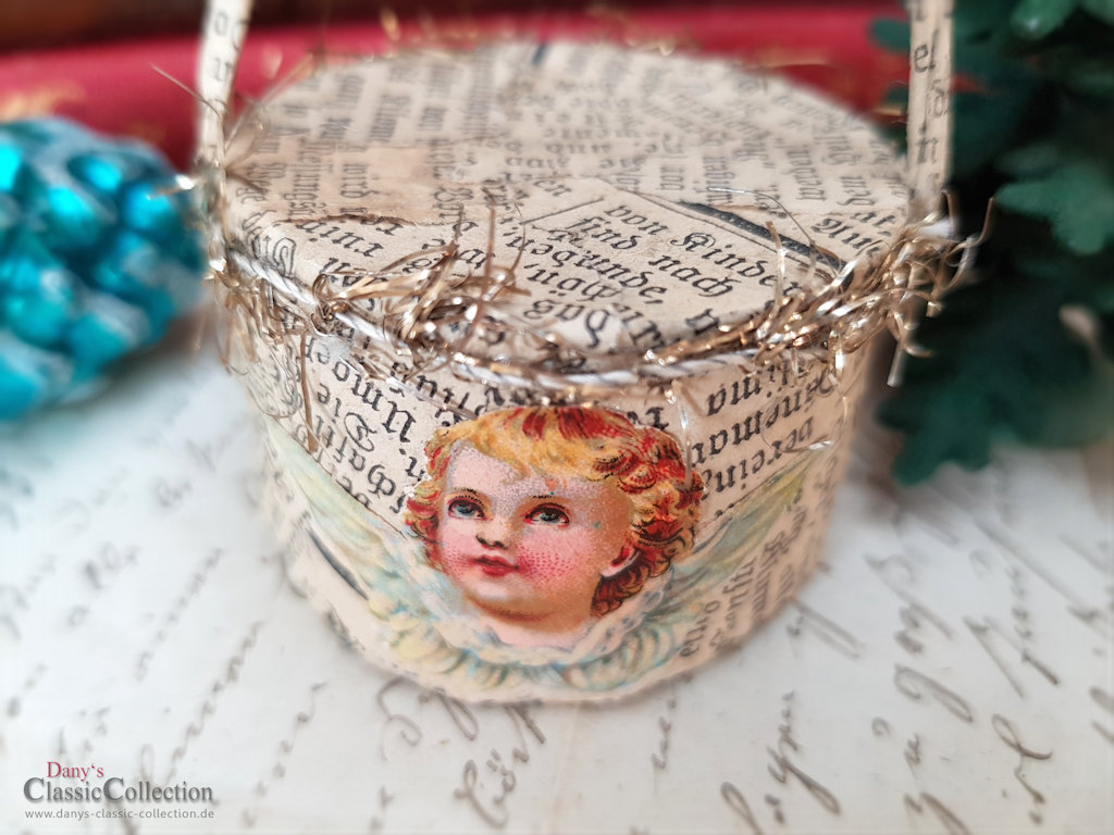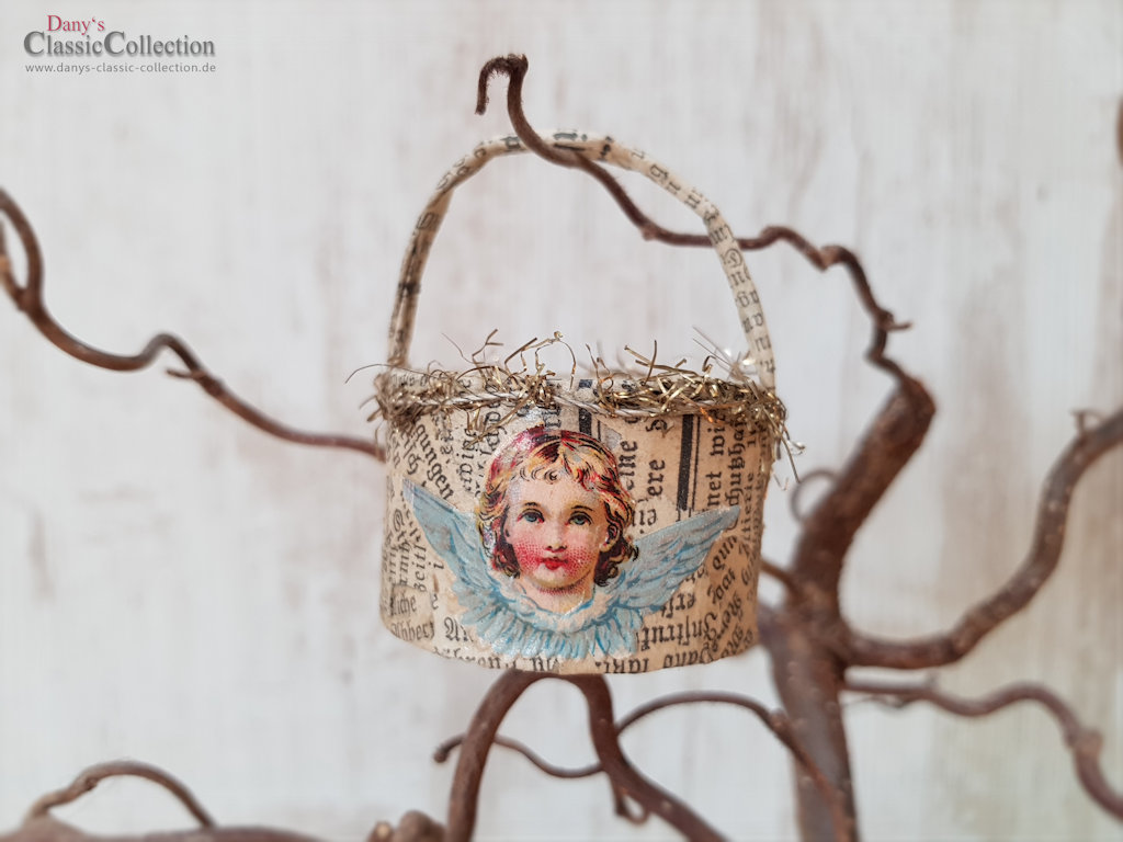 Entzückender Christbaumschmuck, Körbchen decoupiert mit alten Papier und verziert mit Tinsel. Vorder- und Rückseite schmücken hübsche alte Glanzbildchen.